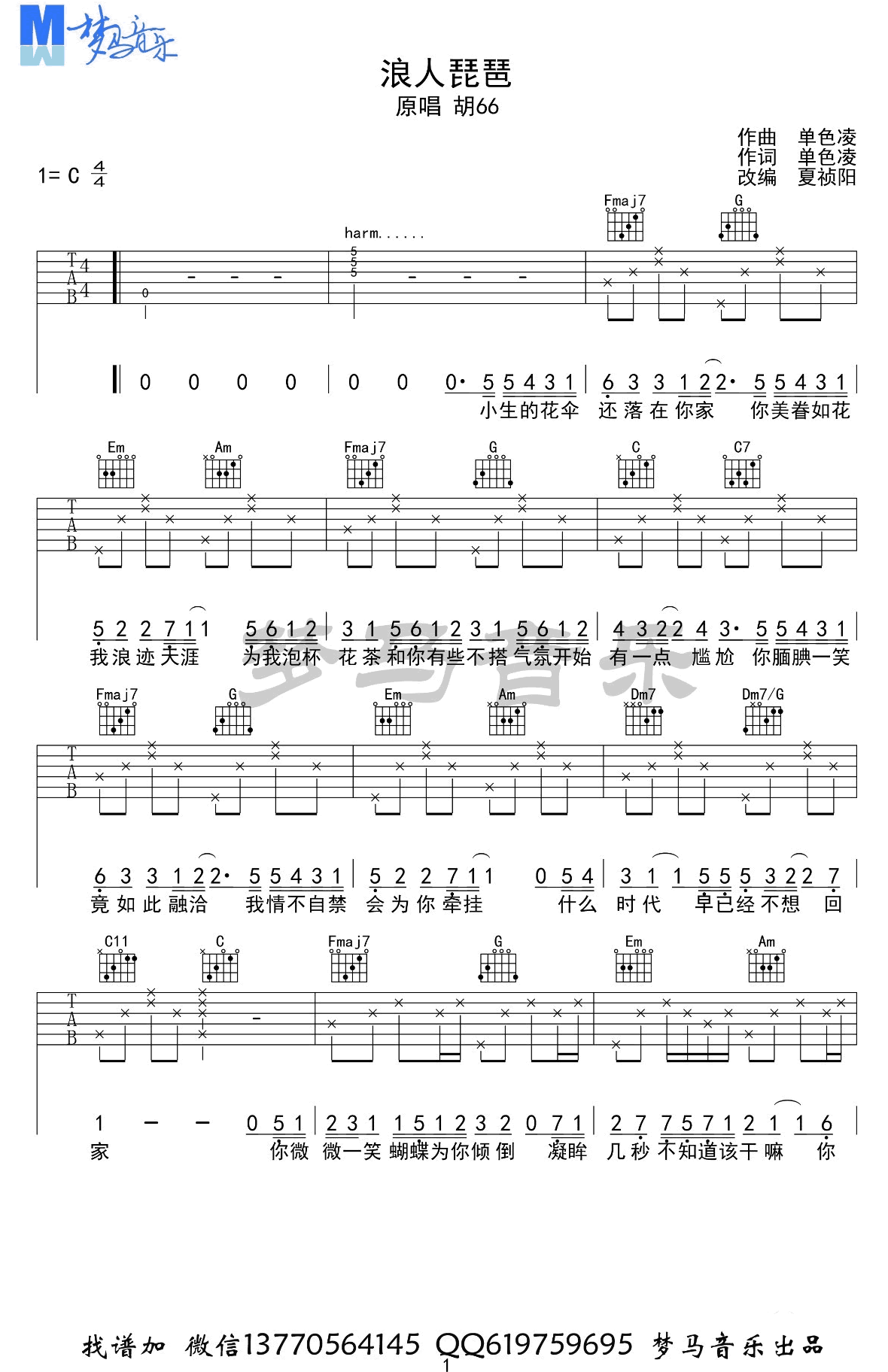 曲谱介绍: 浪人琵琶吉他谱,胡66演唱,C调指法,高清弹唱谱,一首网上新火起来的歌曲,热度非常高,浪人琵琶六线谱,四张图片谱例,感谢梦马音乐出品,夏祯阳老师根据自己理解来改编了这首歌。老师讲解:歌曲弹唱视频中,由搭档蛋蛋女声原调演唱。老师负责唱原曲的男声部分。整首歌以16分音符为主,弹奏速度较快,采用常用的弹扫指法,并无其它难点,适合琴友们弹唱。 《浪人琵琶》弹唱演示视频