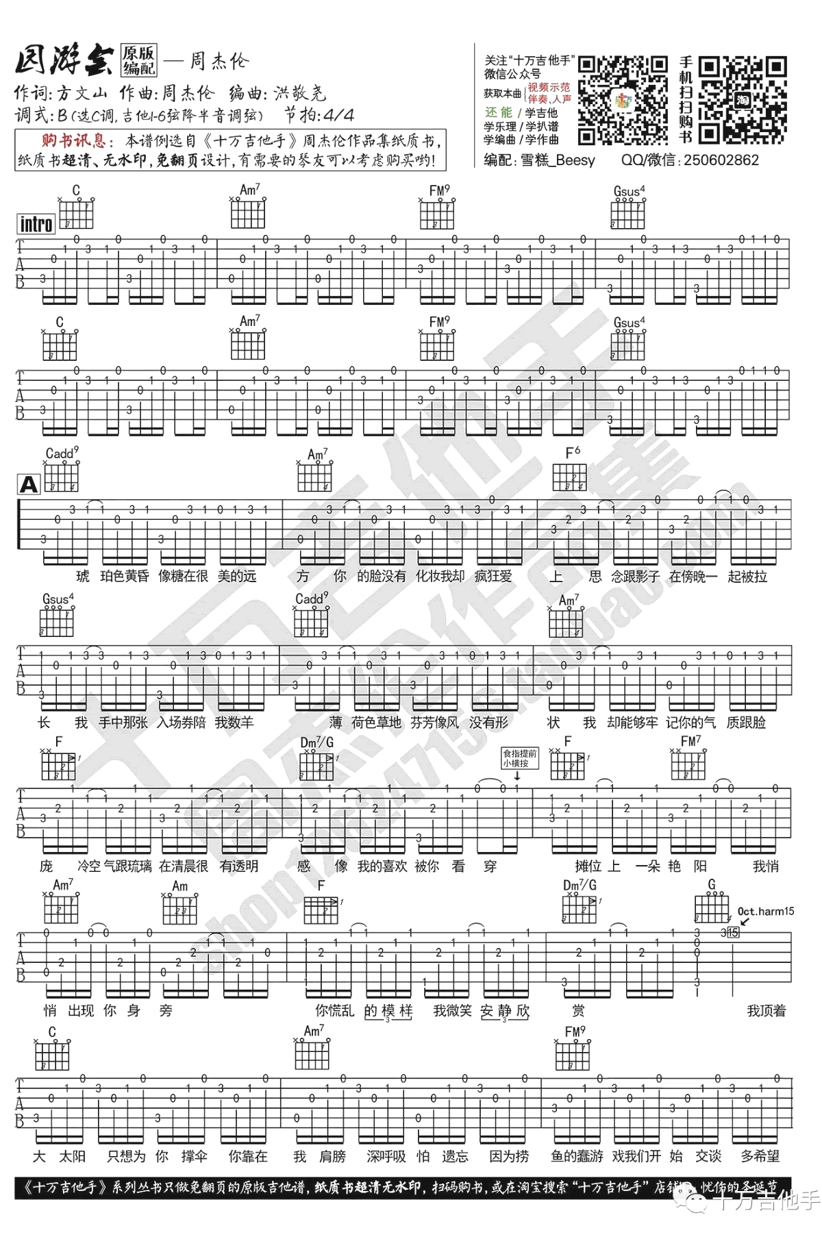 曲谱介绍: 周杰伦《园游会》吉他谱,原调B,选调C,吉他1-6弦降半音调弦,原版编配,游园会六线谱,吉他弹唱图片谱,感谢十万吉他手出品。如果你是原版谱爱好者,请你考虑购买《十万吉他手》系列的纸质书,支持作者。纸质书超清、无水印,免翻页。这是周杰伦《七里香》专辑中的的一首甜美温馨曲风的歌曲,唱出恋爱中少男少女的心事。和爱慕的人一起逛园游会,一起玩游戏,期待着“话题不断园游会永不打烊”。随谱附上雪糕老师为琴友们带来的《游园会》吉他弹唱视频,大家参照示范演示练习。