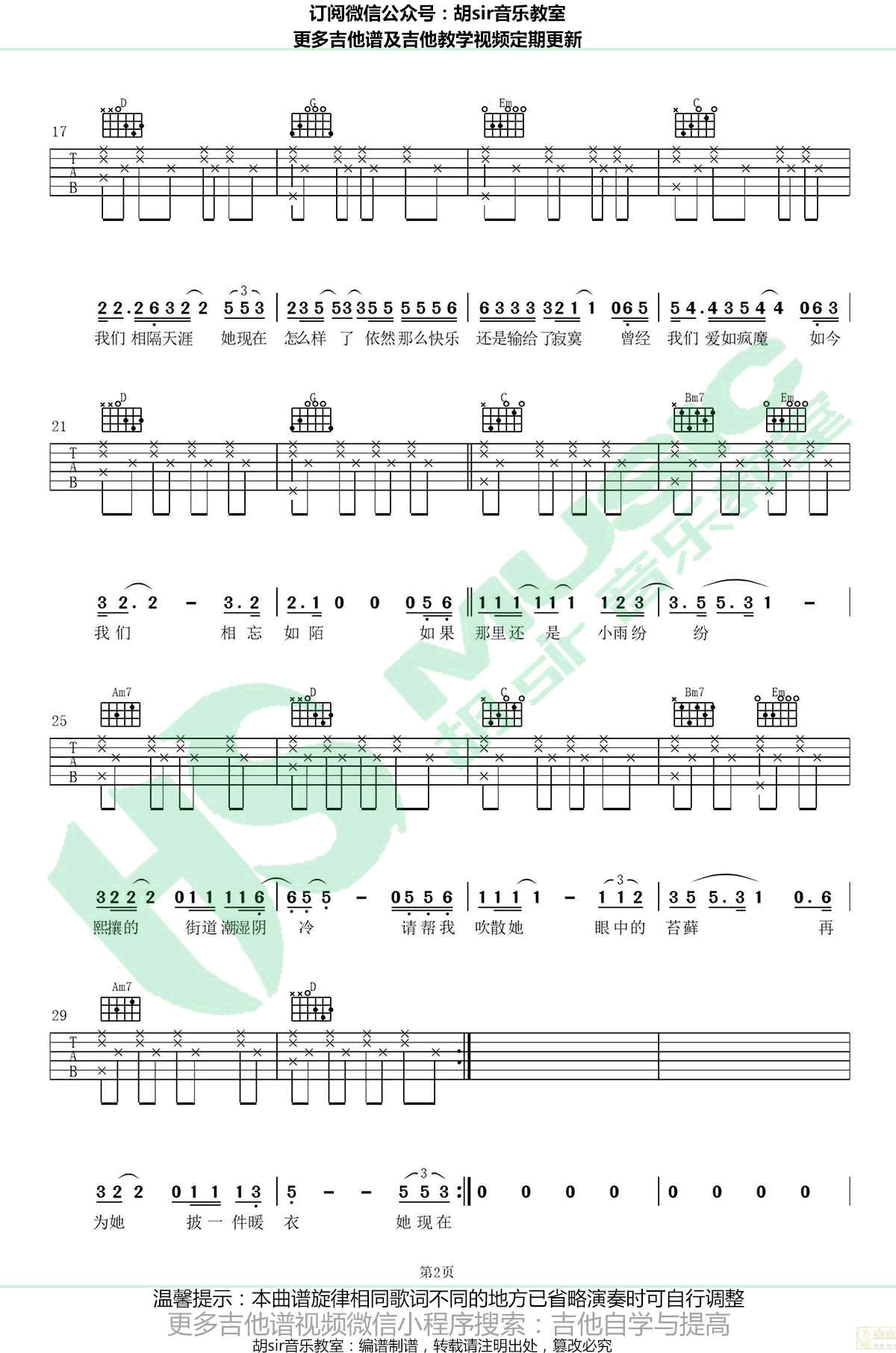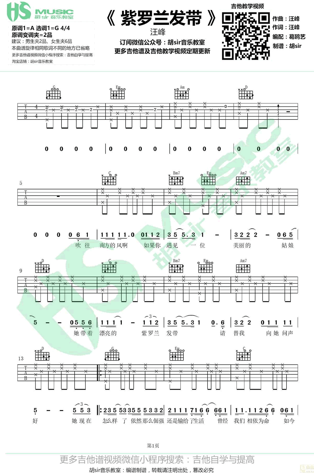 曲谱介绍: 汪峰《紫罗兰发带》吉他谱,选用G调指法,男生变调夹夹二品为原调,女生建议夹六品。紫罗兰发带六线谱,高清弹唱图片谱,感谢胡sir音乐教室编配出品,欢迎扫码关注一起学习91吉他谱。 一首画面感极强很有意境的情歌,回忆了一位带着紫罗兰发带的姑娘,娓娓诉说了一段曾经的美好。物是人非,世事变迁。如今都已变了模样。就像是歌中唱到的,曾经我们爱如疯魔,如今我们相忘如陌。