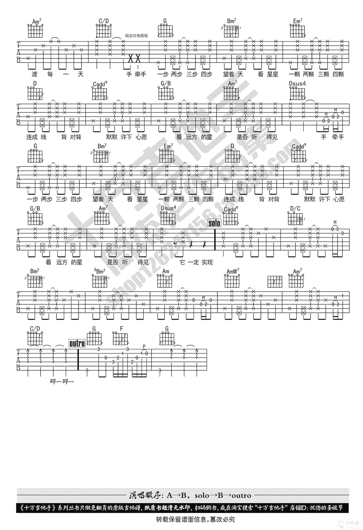 曲谱介绍: 《星晴》吉他谱,G调指法,原版编配,周杰伦的一首经典老歌,星晴六线谱,高清图片弹唱谱,感谢十万吉他手出品,91吉他谱网站上传。雪糕老师视频弹奏,把1-6弦做了降半音调弦,因为原G调太高了,高音上不去,故而降音调弦。喜欢这首歌曲的琴友可以配合曲谱和视频演示学习。