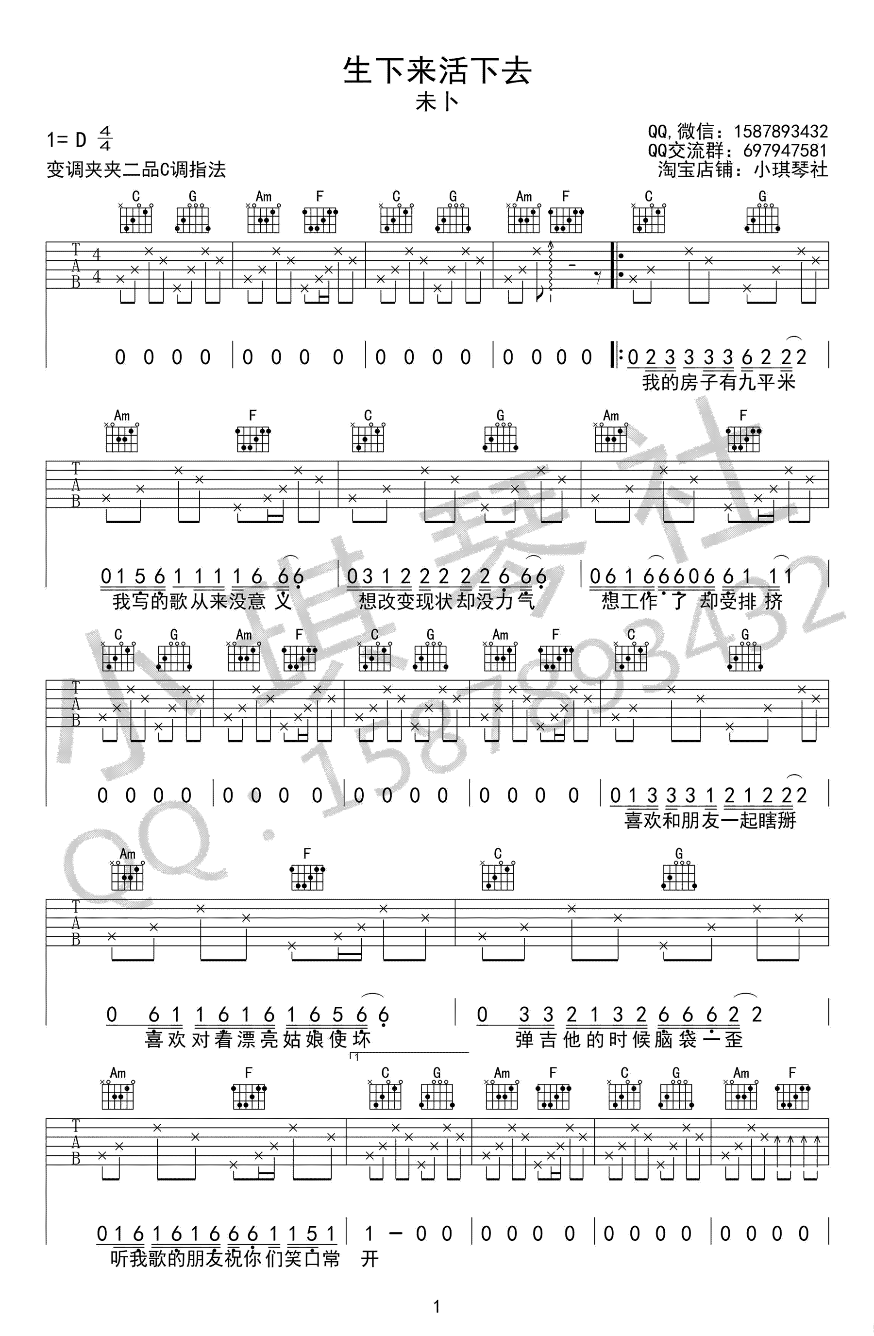 曲谱介绍: 未卜《生下来活下去》吉他谱,原调D,变调夹夹第二品,选用C调指法编配,生下来活下去六线谱,高清弹唱图片谱,小琪琴社出品,91吉他谱网站上传。人,生下来活下去,如此简单如此难。