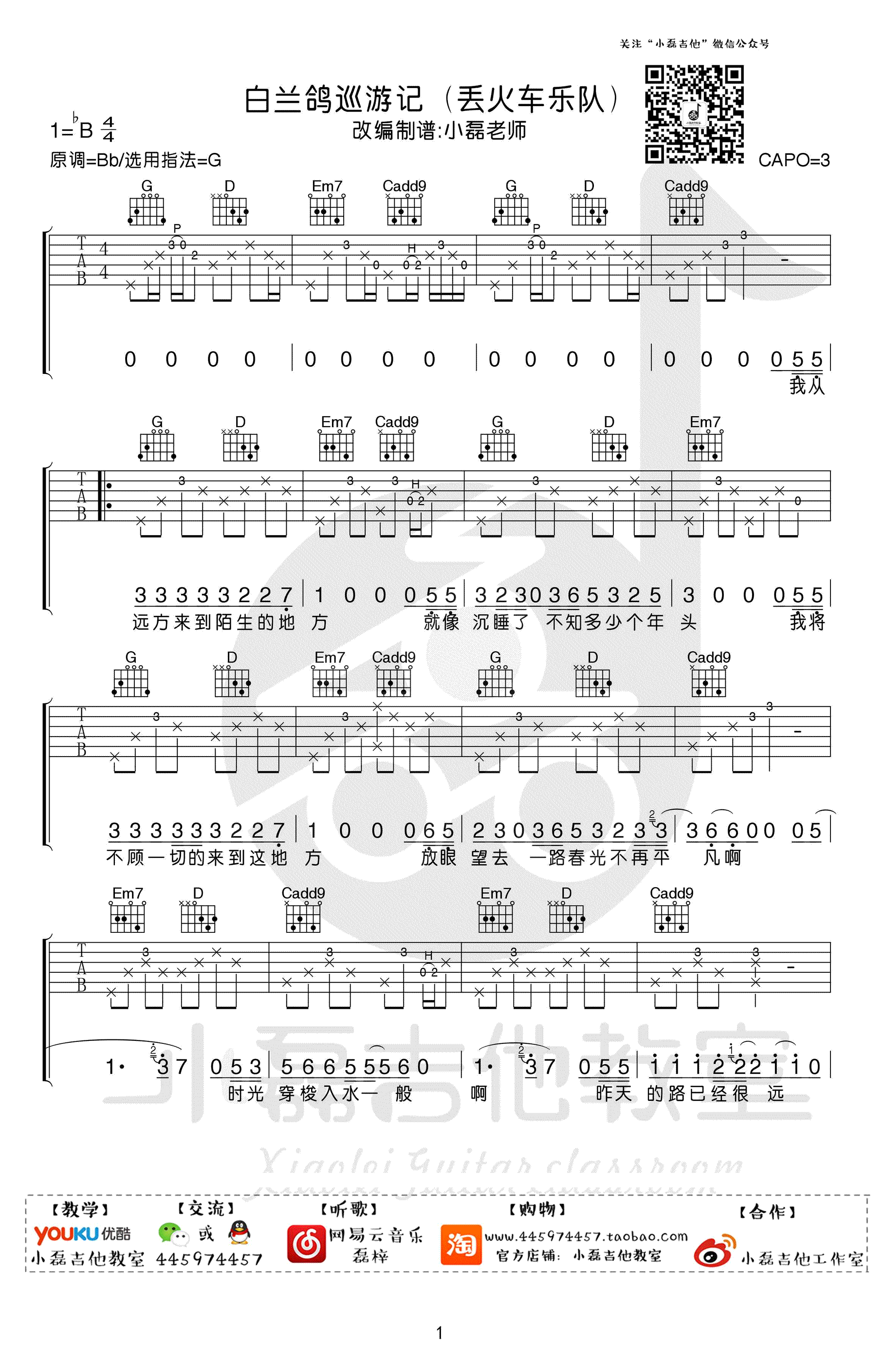 曲谱介绍: 白兰鸽巡游记吉他谱,原调Bb,选用G调指法,变调夹夹三品,丢火车乐队演唱的《白兰鸽巡游记》六线谱,高清图片弹唱谱,感谢小磊吉他编配出品,配套教学视频随谱附上。喜欢这种民谣轻轻缓缓而且很有画面感的声音,适合一个人的时候安静的听,轻慢的弹唱,简单的旋律勾勒出简约的人生风景。在歌声中追寻过往。一声声白兰鸽,是过去、是遗憾、是追不回来的纯真,还是信仰。