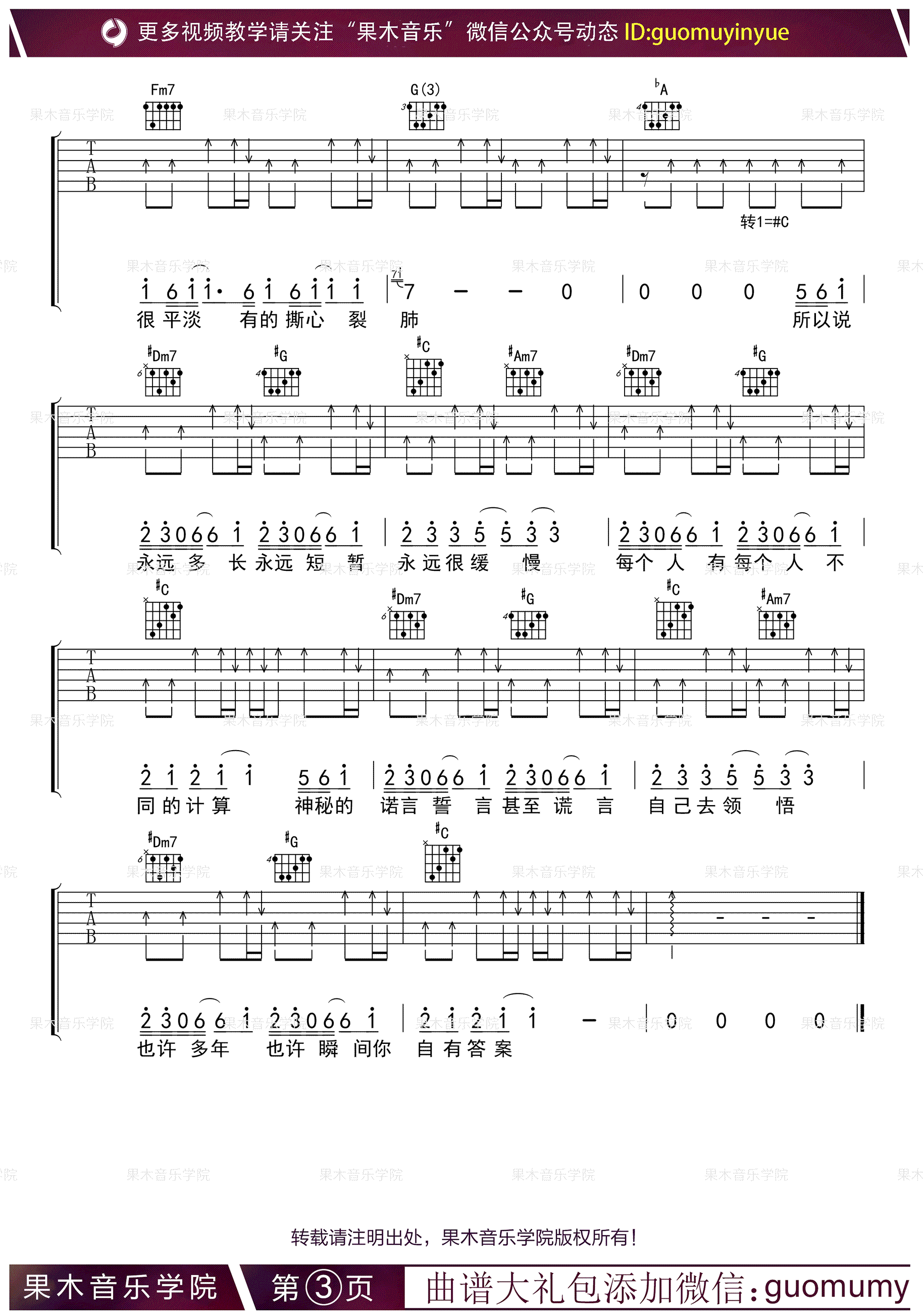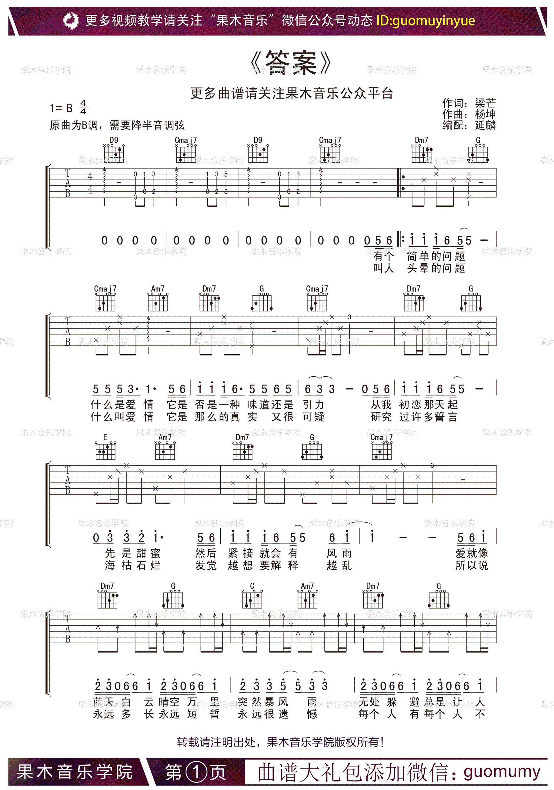 曲谱介绍: 答案吉他谱,简单版,原曲为B调,需要降半音调弦,杨坤郭采洁演唱的一首男女对唱歌曲,如今红遍网络视频平台,成为最热门的抖音歌曲。答案吉他弹唱谱,高清图片六线谱,感谢果木音乐编配出品,91吉他谱网站上传。