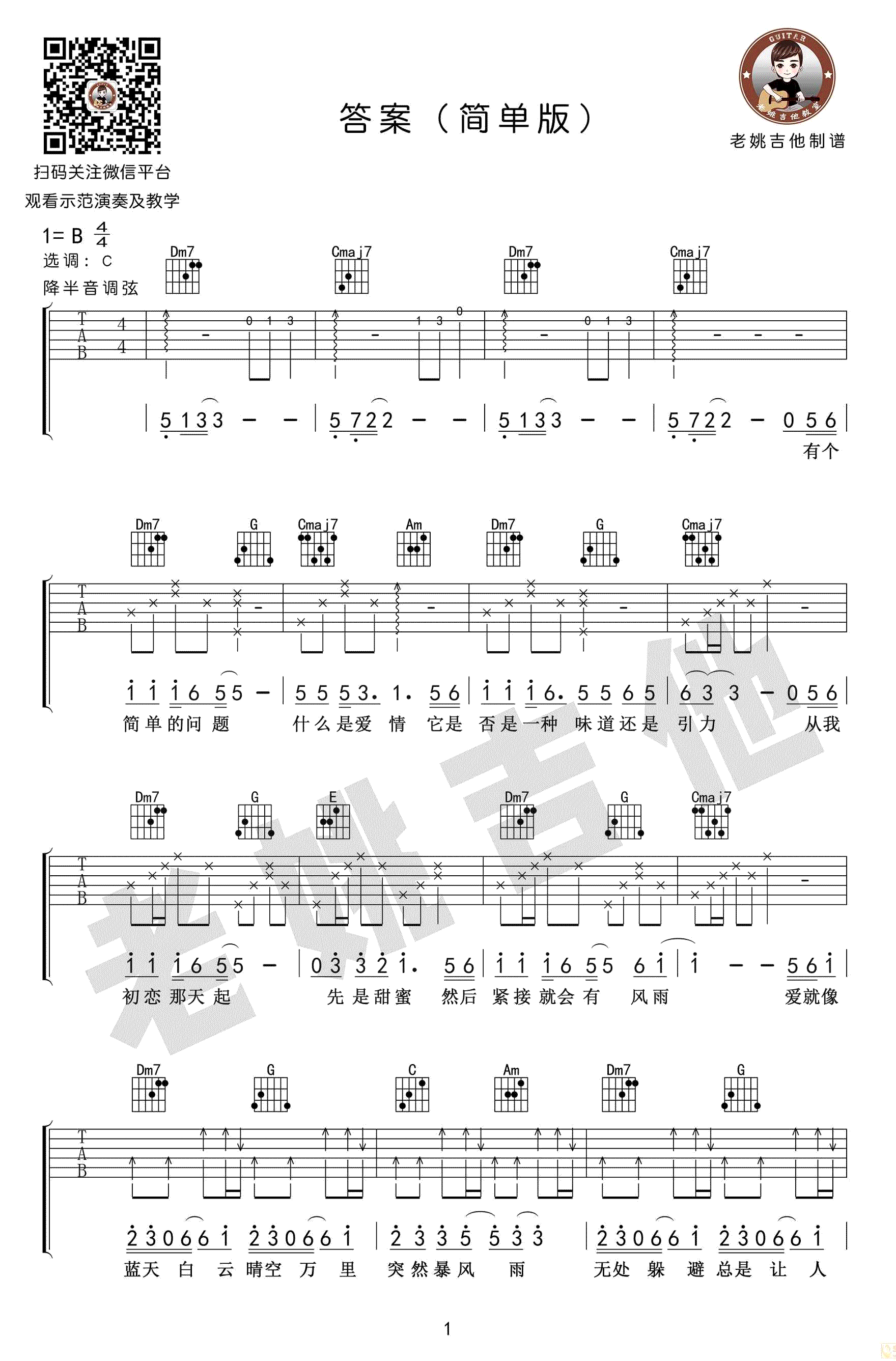 曲谱介绍: 答案吉他谱,简单版弹唱谱,一首好听的男女合唱歌曲,原唱是杨坤郭采洁,随着抖音的短视频热播,这首多年前的歌曲火了起来。答案吉他弹唱谱,降半音调弦,选用C调指法编配,感谢老姚吉他出品。 爱就像蓝天白云,晴空万里,突然暴风雨,无处躲避,总是让人始料不及。R&B的一首慢板曲风的旋律,将爱情的纠结和感受,通过轻松的调侃与哼唱演绎出来。