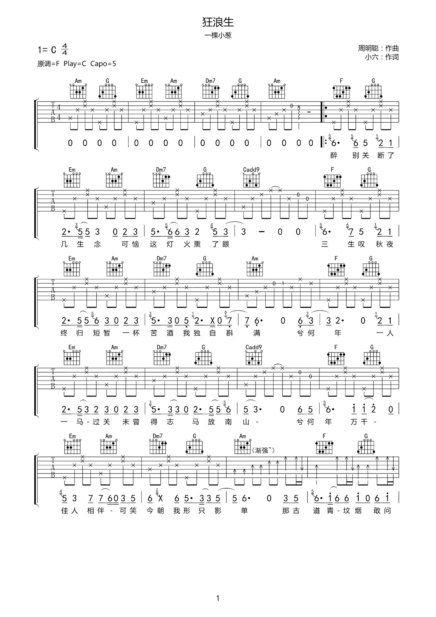 曲谱介绍: 一棵小葱《狂浪生》吉他谱_C调吉他弹唱谱