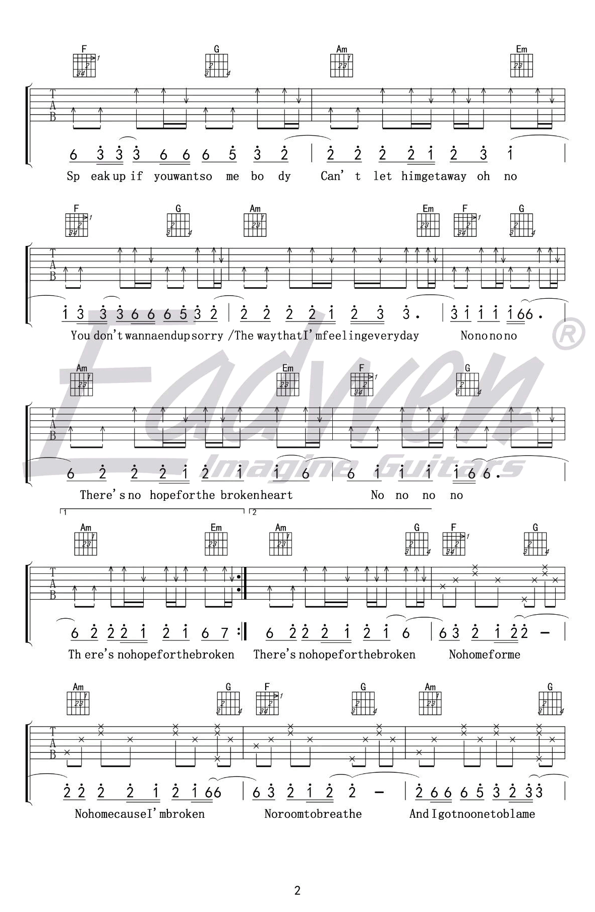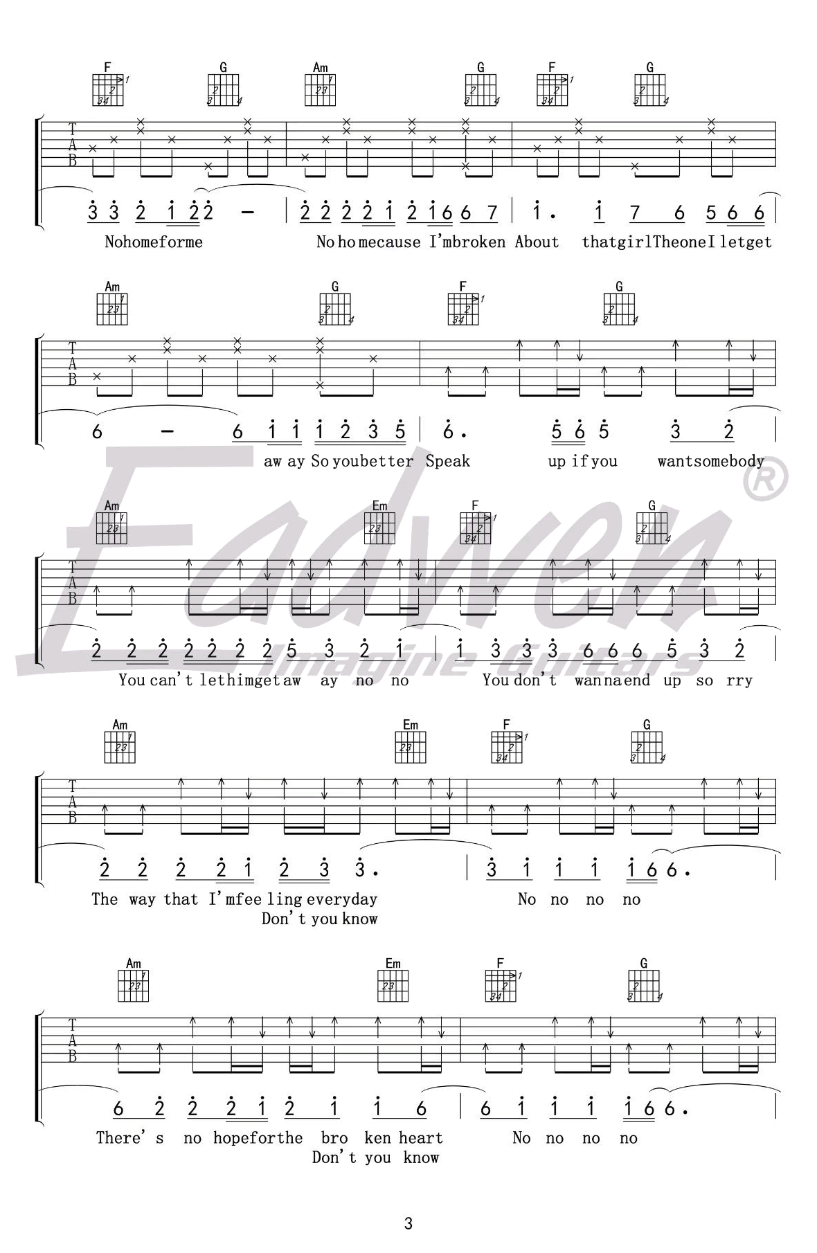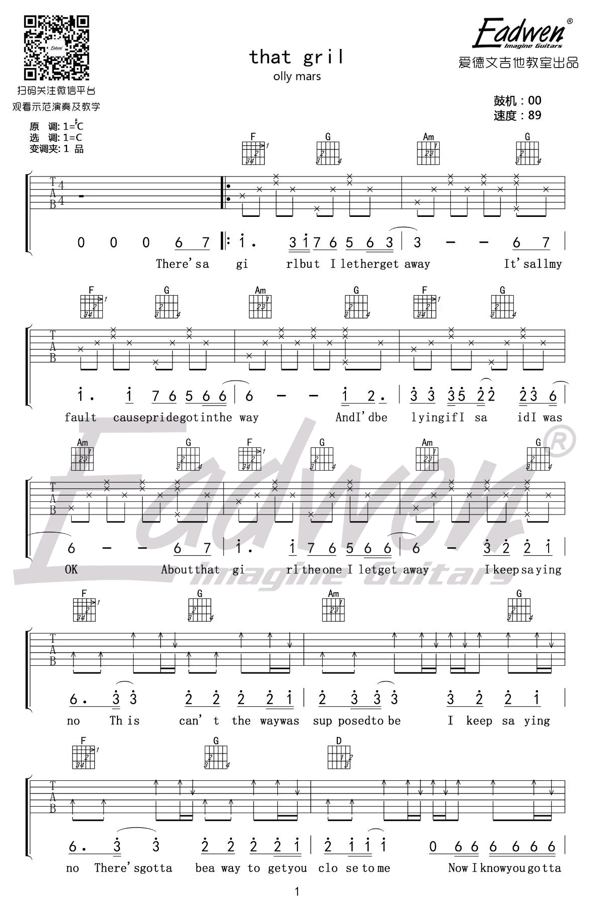 曲谱介绍: Olly mars《That Girl》吉他谱,最近网络上很火的一首英文歌曲,原调#C,选用C调指法,变调夹夹一品,That Girl吉他六线谱,高清图片谱四张谱例,感谢爱德文吉他教室出品。随谱附上陈佰老师为大家带来的配套吉他教学视频,琴友们跟随教学示范学习。 《That Girl》吉他视频教学