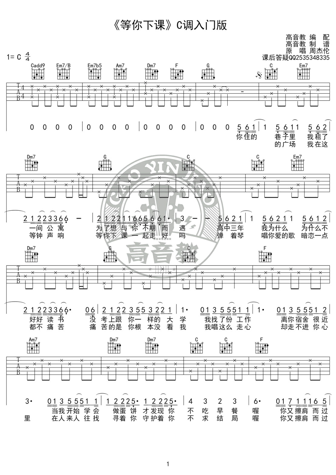 曲谱介绍: 等你下课吉他谱,C调入门版,高清弹唱谱,周杰伦的一首清新校园风情歌。《等你下课》六线谱,男生变调夹5-6品,女生不用夹。感谢高音教编配出品,91吉他谱网站推荐上传。吉他弹唱教学由张小迪老师讲解,琴友们可以参照视频练习。