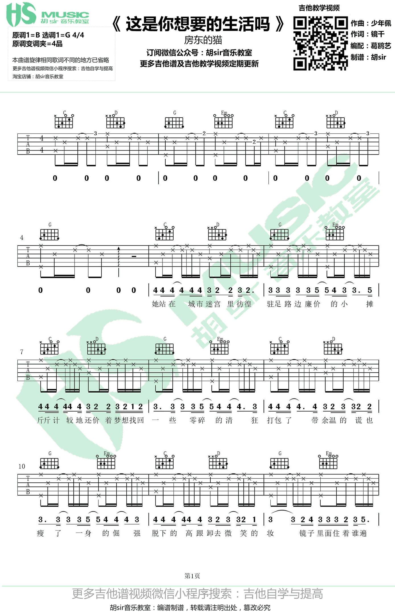 曲谱介绍: 房东的猫《这是你想要的生活吗》吉他谱,原调B,选调G,原调变调夹夹第四品。这是你想要的生活吗吉他六线谱,高清图片谱。感谢胡sir音乐教室编配出品,91吉他谱网站上传分享。 干净的声音,温柔的歌曲,今天带你走进房东的猫,走进《这是你想要的生活吗》这首歌。这是一首关于生活的歌,它就和生活一样平淡而真实,生活或许日复一日而平淡乏味,却也有了平凡可贵的真挚真情。