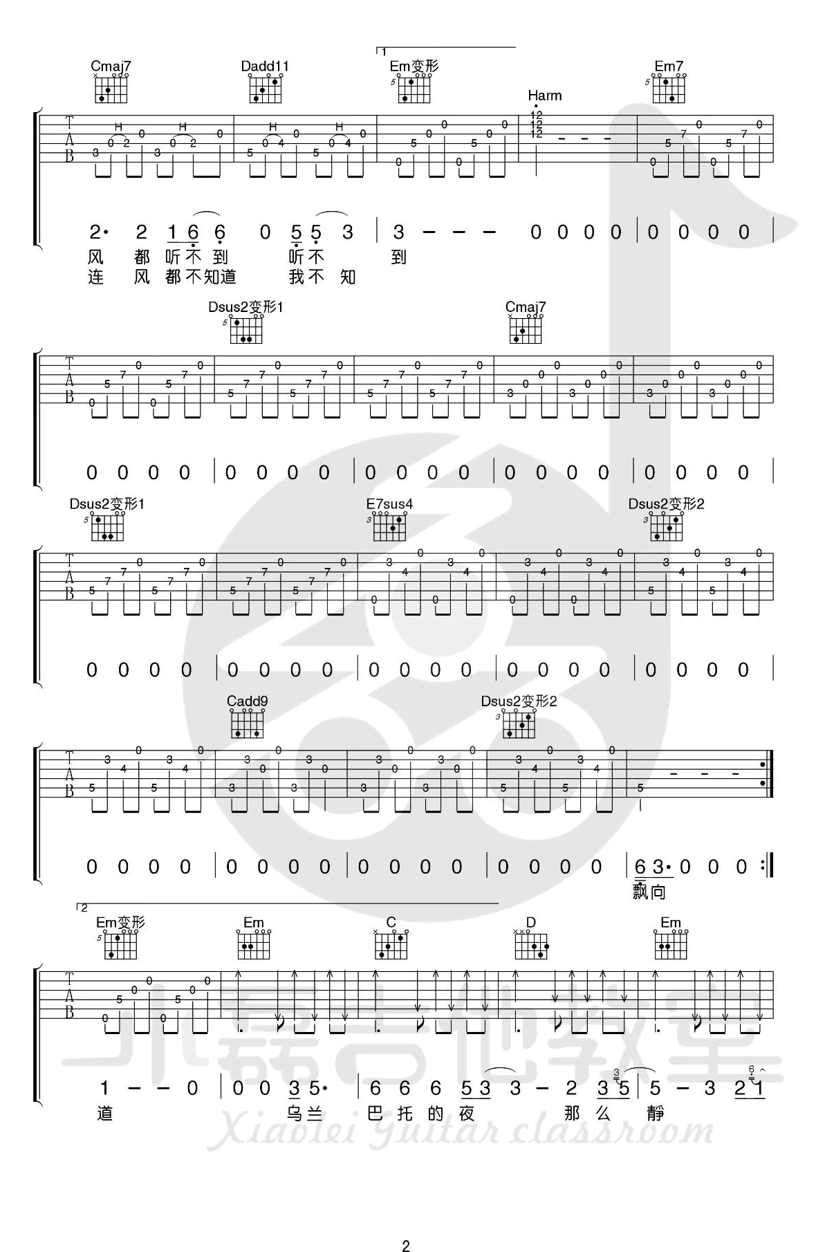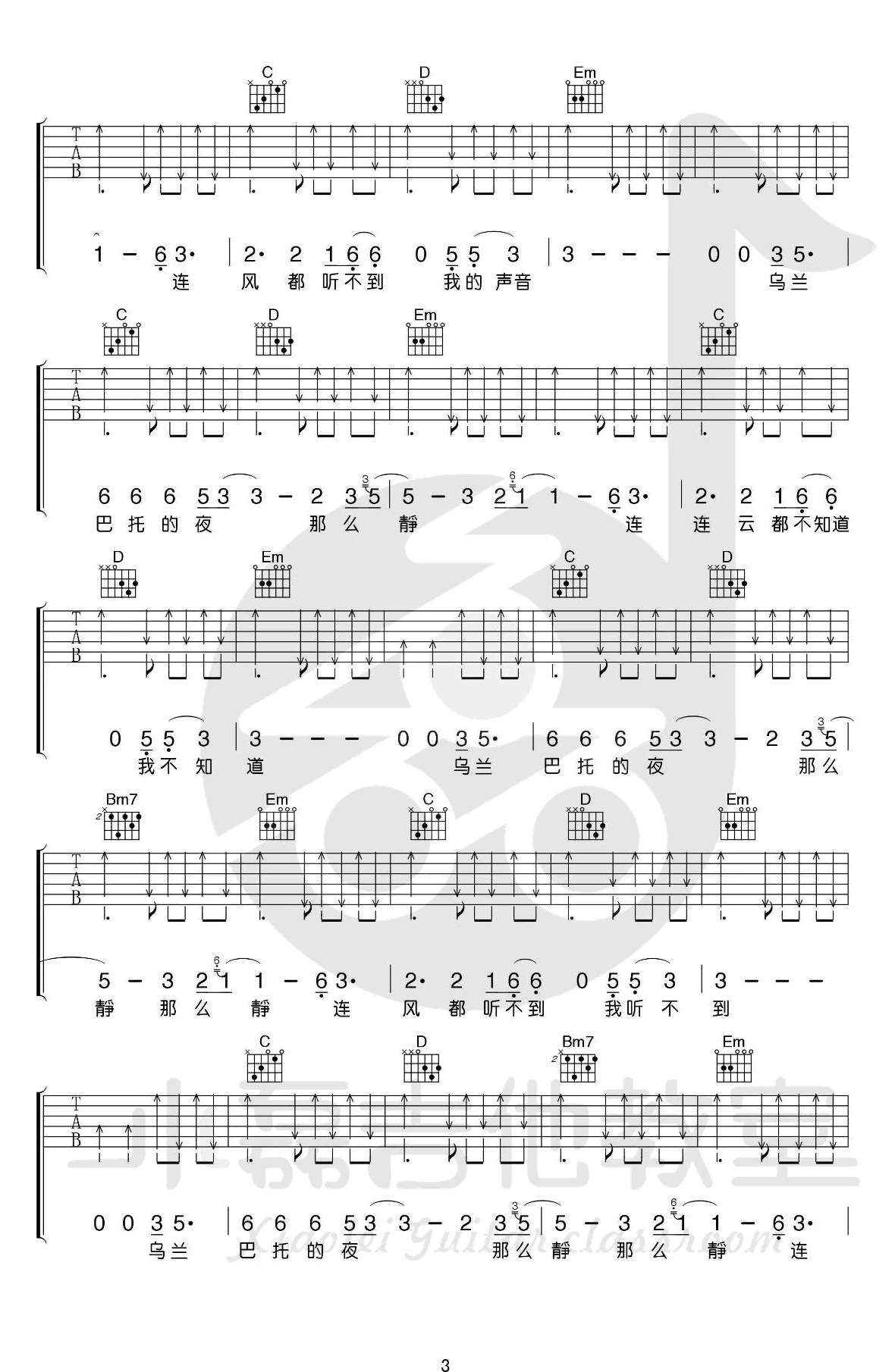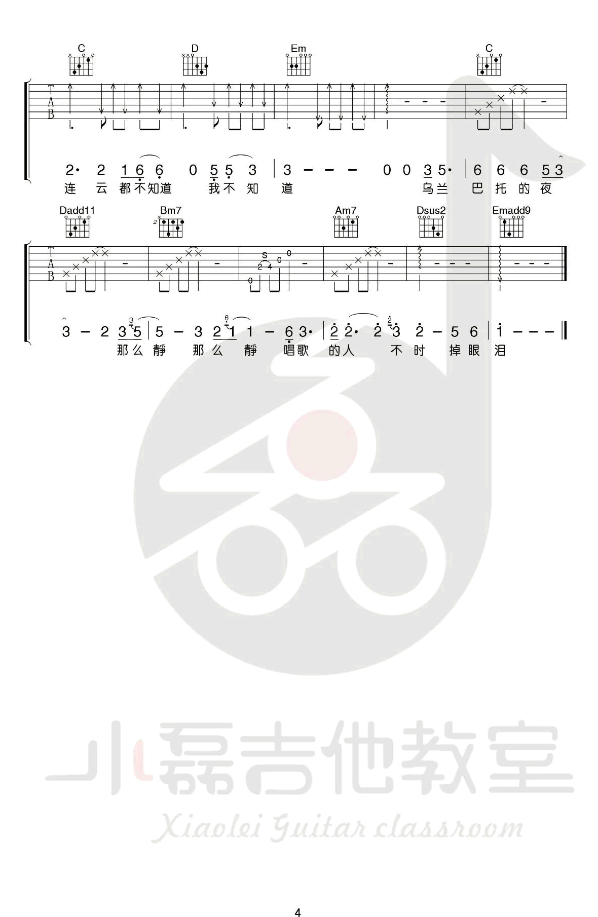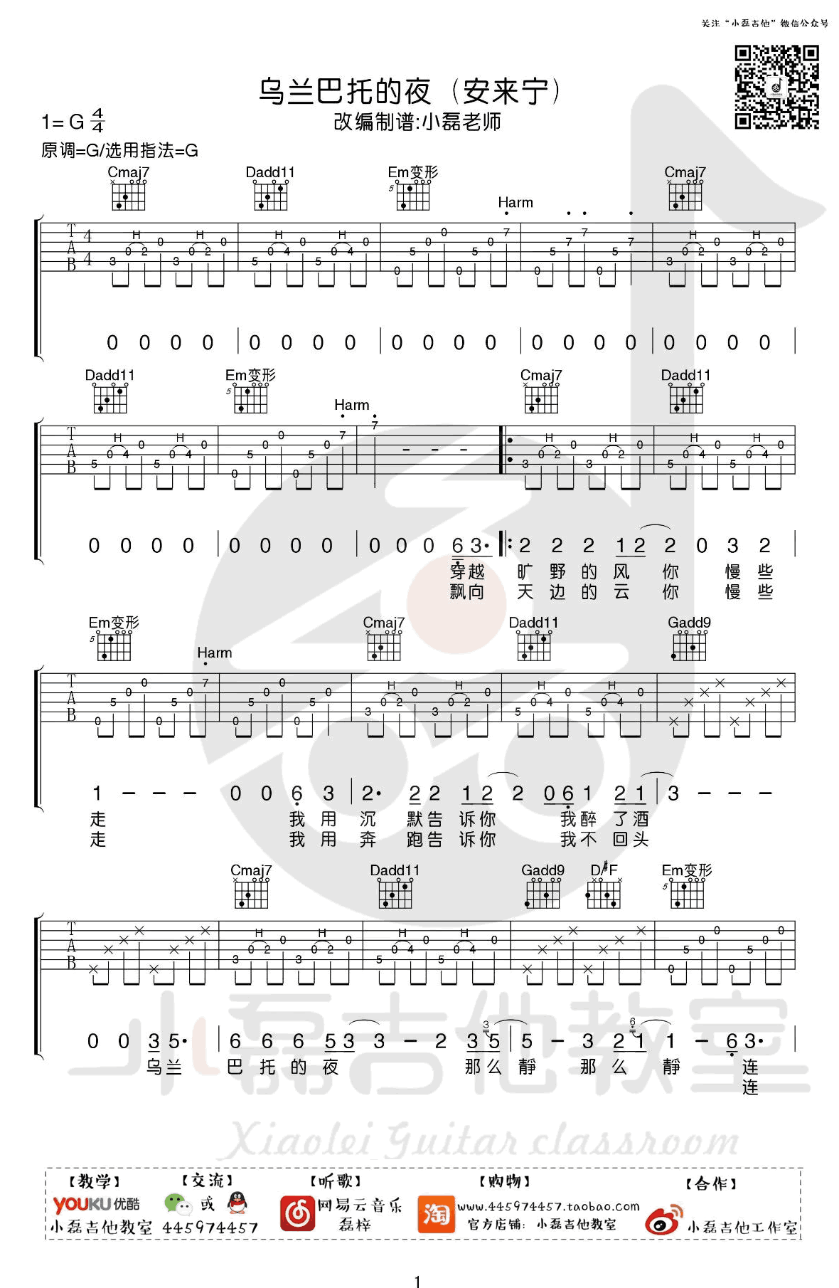 曲谱介绍: 《乌兰巴托的夜》吉他谱,安来宁演唱,适合吉他弹唱的版本,乌兰巴托的夜六线谱,G调指法编配,高清吉他图片谱,感谢小磊吉他出品,喜欢这首歌曲的琴友们,可以参照配套吉他弹唱教学视频学习。听过很多人唱这首歌,直到听到安来宁的版本,一个浅唱低吟的歌者,吉他声明媚又干净;歌声娓娓道来却平和有力,直击人心。你可以感觉悲戚的风在他身边转了方向,连空气都变得通透了,也许这才是真正草原的味道。相似的歌词相似的音乐,却是完全不同的乌兰巴托。