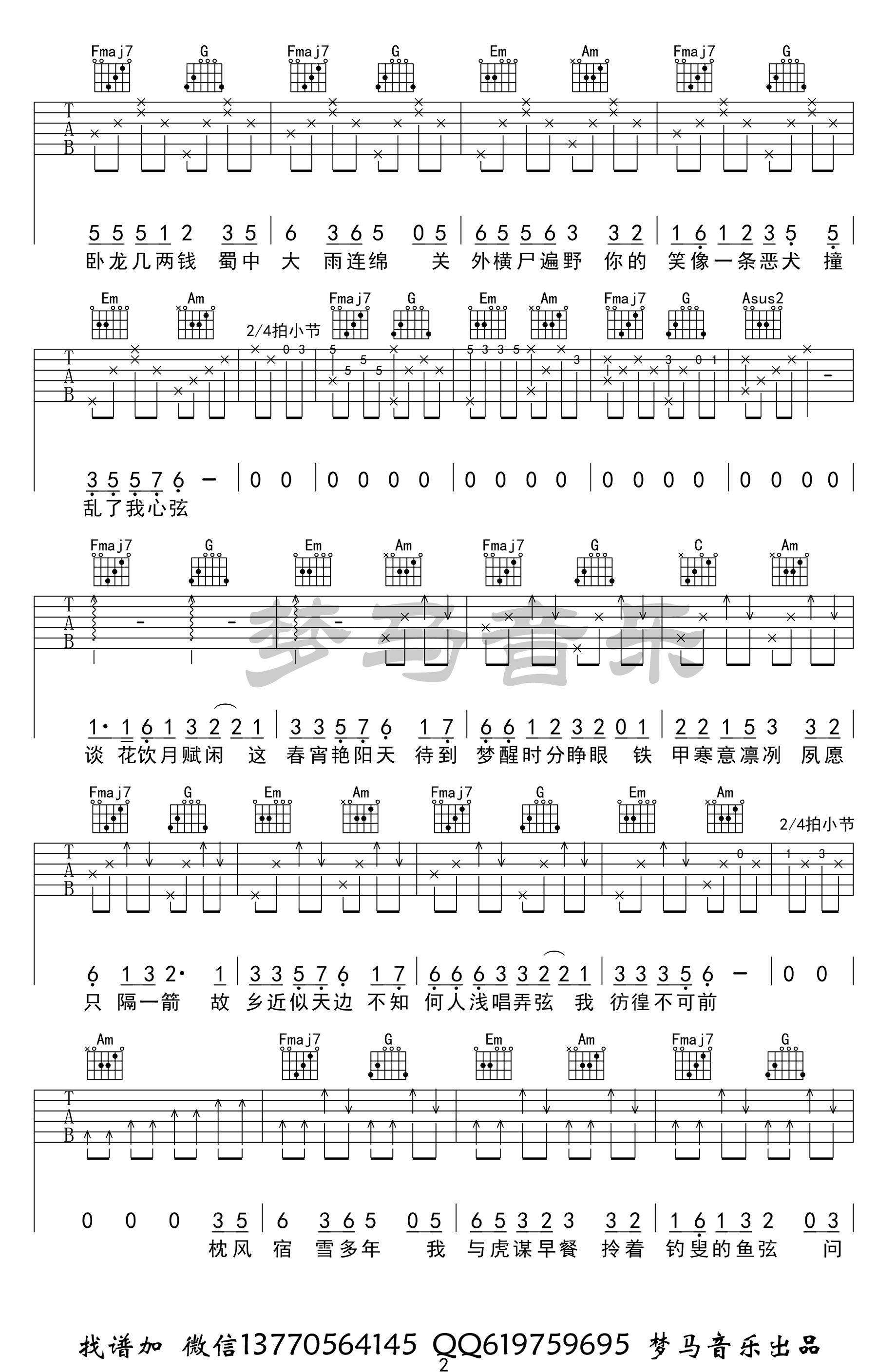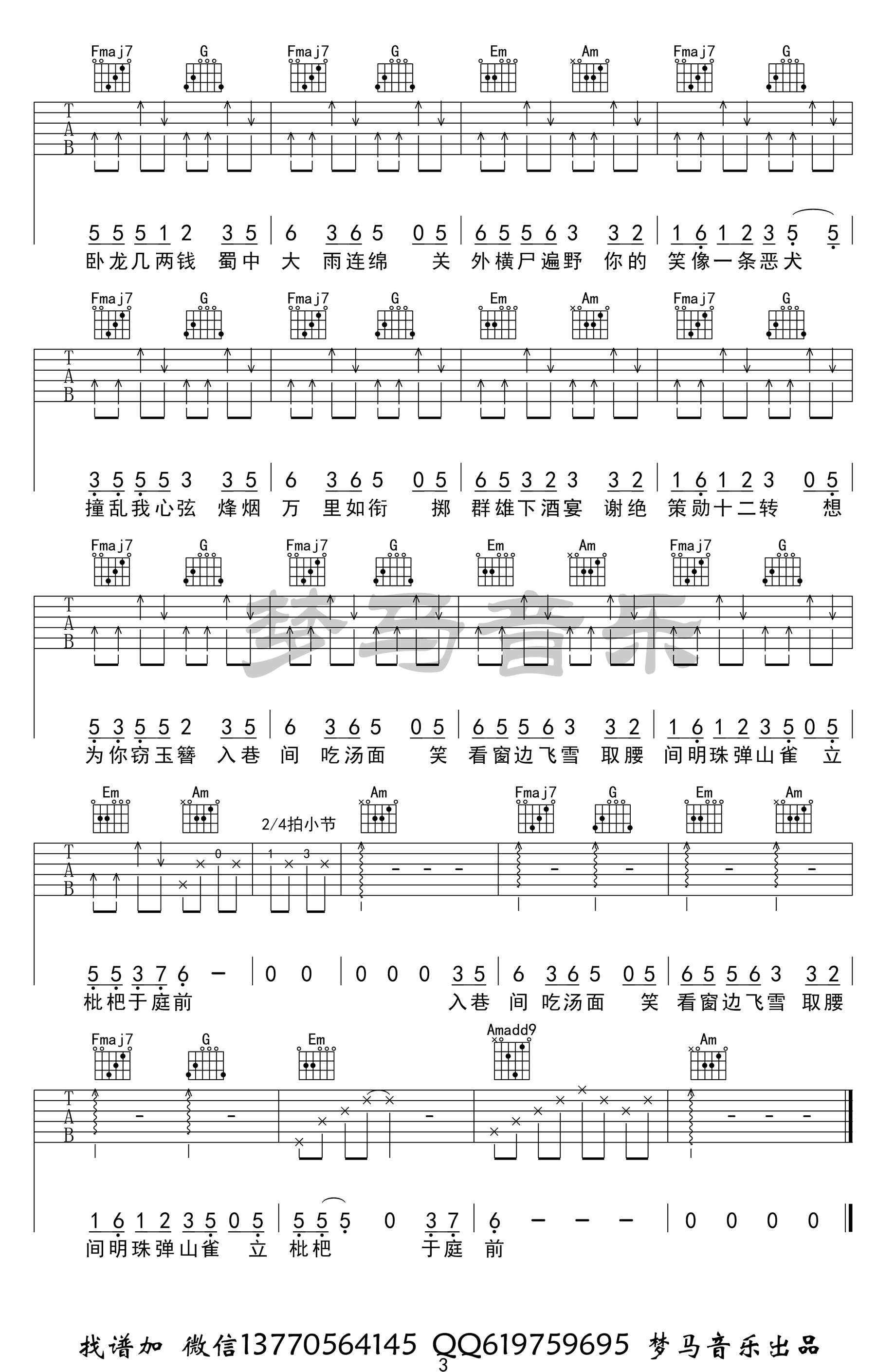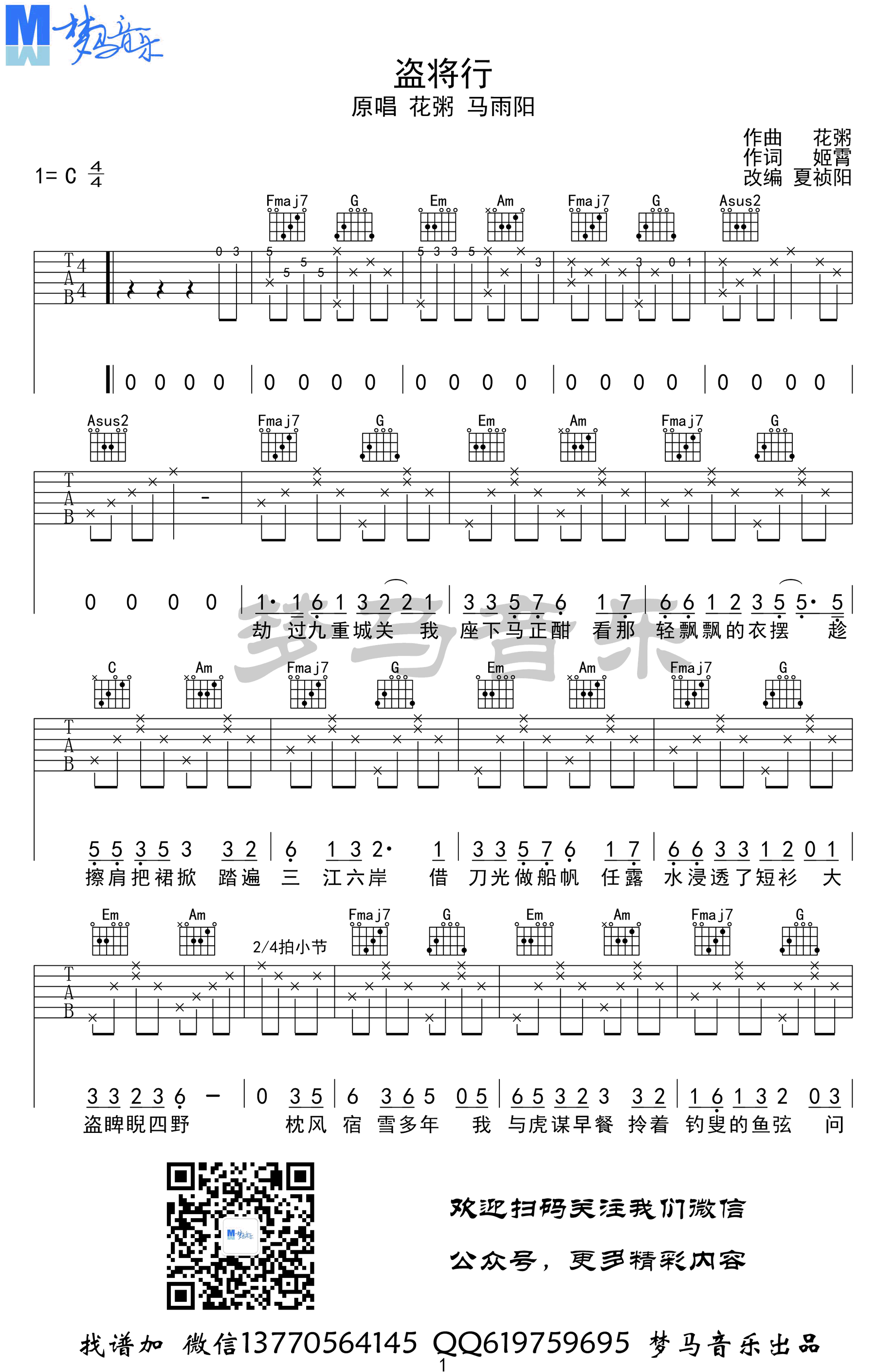 曲谱介绍: 花粥《盗将行》吉他谱,C调弹唱谱,高清图片六线谱,附配套《盗将行》吉他弹唱示范视频。梦马音乐出品,夏祯阳老师编配要点讲解: 这首歌曲我并没有进行多少改编,主要还是按着原曲的感觉做了出来。整首歌节奏都是基本一样的,比较好把握,适合节奏稳定性的练习。前奏和间奏是一样的,都是按着花粥原曲编的,稍加练习应该不难掌握。 盗将行吉他弹唱演示视频