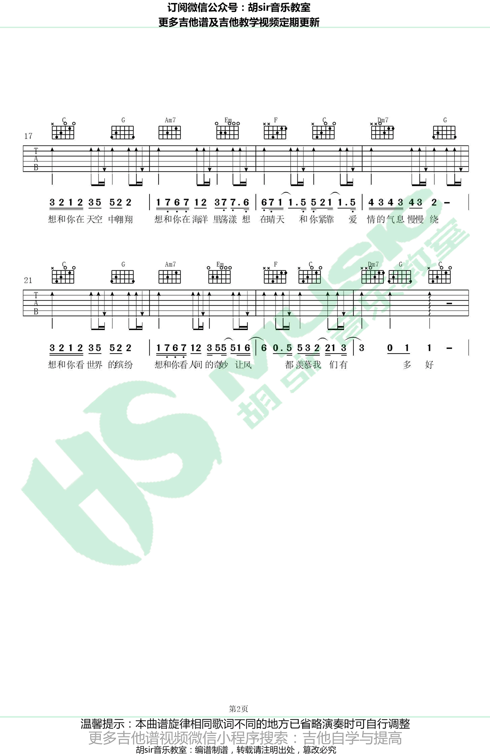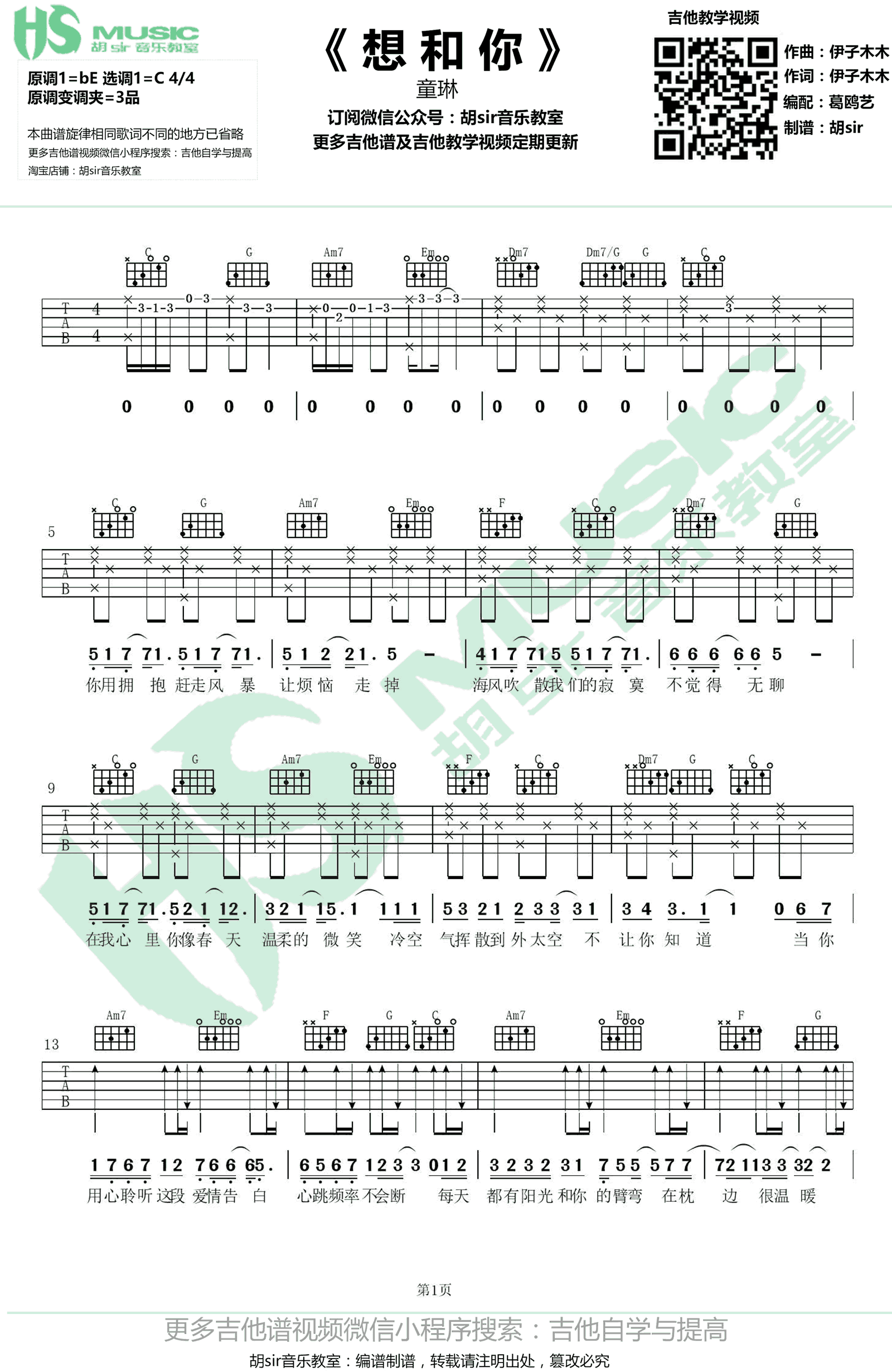 曲谱介绍: 童琳《想和你》吉他谱,原调bE,选调C,变调夹夹三品,想和你看世界的缤纷,想和你看人间的奇妙。 ​一首流行网络的抖音歌曲,想和你六线谱,高清弹唱图片谱,感谢胡sir音乐教室编配出品,91吉他谱网站上传推荐。 想和你在天空中翱翔,想和你在海洋里荡漾。拿去吉他,让我们将这段爱情的告白唱给心爱的人听吧。
