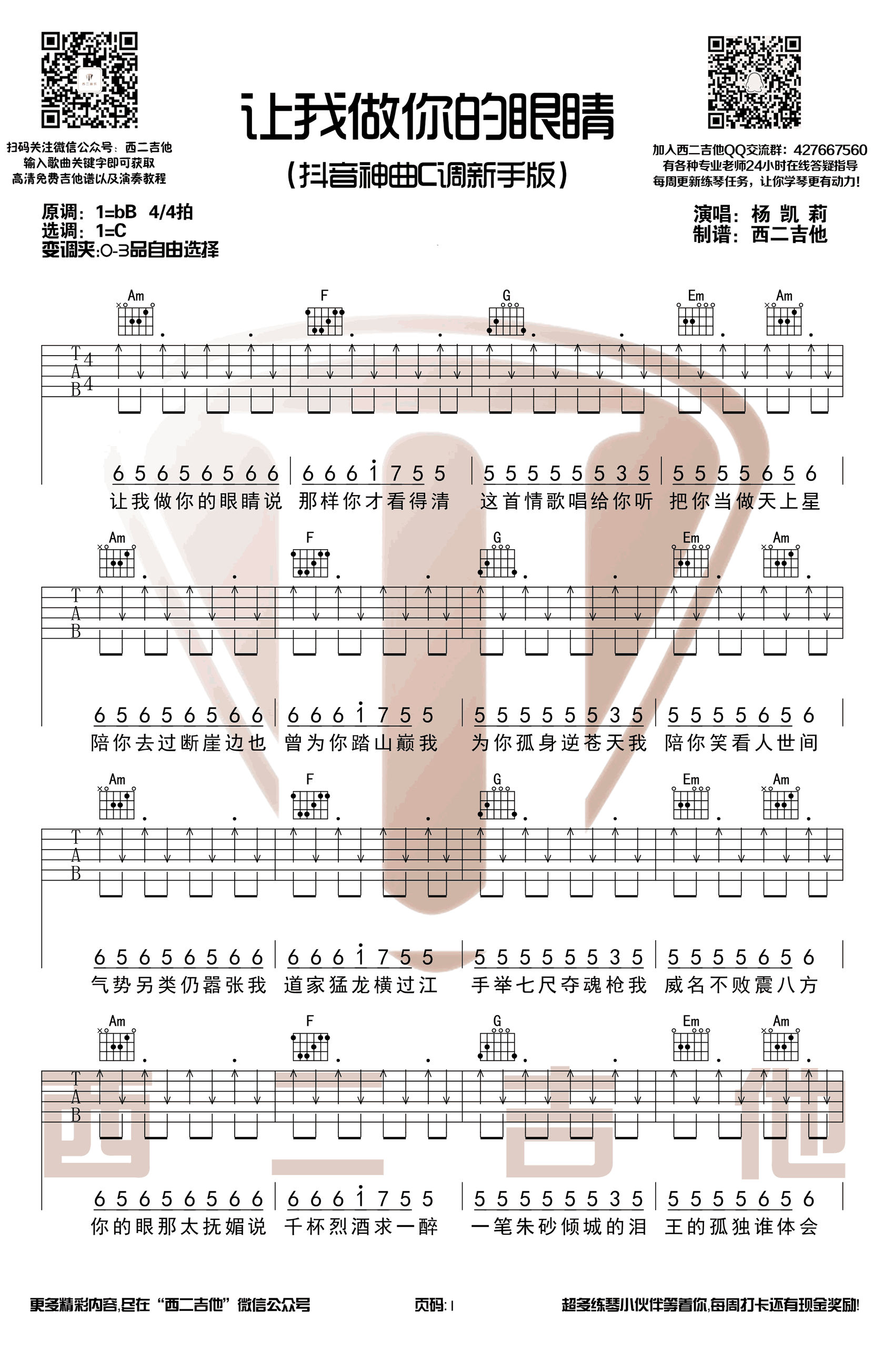曲谱介绍: 让我做你的眼睛吉他谱,C调扫弦版,变调夹0-3品自由选择,原歌名叫做《唱腔另类》,目前抖音最火的版本由莉哥o3o翻唱,而莉哥也凭借独特的烟嗓和可爱的笑眼,她很快吸引了大量关注。让我做你的眼睛六线谱,高清弹唱图片谱,西二吉他编配出品。 这首歌叫做原曲是日剧《悠长假期》的插曲《Here We Are Again》,因纯音乐版作为电影《喜剧之王》插曲而闻名。没错,就是周星驰一句“我养你”,直怼万千少女心,虐死无数单身狗的经典桥段。