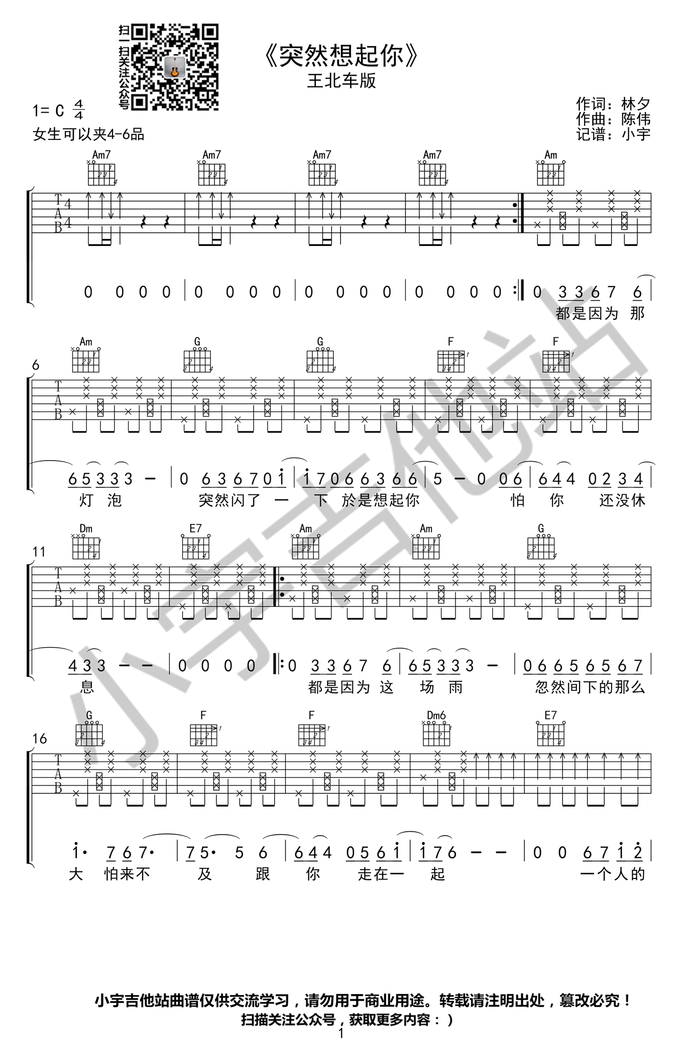 曲谱介绍: 突然想起你吉他谱,王北车版本,C调弹唱谱, 女生可以使用变调夹夹4-6品,王北车翻唱萧亚轩多年前的金曲《突然想起你》,火遍了整个抖音。突然想起你六线谱,三张高清图片谱,感谢小宇吉他站出品。 近些年来,在各种综艺节目、选秀节目和各大视频平台上都掀起了一股翻唱风。同一首歌,不同的演绎,让我们感到了别样的欣喜。