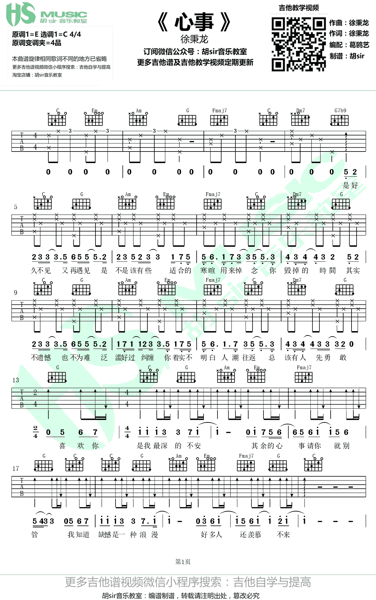 曲谱介绍: 徐秉龙心事吉他谱,原调E,选调C,原调变调夹夹第四品。《云村听歌会》节目现场,00后音乐唱作人徐秉龙演绎了全新作品《心事》,这是徐秉龙首张原创EP中的第一首歌。心事六线谱,吉他弹唱谱,感谢胡Sir音乐教室编配出品,欢迎扫码关注,一起学习91吉他谱。