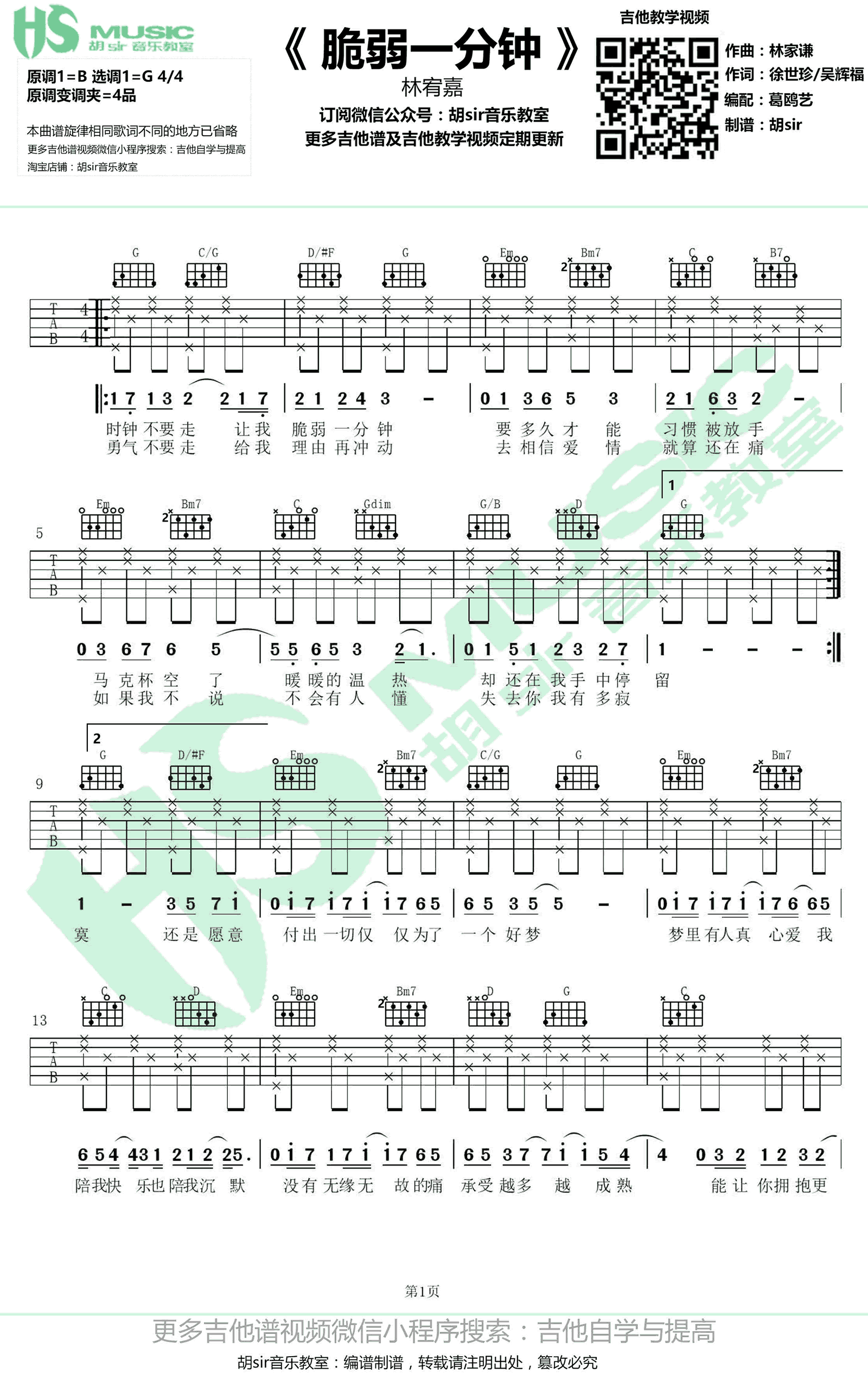 曲谱介绍: 林宥嘉《脆弱一分钟》吉他谱,G调指法编配,变调夹夹四品为原调B调。林宥嘉为电视剧《爱情进化论》演唱的片头曲,以低音吟唱出疗愈力量。脆弱一分钟吉他弹唱谱,高清图片六线谱,胡Sir音乐教室出品,欢迎琴友们扫码关注,有系统的一起学习和提高91吉他谱。