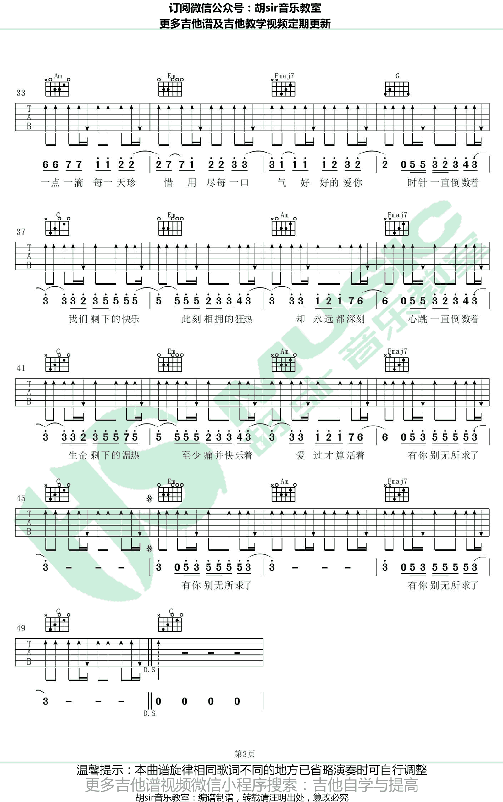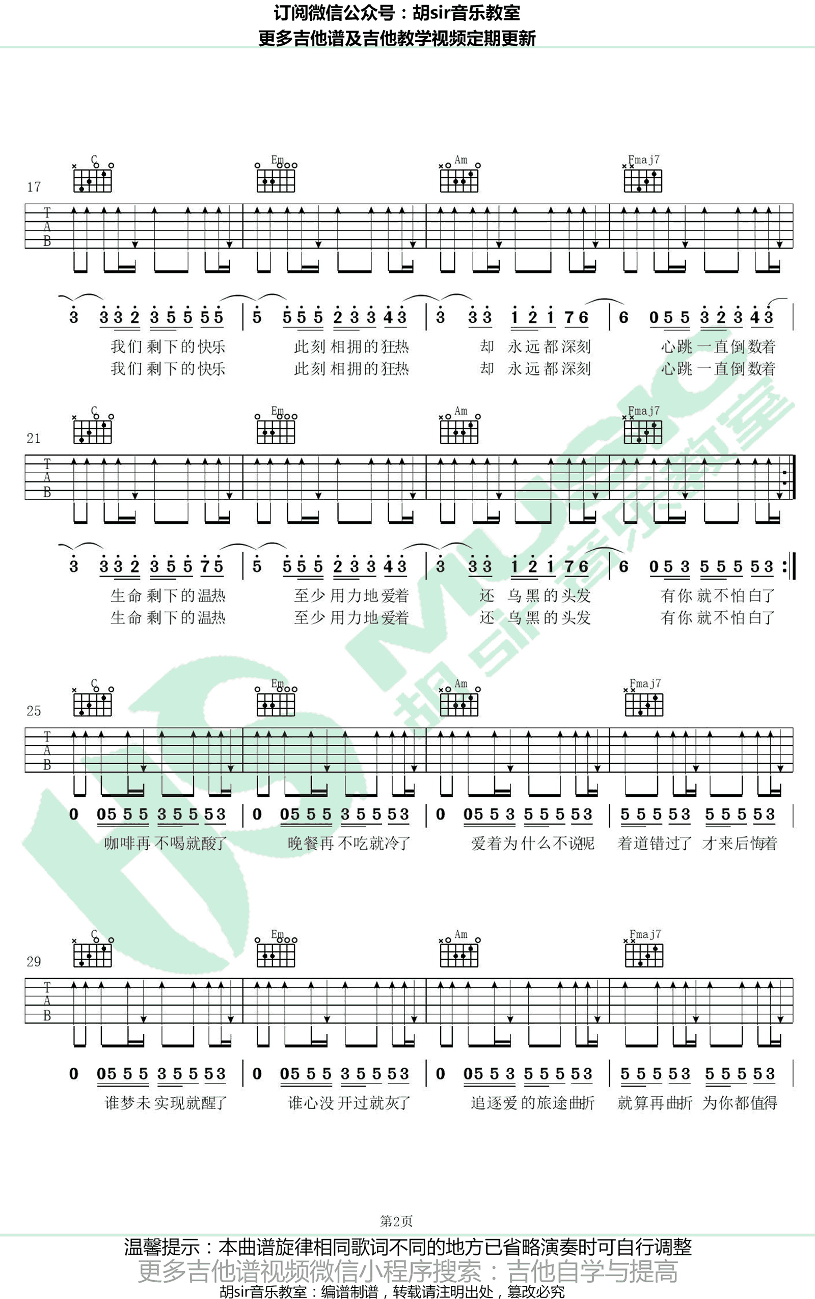 曲谱介绍: 邓紫棋《倒数》吉他谱,原调F,选调C,变调夹夹五品。倒数六线谱,高清弹唱图片谱,感谢胡sir音乐教室编配出品,欢迎吉他爱好者扫码关注,一起学习91吉他谱。 邓紫棋2018全新主打歌《倒数》, 时针一直倒数着,我们剩下的快乐;心跳一直倒数着,生命剩下的温热。在有限的时间里,每段关系是会变味过期,或者绚烂爆炸?,G.E.M.以磅礴穿透的歌声,冲破自我与时间的枷锁,回答着她对爱与生命的执着与坚持。