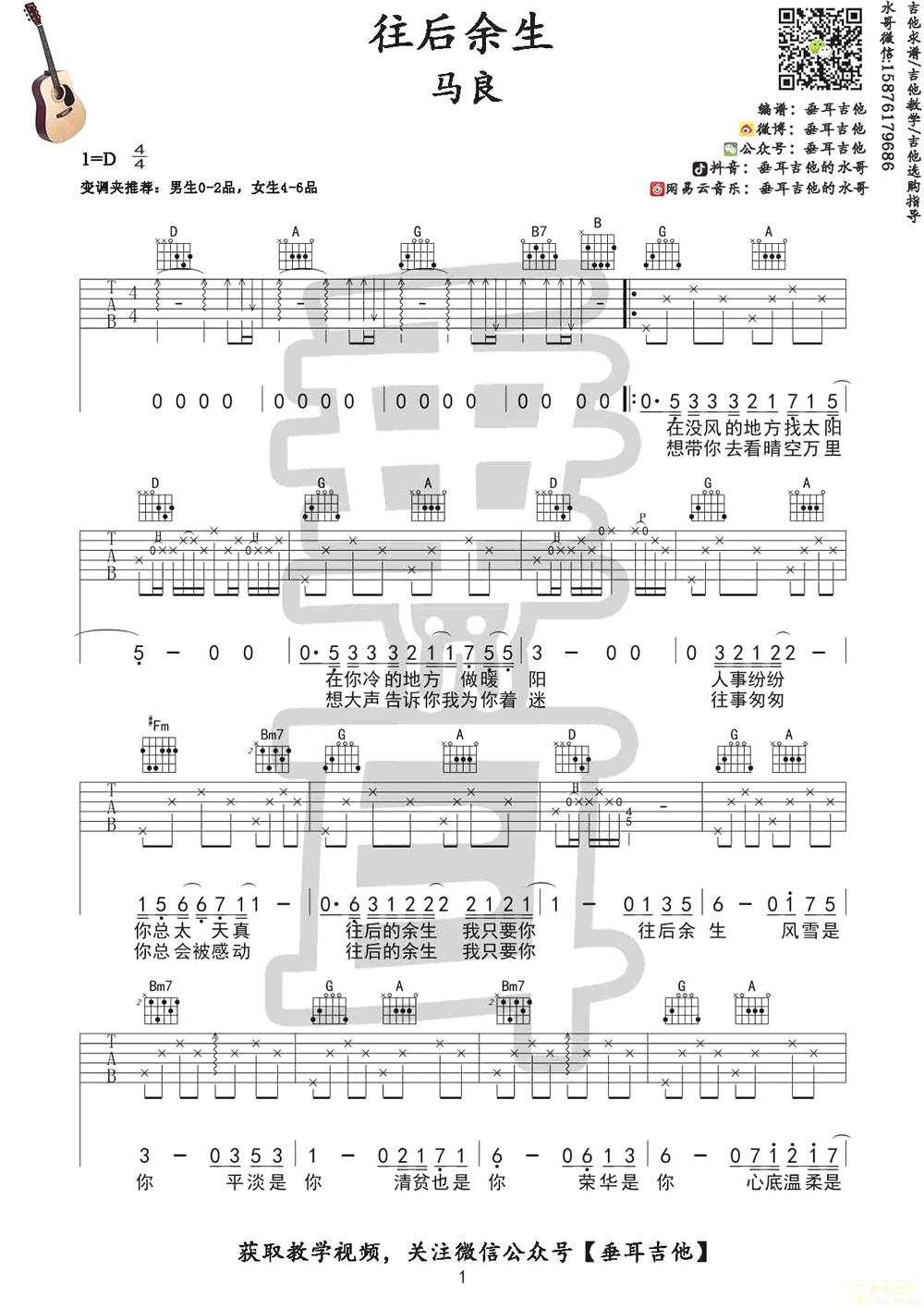 曲谱介绍: 往后余生吉他谱,马良的一首火遍网络的民谣歌曲,D调指法编配,变调夹男生推荐0-2品,女生4-6品,往后余生六线谱,垂耳吉他编配出品,随谱附上水哥老师带来的吉他弹唱教学视频。喜欢这首歌曲的琴友不要错过。音乐就是如此美妙。它仿佛在说,余生很长,保持初心,让对的那个人和你一起走到最后。余生,请多指教。