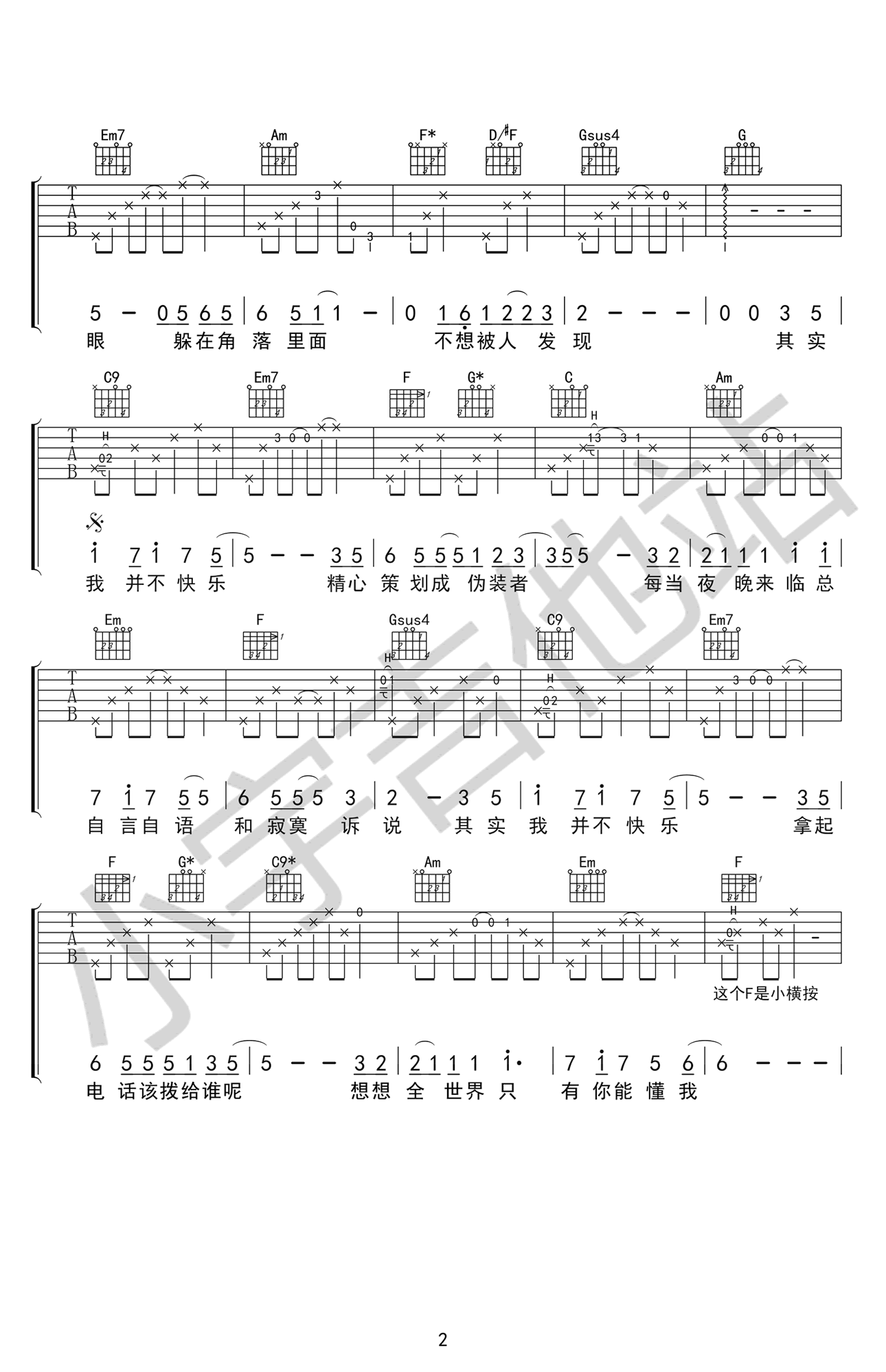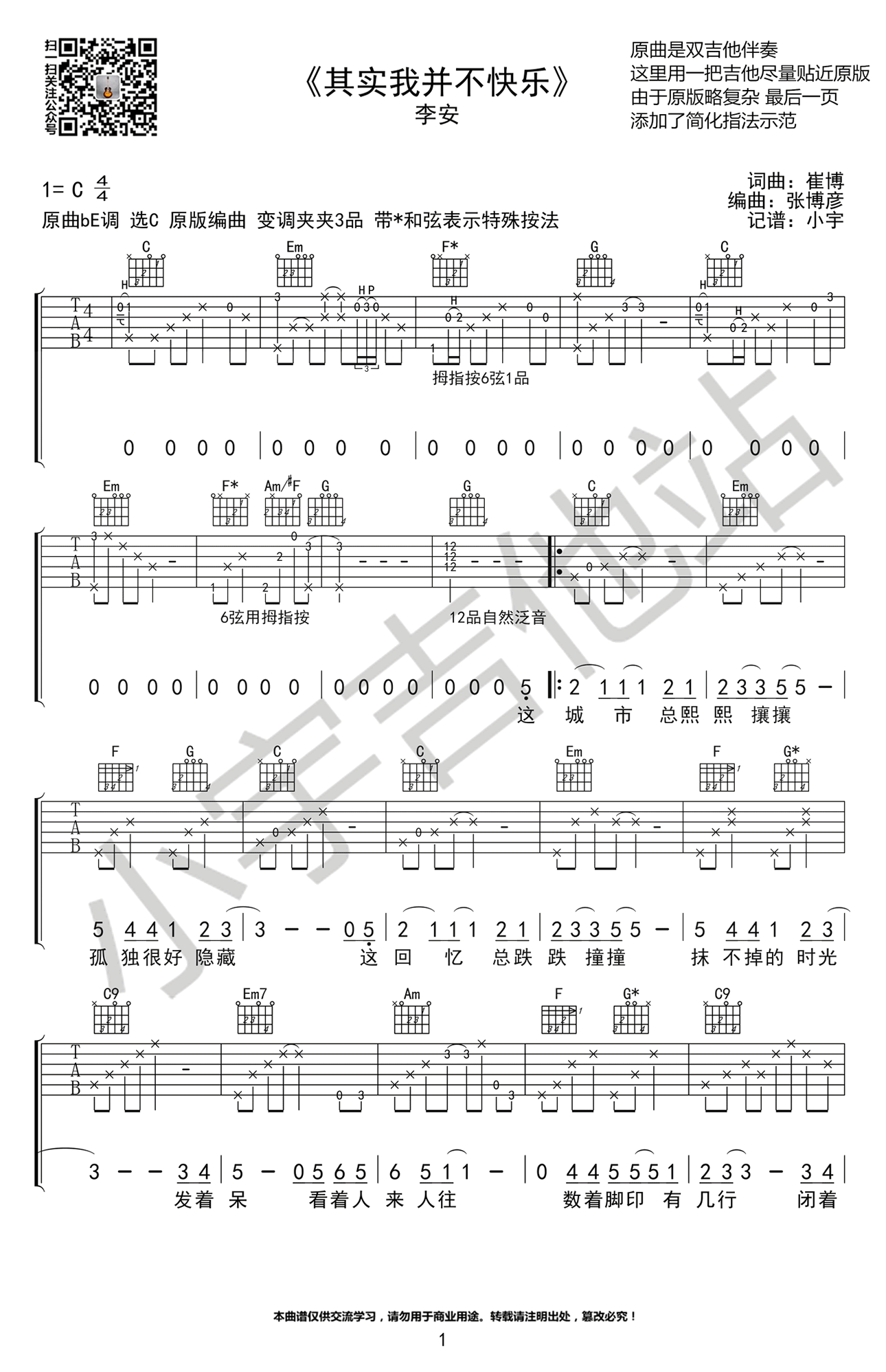曲谱介绍: 李安《其实我并不快乐》吉他谱,原曲bE调,选用C调指法原版编曲,变调夹夹三品,带*和弦表示特殊按法。其实我并不快乐六线谱,吉他弹唱图片谱,感谢小宇吉他站出品。 《第四季中国好声音》一举取得周杰伦战队亚军的歌者李安新专辑中的一首歌曲,你还记得那个回忆中孤独无助的你吗?这首新歌唱出城市人的内心寂寞,也许我们都习惯了伪装,遗憾的是面具总要摘下,每当夜深人静的时候,最可怕的不是孤独,是拿起了电话却没有一个人可以听你的心里话。