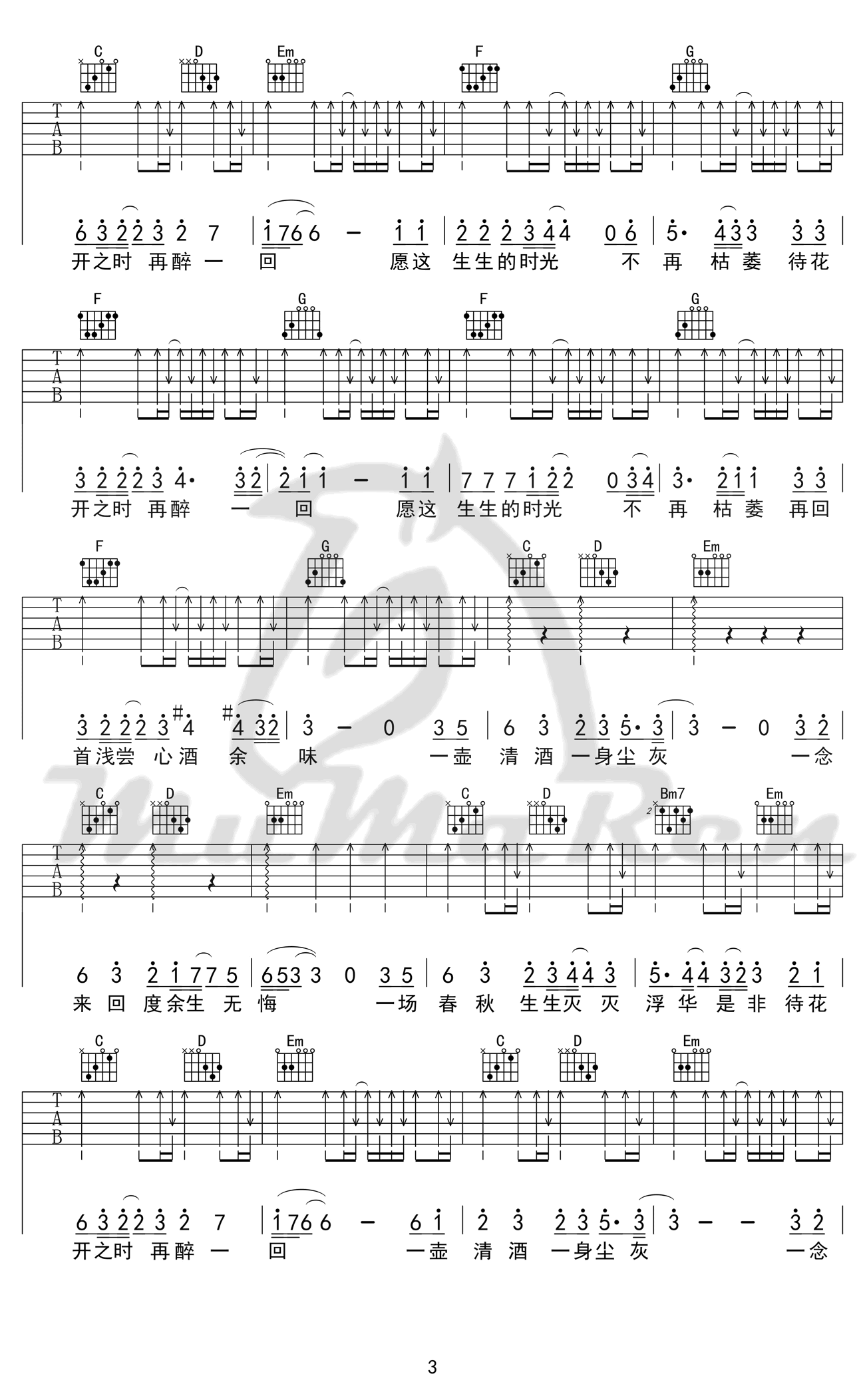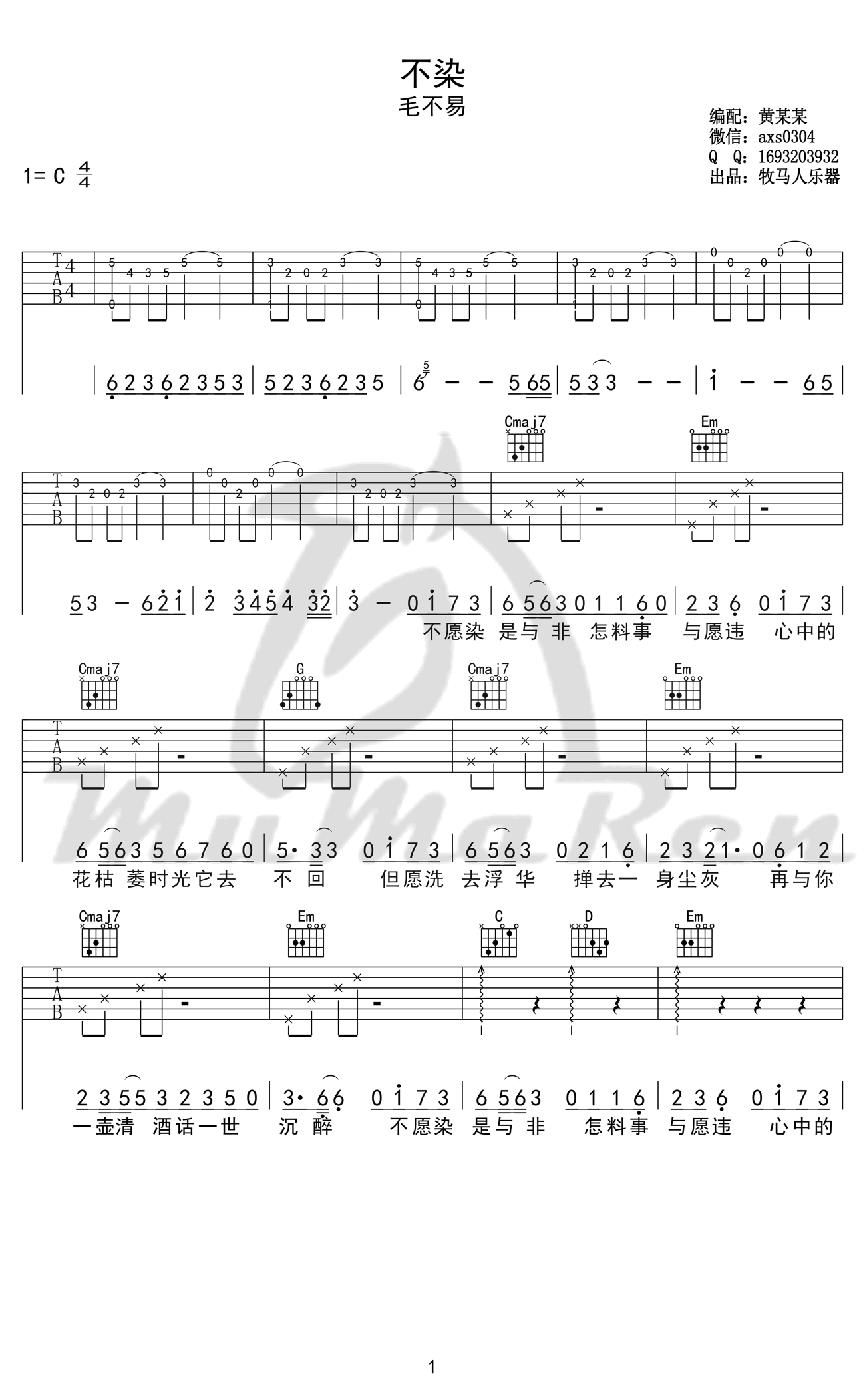 曲谱介绍: 毛不易《不染》吉他谱,C调指法编配,高清弹唱谱,毛不易献唱电视剧《香蜜沉沉烬如霜》主题曲,不染六线谱,完整版四张图片谱,感谢牧马人乐器出品,91吉他谱网站上传。随谱附上《不染》吉他弹唱演示视频。一曲古风古韵的歌曲,轻吟浅唱出放不下爱别离,愿我们初心不染杂质,爱情不染功利。