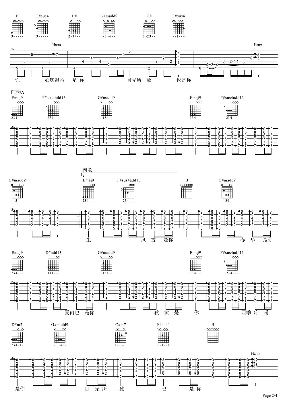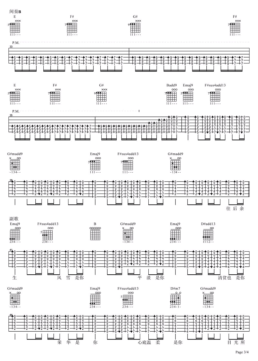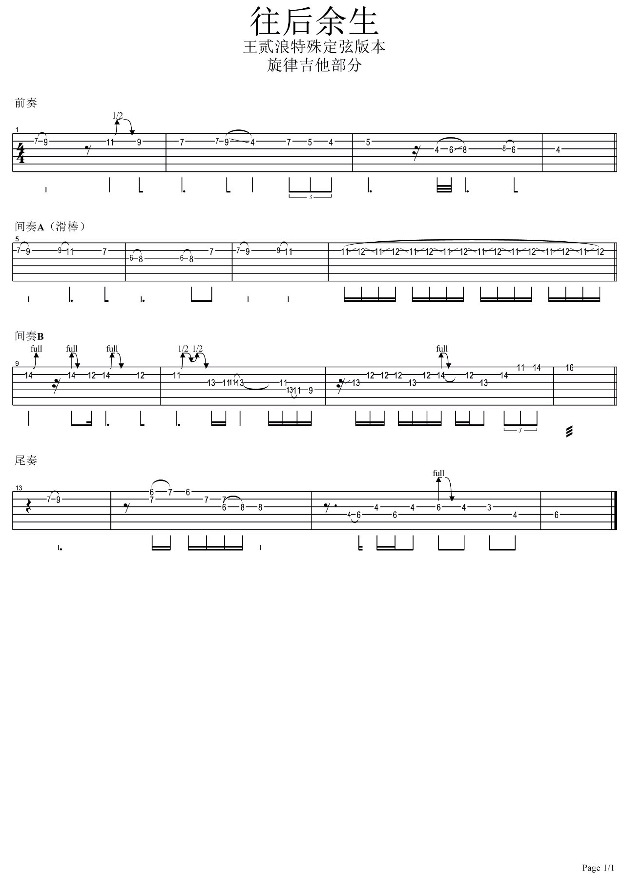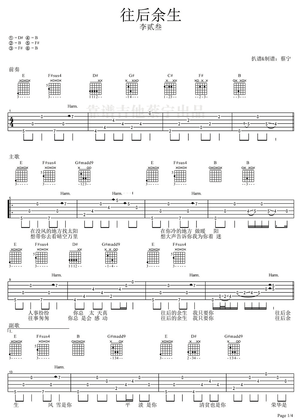 曲谱介绍: 往后余生吉他谱,王贰浪特殊定弦版本, 靠谱吉他出品,蔡宁老师扒谱制谱,编配说明:《往后余生》是马良词曲的一首民谣风格歌曲,也算是抖音上的热门歌曲之一。 今年有一个现象,就是抖音这个短视频APP引领了热门流行歌曲的方向。 既然是热门歌曲,那么就少不了有人翻唱,而众多翻唱版本当中,被誉为最好听的女生翻唱就是王贰浪的这个版本,整首歌经过重新的编曲带来了另一种感觉。到网上搜索了一下,没有查到任何关于这个版本的资料,几乎清一色的都是C调指法的编配,于是决定自己去扒谱。 《往后余生》吉他弹唱特殊调弦版 这首歌吉他部分采用了OPEN B的特殊定弦方式,由于定弦方式的改变带来了不同的和声效果,解放出来的手指还可以弹奏泛音作为点缀。视频当中伴奏部分基本上还原了原曲的弹法,间奏的部分我适当的做了一些小小的改动,使用了滑棒,加入了人声和一段4小节的SOLO。演唱部分的调式是原曲的B调,非常适合女生来唱。由于找不到女歌手,我只好自己来唱,所以会觉得整体声音比较低沉。