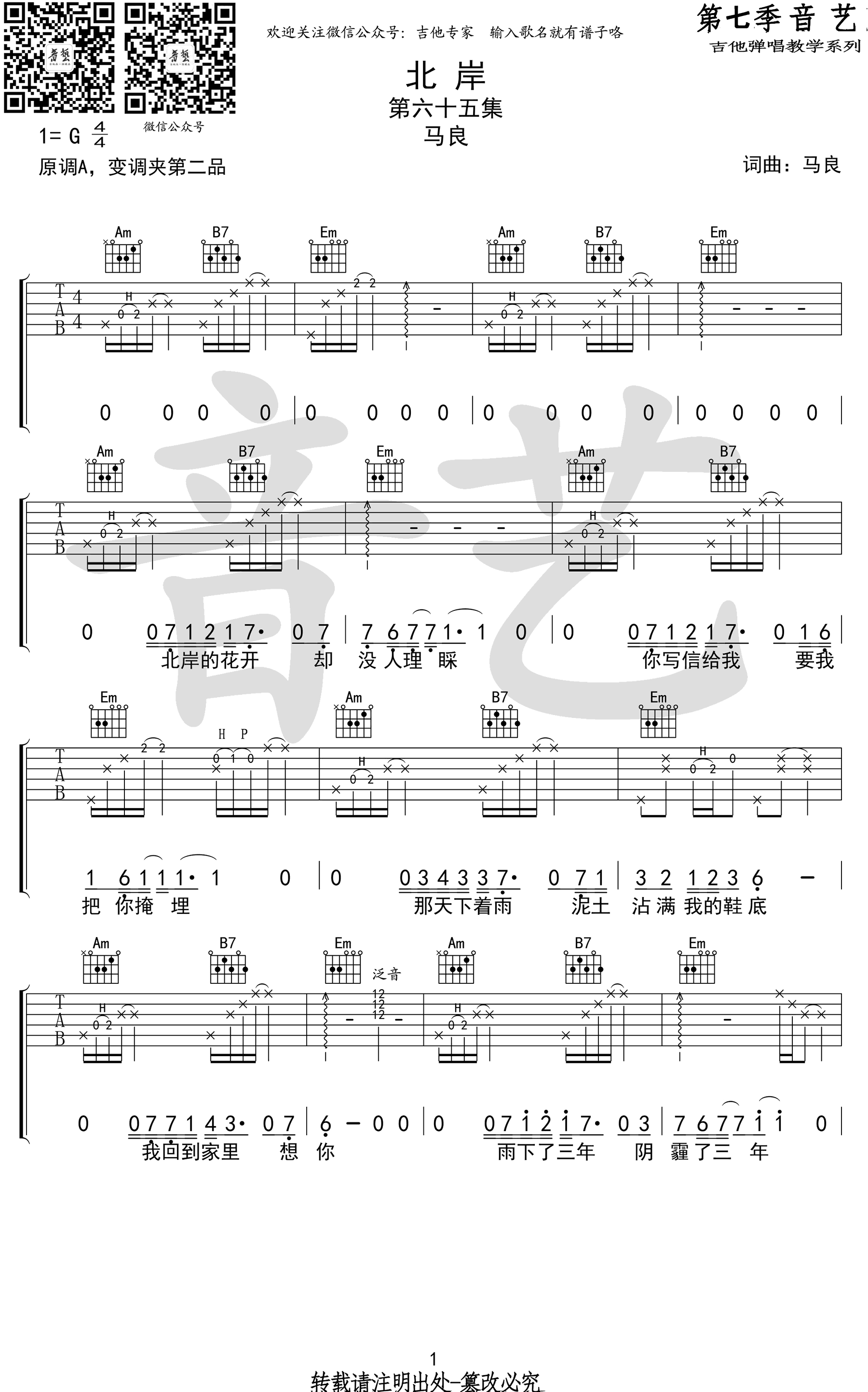 曲谱介绍: 马良《北岸》吉他谱,艺音出品,G调弹唱谱,原调A,变调夹夹第二品,唱火了《往后余生》的马良演唱的一首民谣新歌,北岸六线谱,高清图片谱共四张谱例。感谢艺音出品,91吉他谱网站上传推荐。 北岸的花儿正在盛开,可是我心中的女孩呢?歌曲唱出男人关于爱情无果的感伤,那些奔涌在内心无法压抑的爱,最终如悲伤的雨水释放。一首值得细细品味的歌带给你。