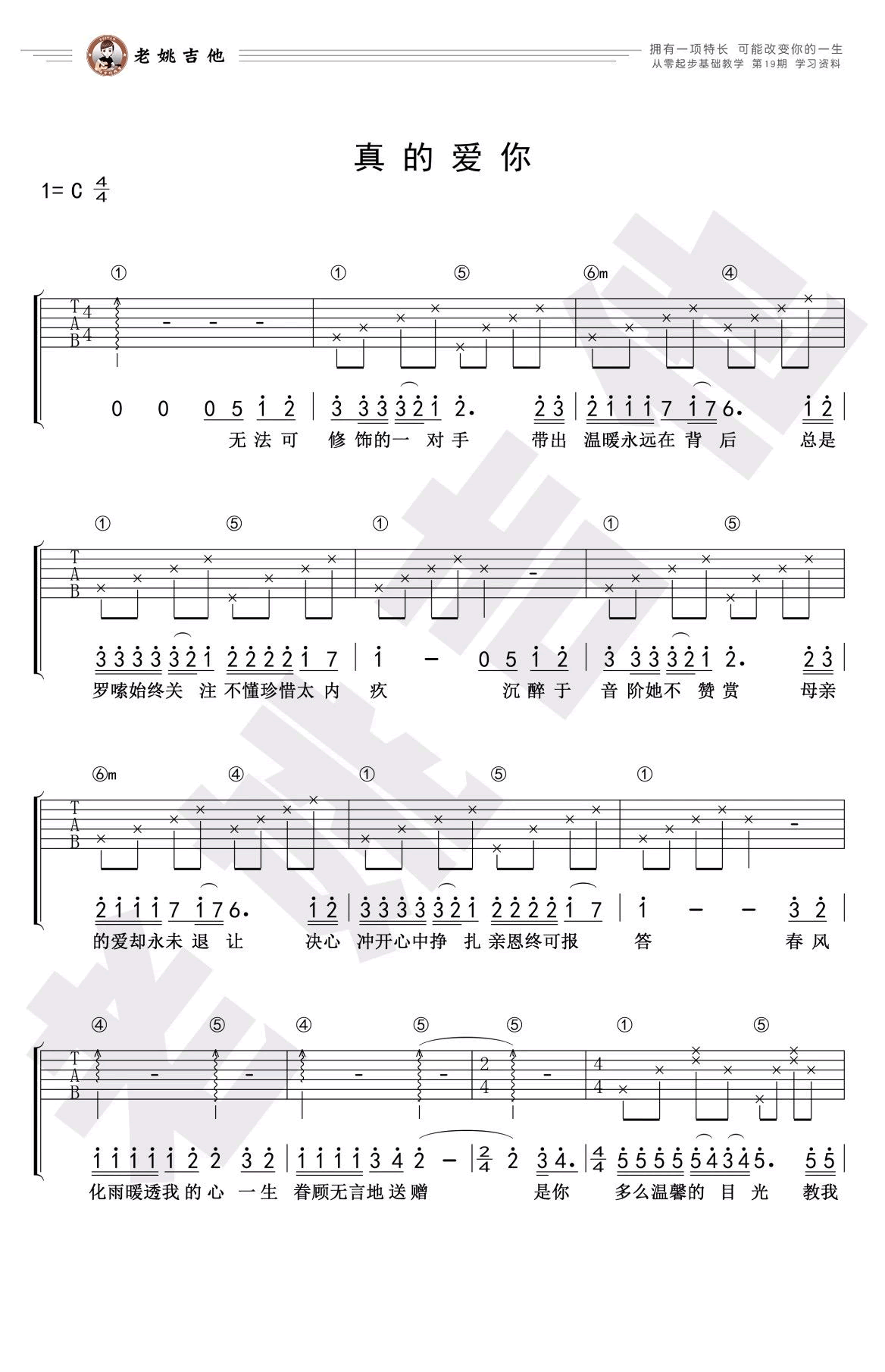 曲谱介绍: Beyond《真的爱你》吉他谱,C调简单版,老姚吉他编配出品,本期从零起步基础教学课程包括和弦级数算法及应用、大横按F和弦。第一次听《真的爱你》是一首情歌,长大了才明白原来写的是深沉的母爱。也许生活中我们不善表达对母亲的感情,埋在心里的话只有通过这样一首歌曲唱出。 《真的爱你》吉他教学视频
