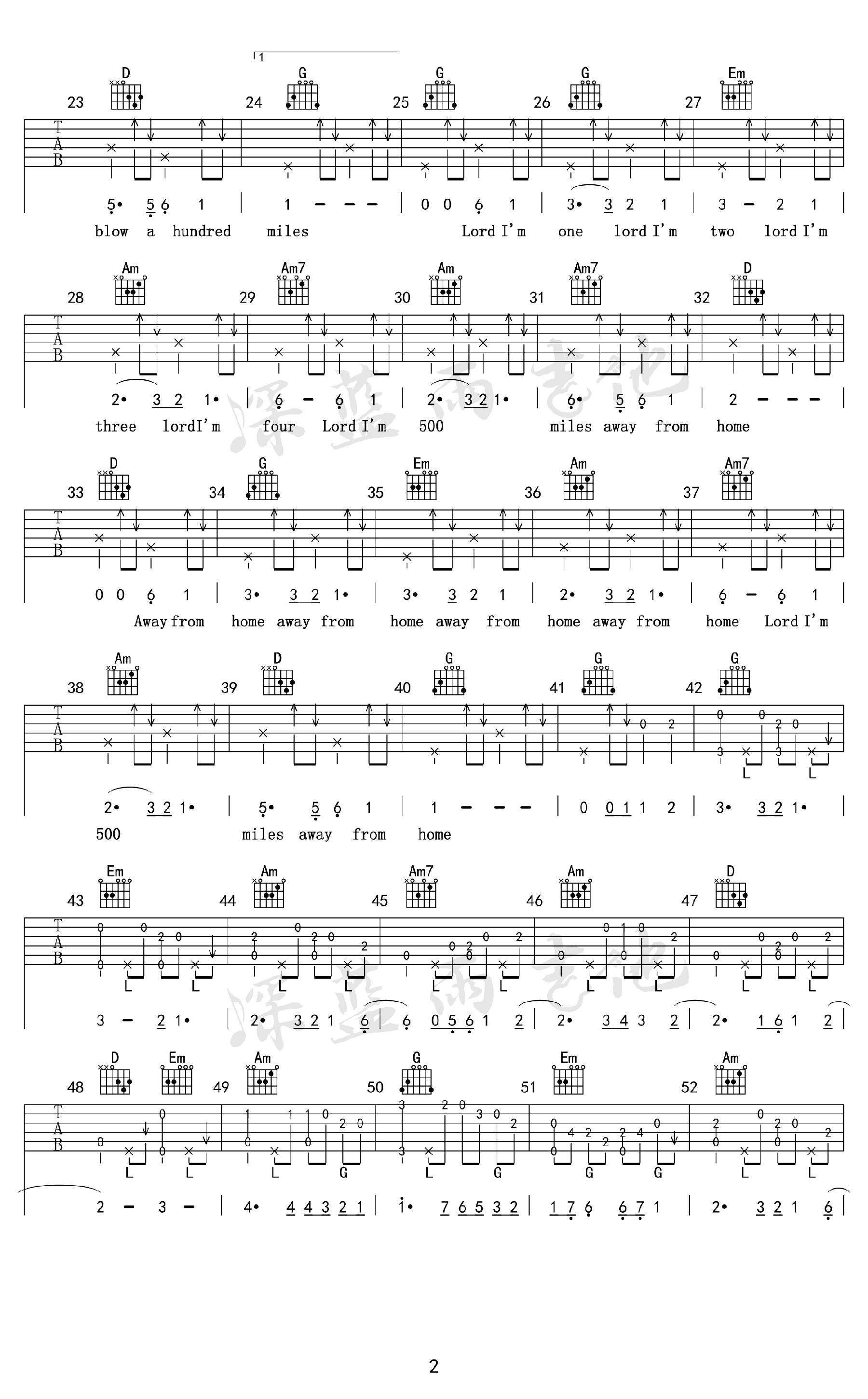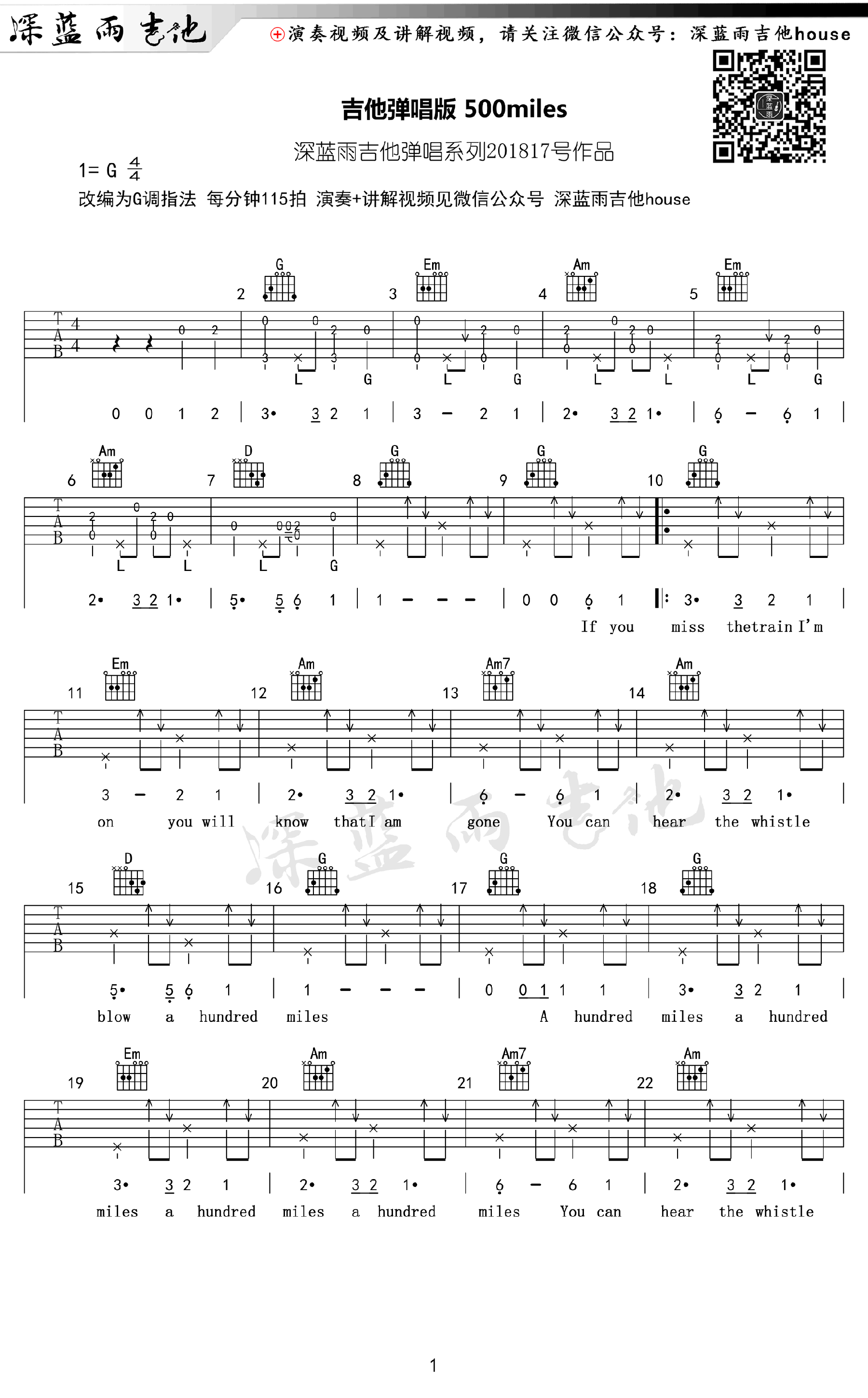 曲谱介绍: 500miles吉他谱,一首经典英文民谣歌曲,改编为G调指法,500miles六线谱,高清弹唱图片谱,深蓝雨吉他编配出品,91吉他谱网站上传分享。随谱附上吉他弹唱教学视频,琴友们跟随老师的示范讲解练习。循环过无数次的一首民谣《Five Hundred Miles》,有些离别一旦开始,便是永远,旋律写着流浪,歌词写着忧伤,听着就像走在旅行的路上,相信每个漂泊在外的人听完后都会有所触动! 吉他弹唱视频教学