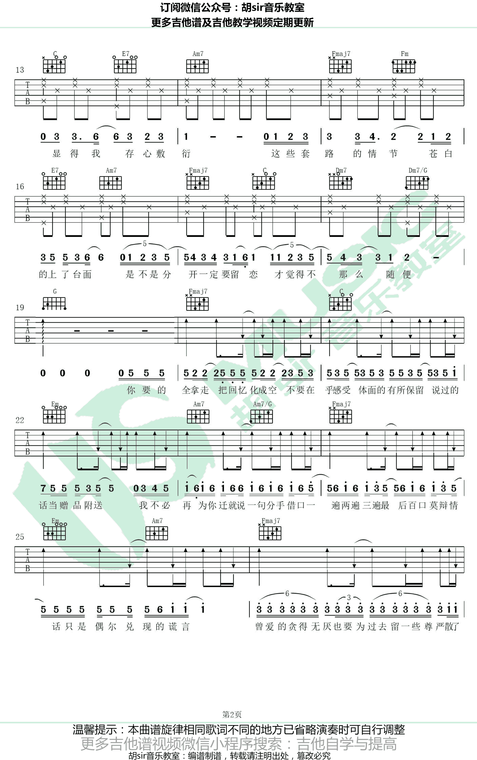 曲谱介绍: 胡彦斌《你要的全拿走》吉他谱,原调E,选调C,变调夹夹四品,胡彦斌一首原创虐心歌曲,你要的全拿走吉他弹唱谱,高清弹唱图片谱,胡sir音乐教室出品,欢迎琴友们扫码关注,一起学习91吉他谱。 一首R&B风格的歌曲,唱出了分手后的依恋,副歌部分即兴旋律很强,歌声完美融入旋律当中,独特的咬字,独具一格的节奏感,无不带给人耳目一新之感,让人听着十分过瘾。