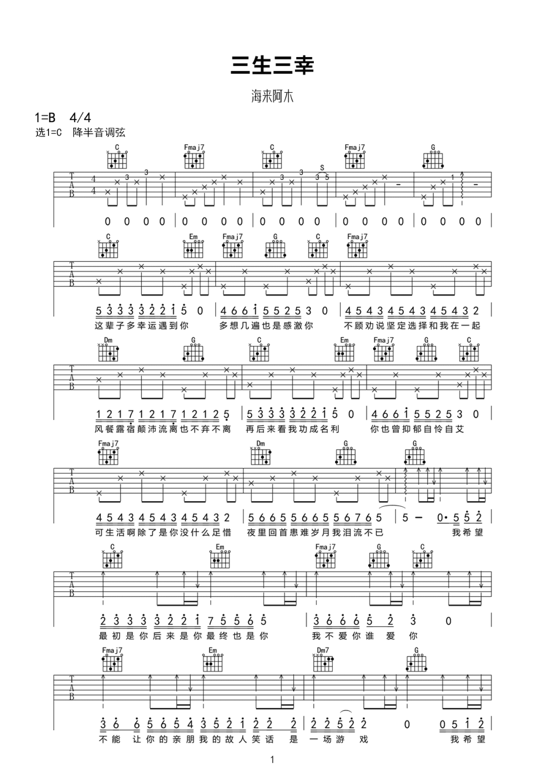 三生三幸吉他谱 - 海来阿木 - C调吉他弹唱谱 - 原版