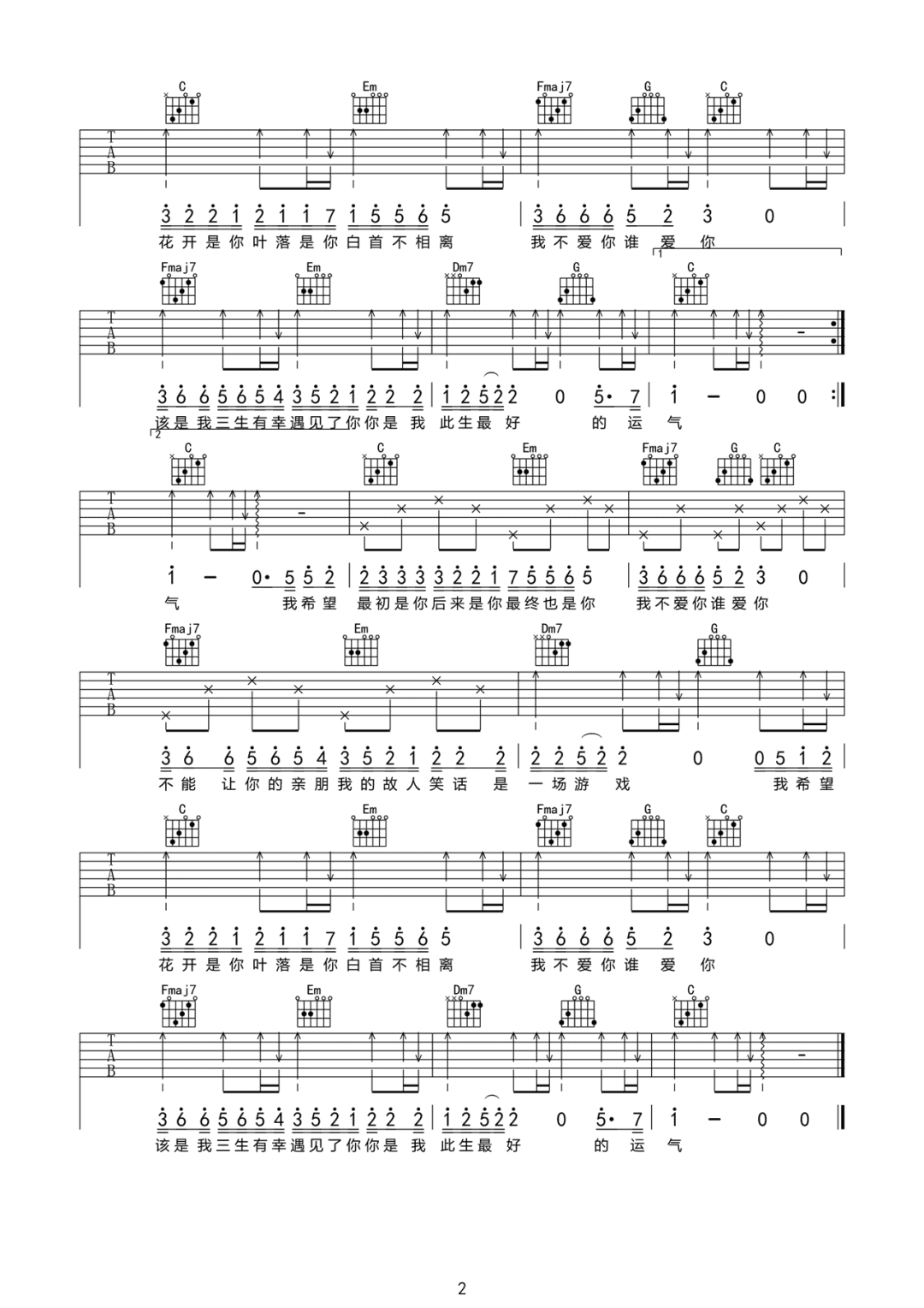 曲谱介绍: 吉他谱介绍:三生三幸吉他谱,海来阿木演唱的一首歌曲,4/4拍的节奏,这首歌曲的原调为B调,这里曲谱采用了C调指法进行编配,演唱时降半音调弦可回到原调,也可根据个人实际嗓音情况选择不降音或夹几品。曲谱由琴谱网更新上传,共2张高清图片弹唱吉他谱例,曲谱来源于网络转载,编配制谱者暂不详。这首歌是海来阿木为自己的婚姻写的一首歌曲,从一开始的一无所有不顾父母反对在一起,在出租屋里给爱人用硬纸壳扇扇子,到后面事业有所起色后无法家庭事业兼顾,直到现在相依相伴约定白首不相离。