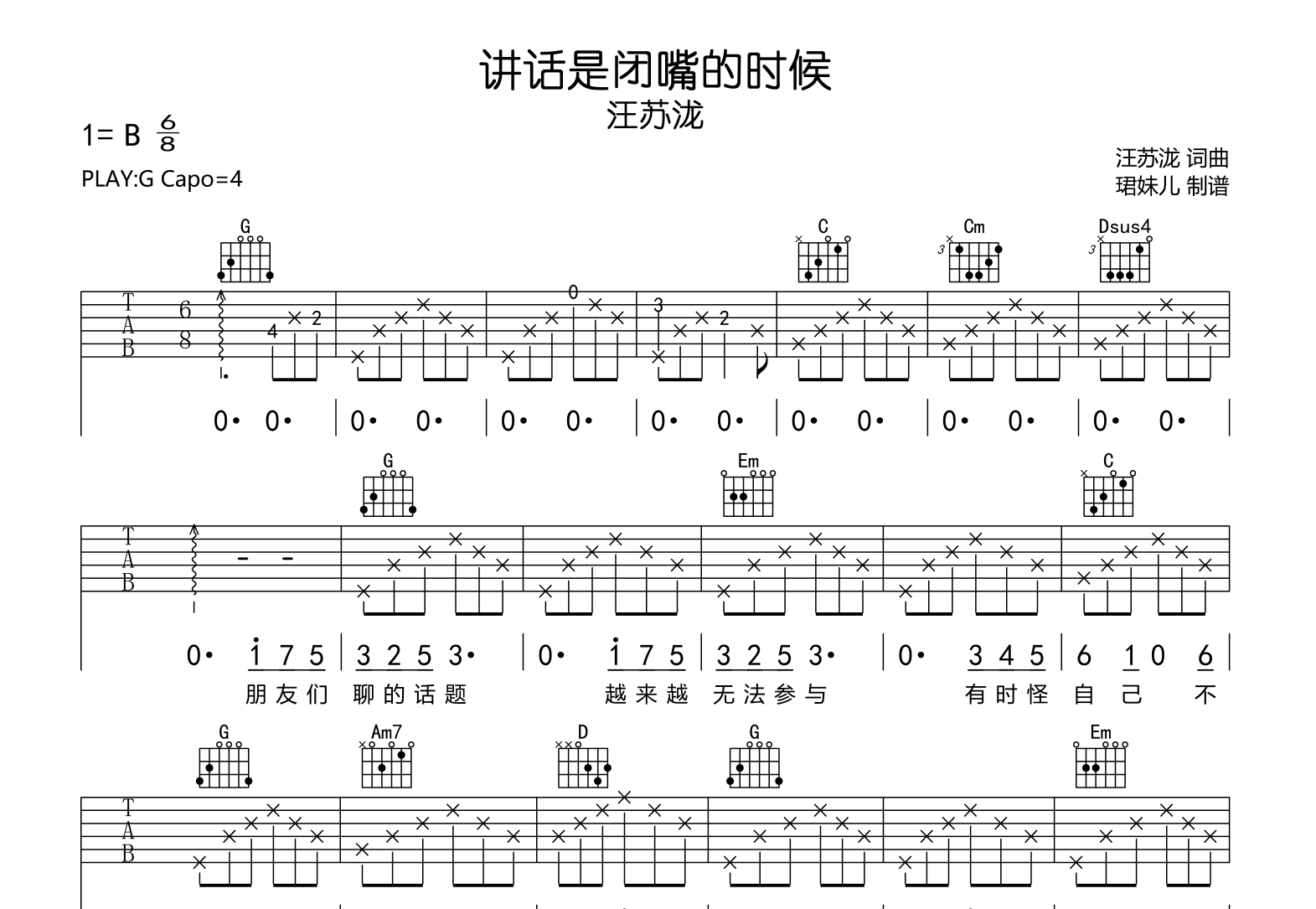 曲谱介绍: 讲话是闭嘴的时候吉他谱,汪苏泷演唱,《讲话是闭嘴的时候》吉他弹唱谱,原调B,采用G调指法编配,建议变调夹4品,速度85BPM,演奏易上手难度较简单。 一首有些悲伤与苦涩的歌,很多人说这首歌简直就是行走的互联网嘴替,相信与当代年轻人深深共情了。