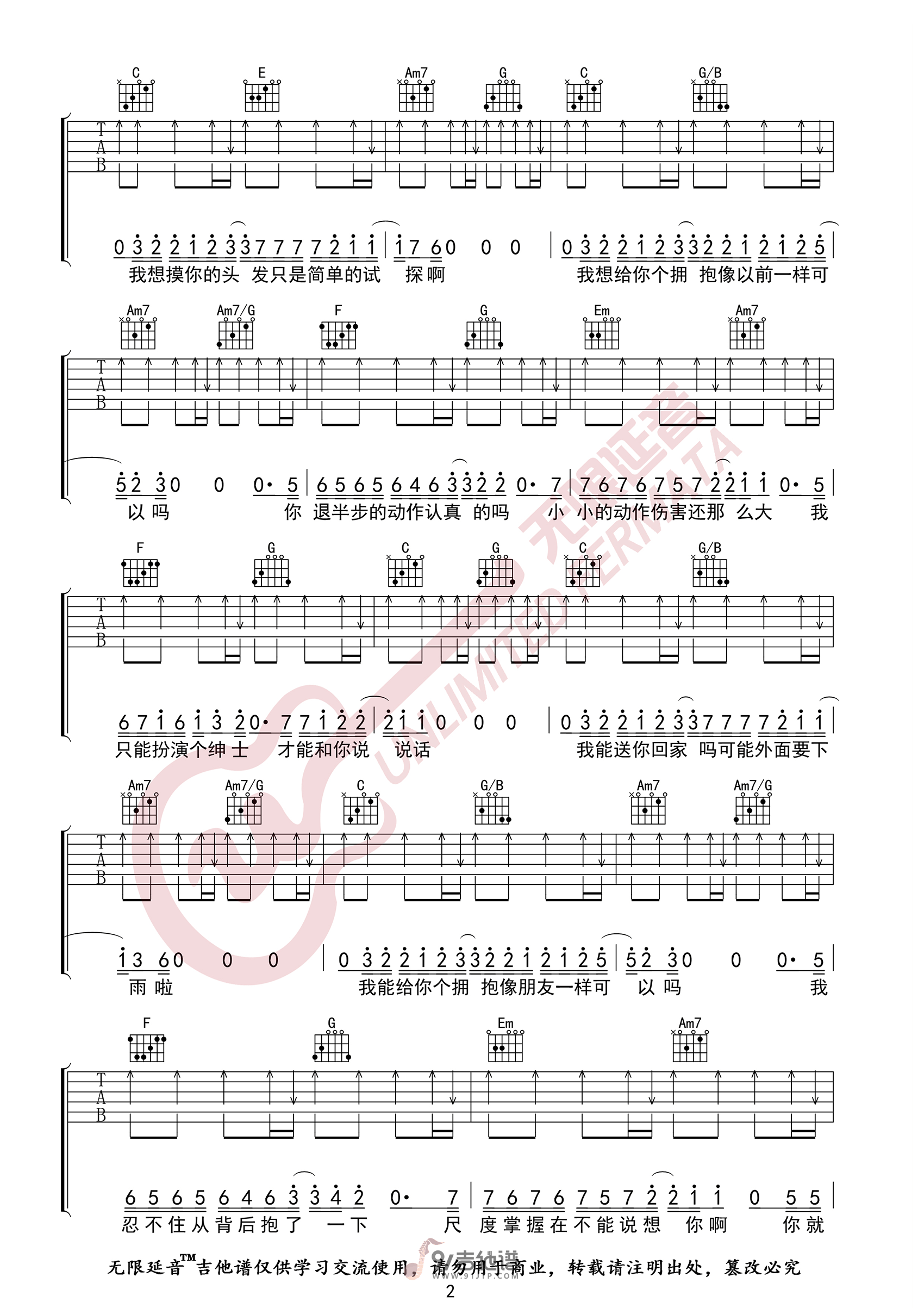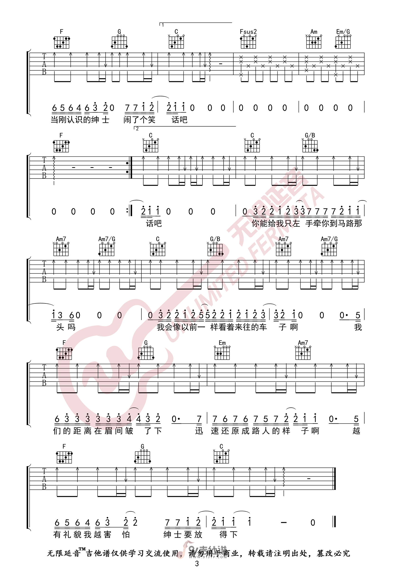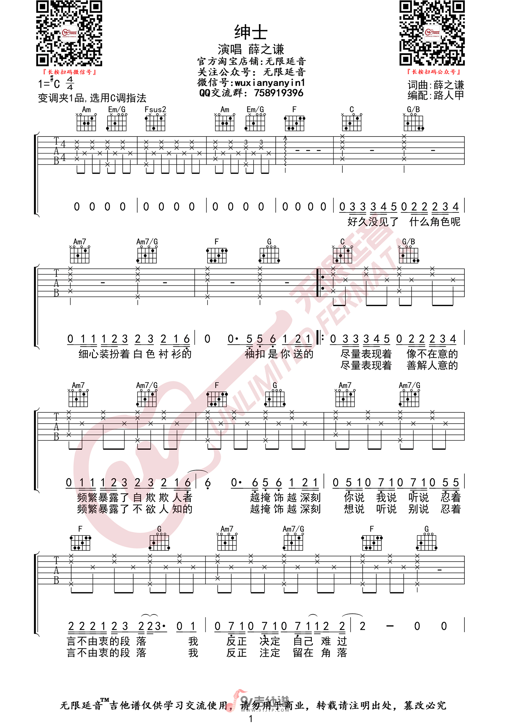 曲谱介绍: 曲谱简介:绅士吉他谱,薛之谦演唱的一首歌曲,4/4拍的节奏,这首歌曲的原调为#C调,这里曲谱采用了C调指法进行编配,演唱时夹变调夹1品可回到原调,也可根据个人实际嗓音情况选择。曲谱由无限延音编配出品。这首歌旋律舒缓,歌词深情,让听众听到带有薛之谦特色的“薛氏情歌”,用极限来诠释伤悲的爱情寓言。