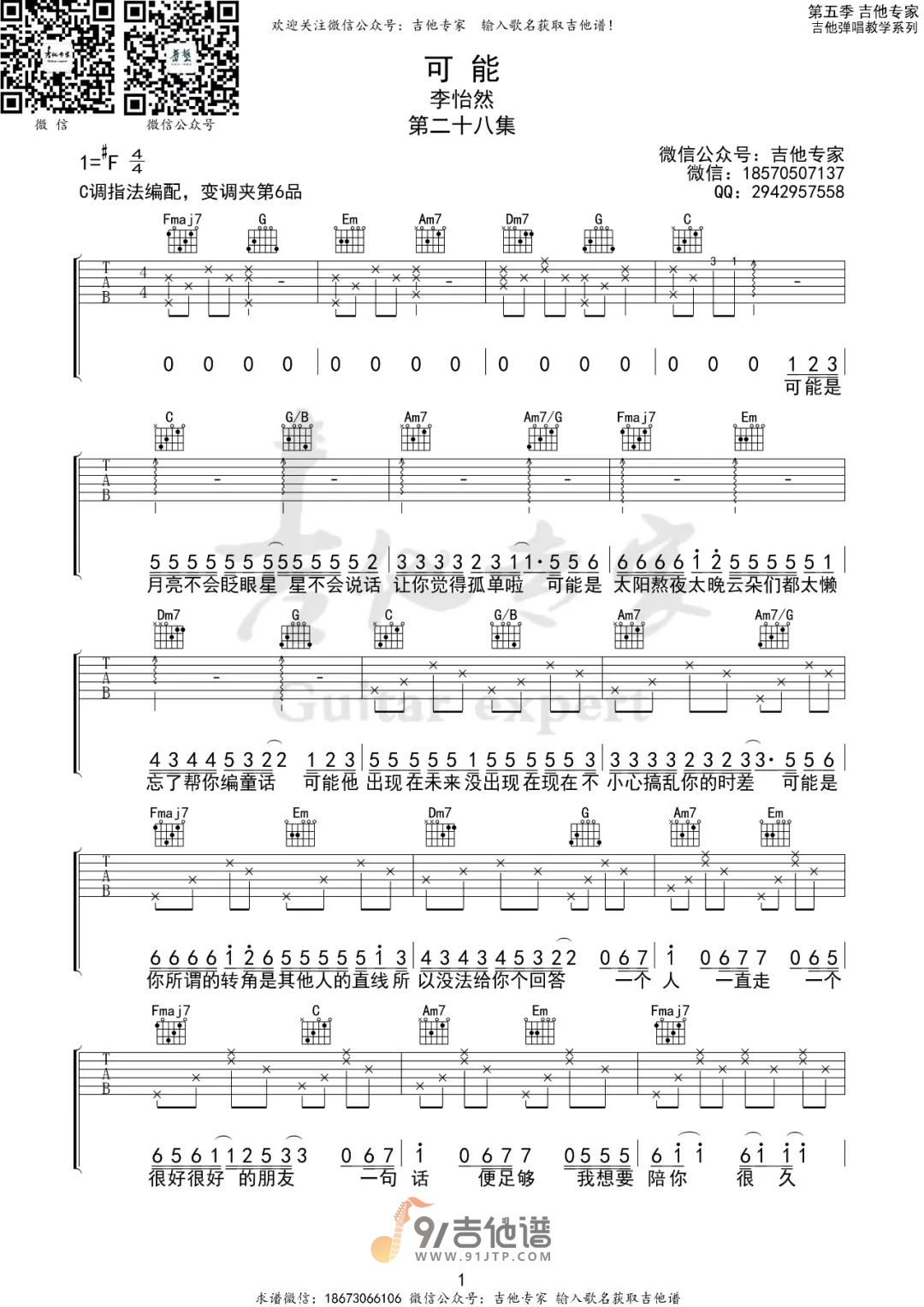 曲谱介绍: 曲谱简介:可能吉他谱,李怡然同学演唱的一首歌曲,4/4拍的节奏,这首歌曲的原调为#F调,这里曲谱采用了C调指法进行编配,演唱时夹变调夹6品可回到原调,也可根据个人实际嗓音情况选择。曲谱由吉他专家编配出品。这个让人着迷的声音吸引了无数人的关注,可能是你能用耳朵就可以感受到她带来的那一份童真,自然的会唤醒自己心中那一段尘封的校园时光。