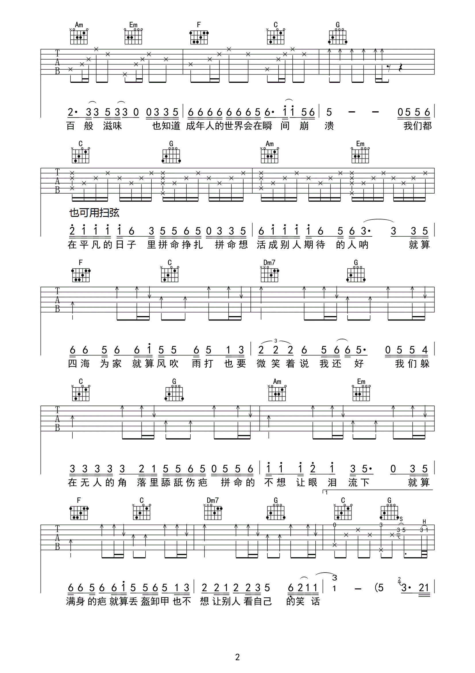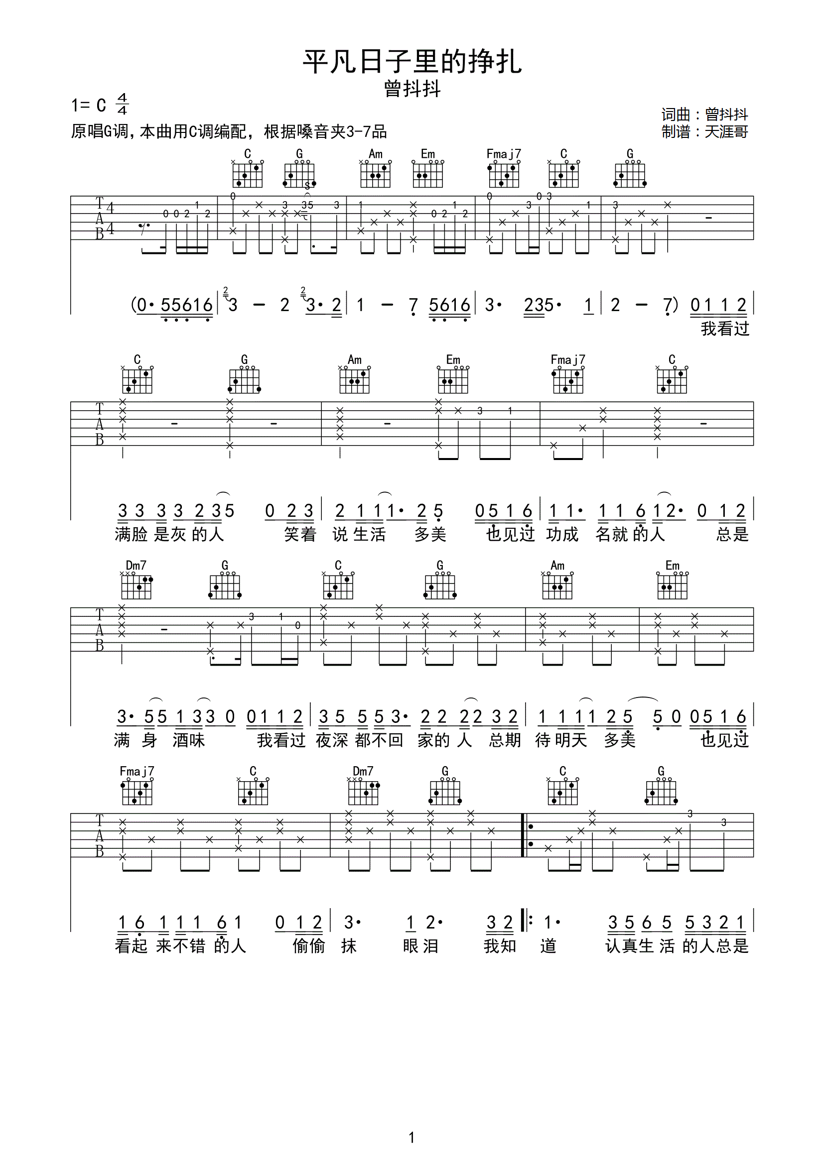 曲谱介绍: 曲谱简介:平凡日子里的挣扎吉他谱,曾抖抖演唱的一首歌曲,4/4拍的节奏,这首歌曲的原调为G调,这里曲谱采用了C调指法进行编配,演唱时夹变调夹5品可回到原调,也可根据个人实际嗓音情况选择。曲谱由天涯哥编配出品。这首歌曲无意中,给自己有种伤感的感觉,但是又很励志的那种。这首歌曲的韵律,歌词,歌调,好像特别适合在拼搏道路上的年轻人,还有那些正在拼命挣扎的创业人。