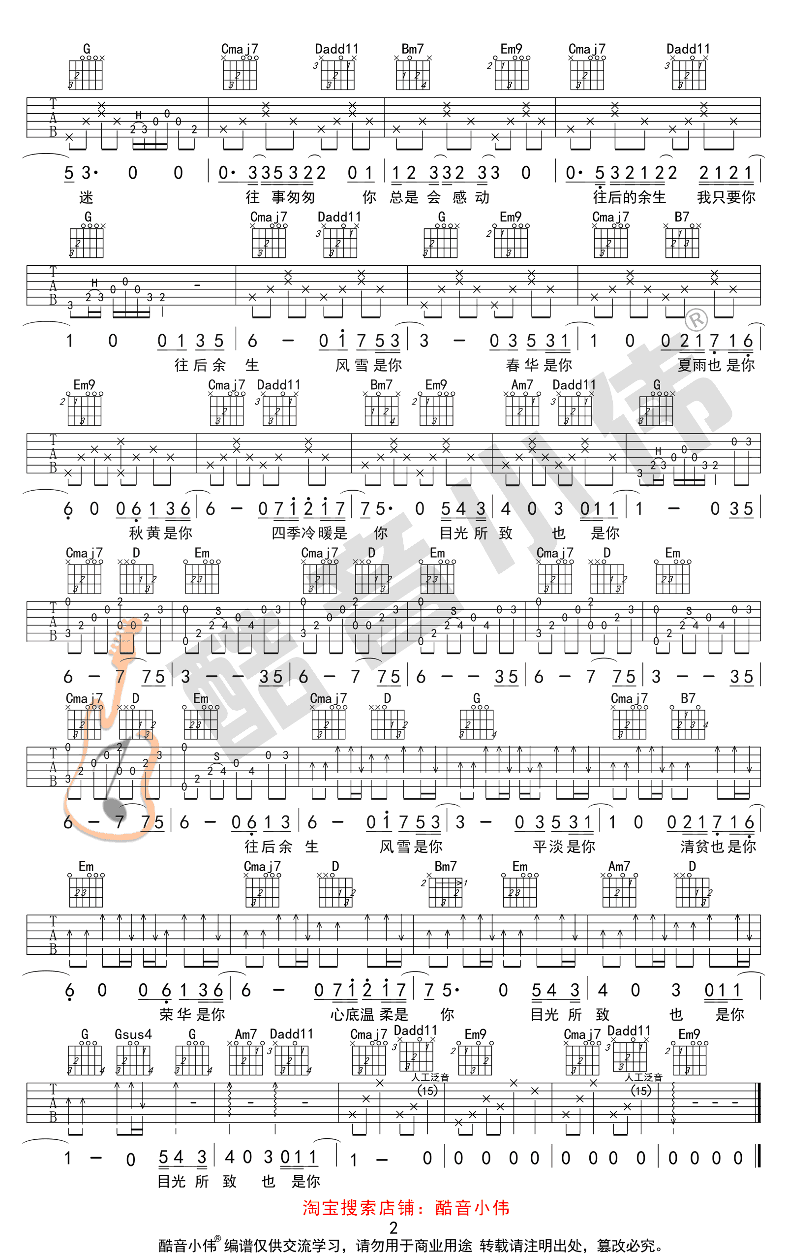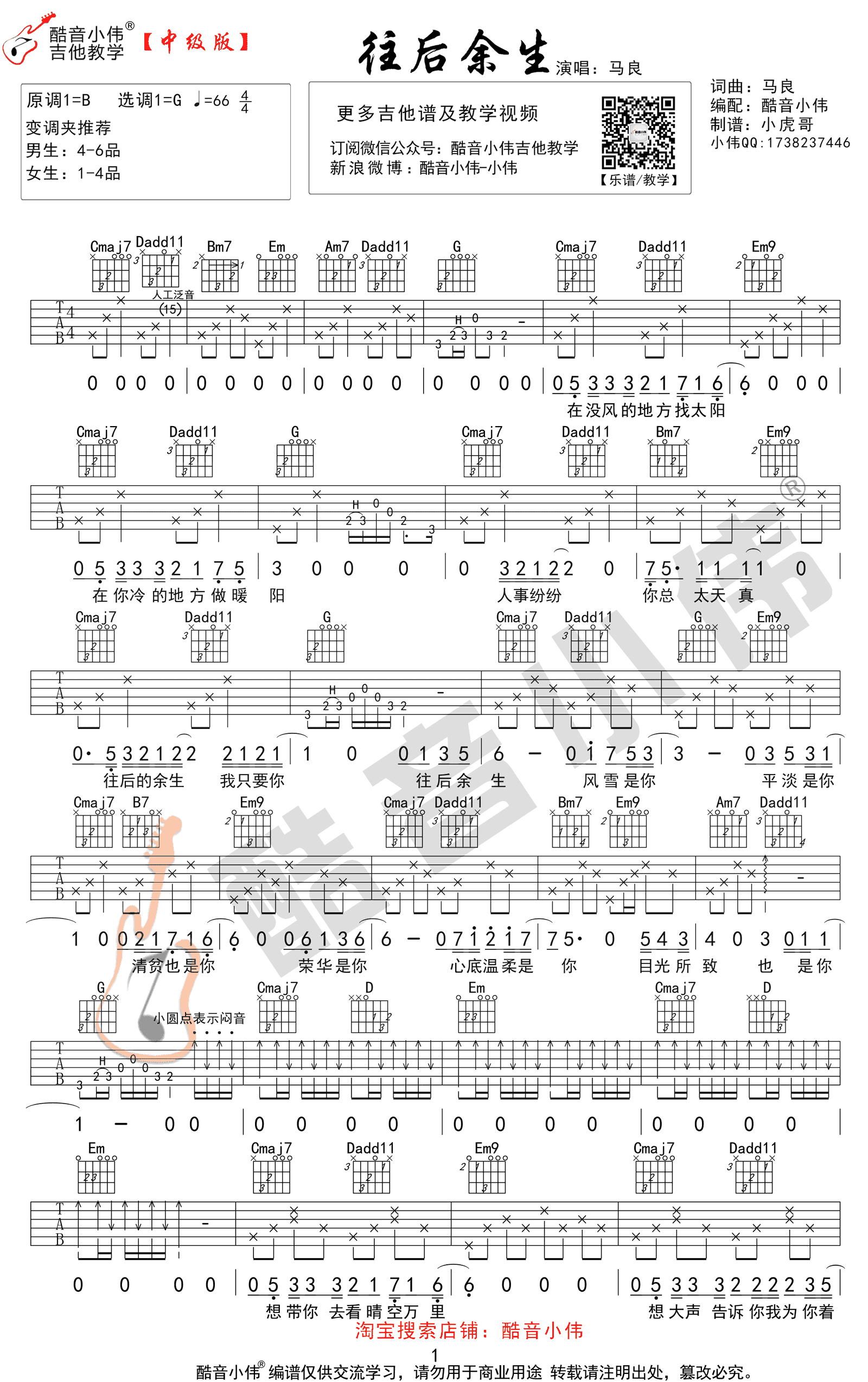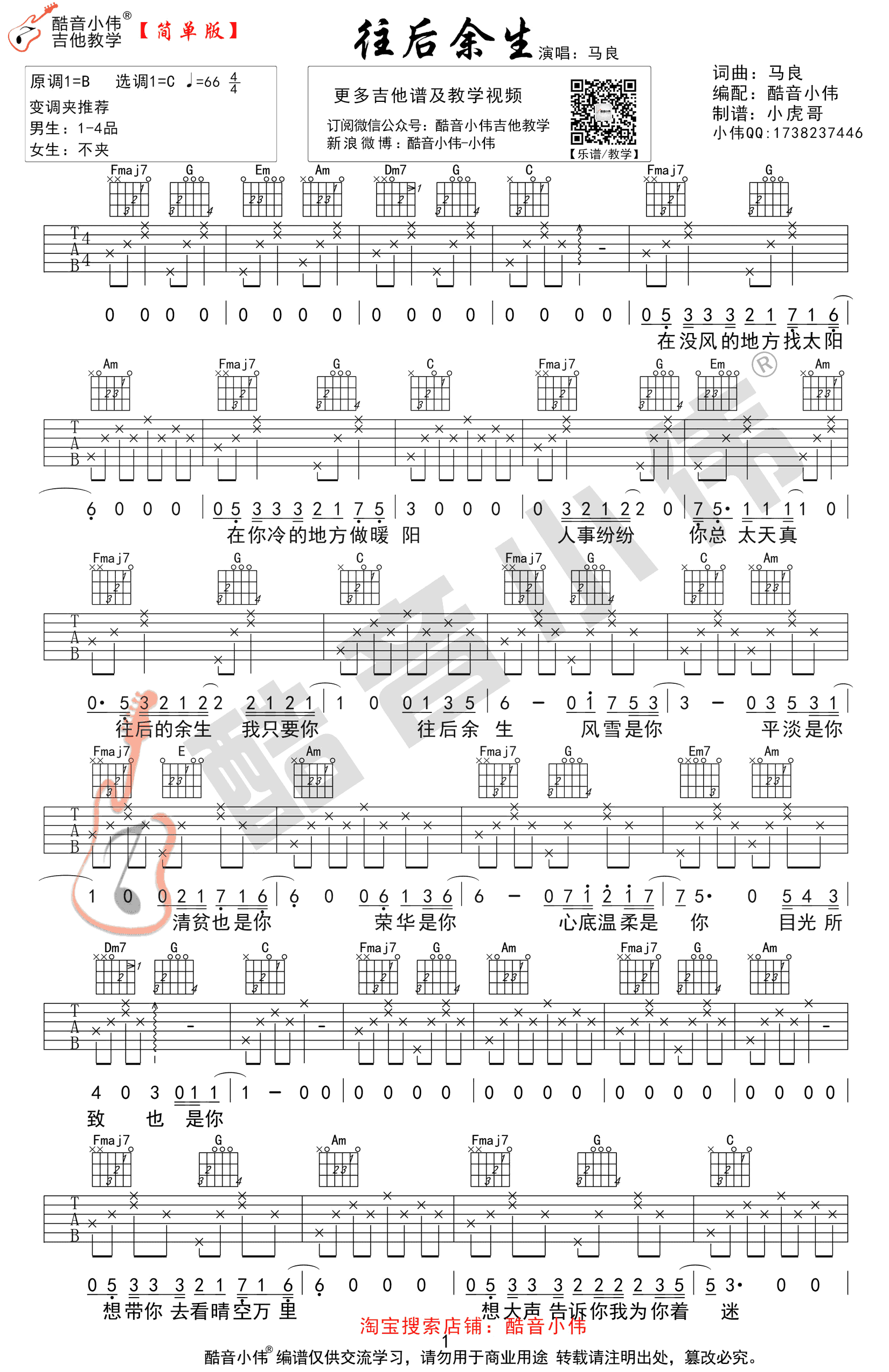 曲谱介绍: 《往后余生》吉他谱,王二浪翻唱版本,马良的一首网络平台抖音热门歌曲,本曲谱提供两个编配版本,适合不同阶段的吉他爱好者学习。往后余生六线谱,G调原版和C调简单版,感谢酷音小伟出品,91吉他谱网站上传分享。随谱附上配套吉他弹唱教学视频,琴友们跟随老师的弹唱演示和讲解示范进行练习。 G调指法中级版吉他谱