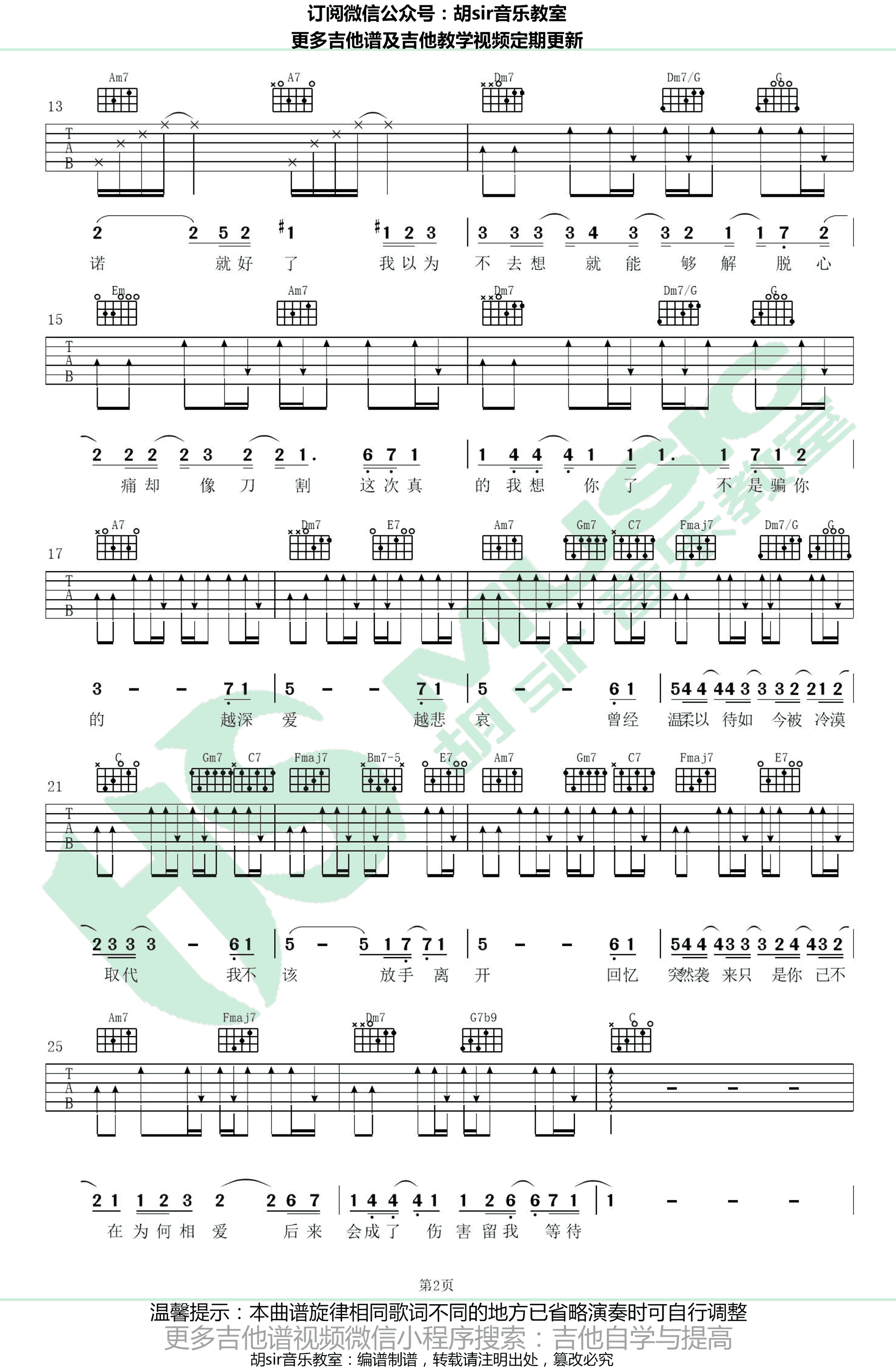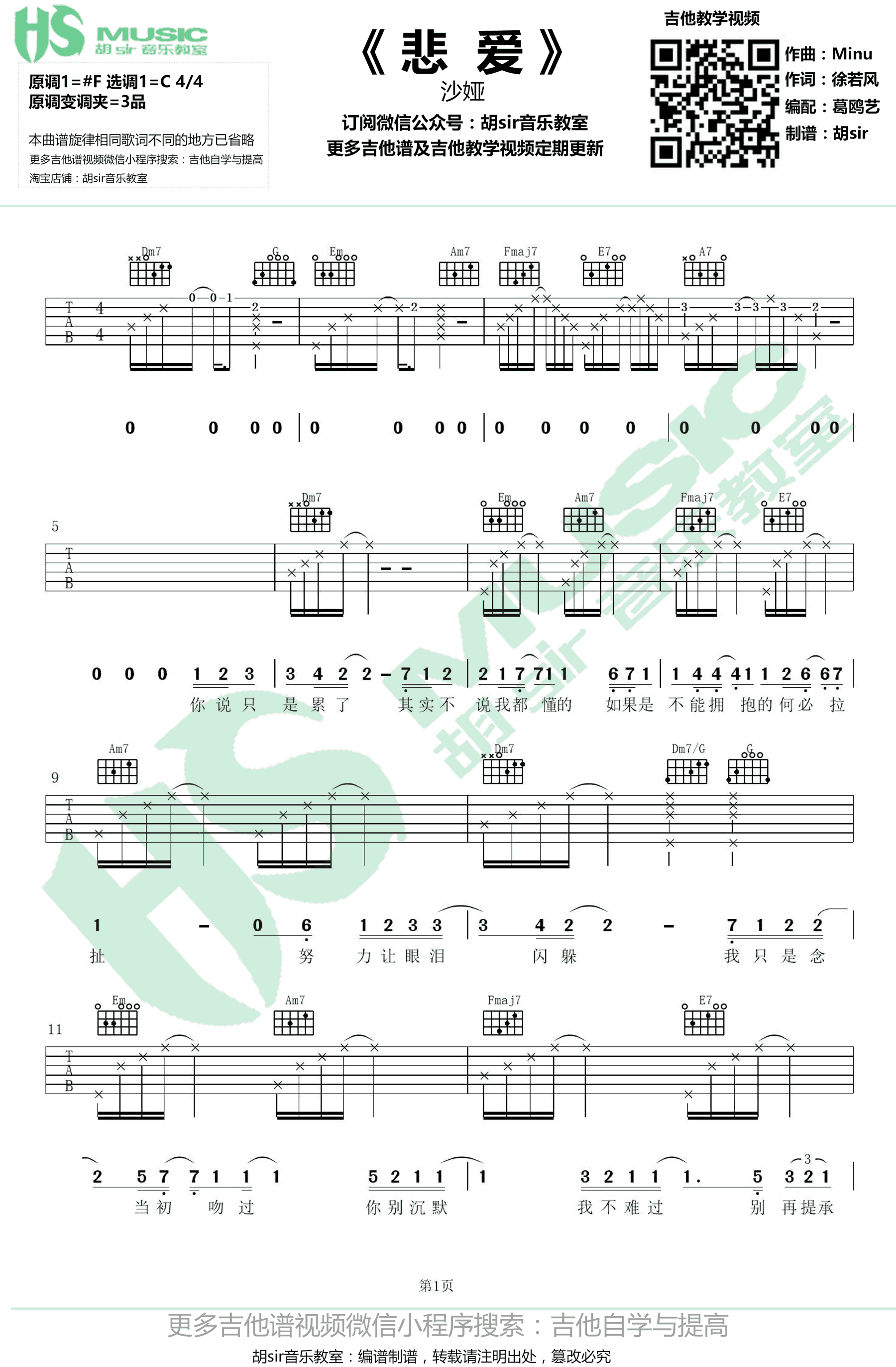 曲谱介绍: 沙娅《悲爱》吉他谱,原调#F,选调C,原调变调夹夹三品,悲爱六线谱,高清弹唱图片谱,感谢胡sir音乐教室编配,91吉他谱网站上传分享。欢迎琴友们扫码关注一起学习。 凭借出众的唱功和可爱的形象,百变歌手沙娅赢得了网上一大批粉丝。一首最新单曲《悲爱》,细腻的歌词,动听的旋律,配上沙娅vera富有质感的嗓音,让听众的感动。