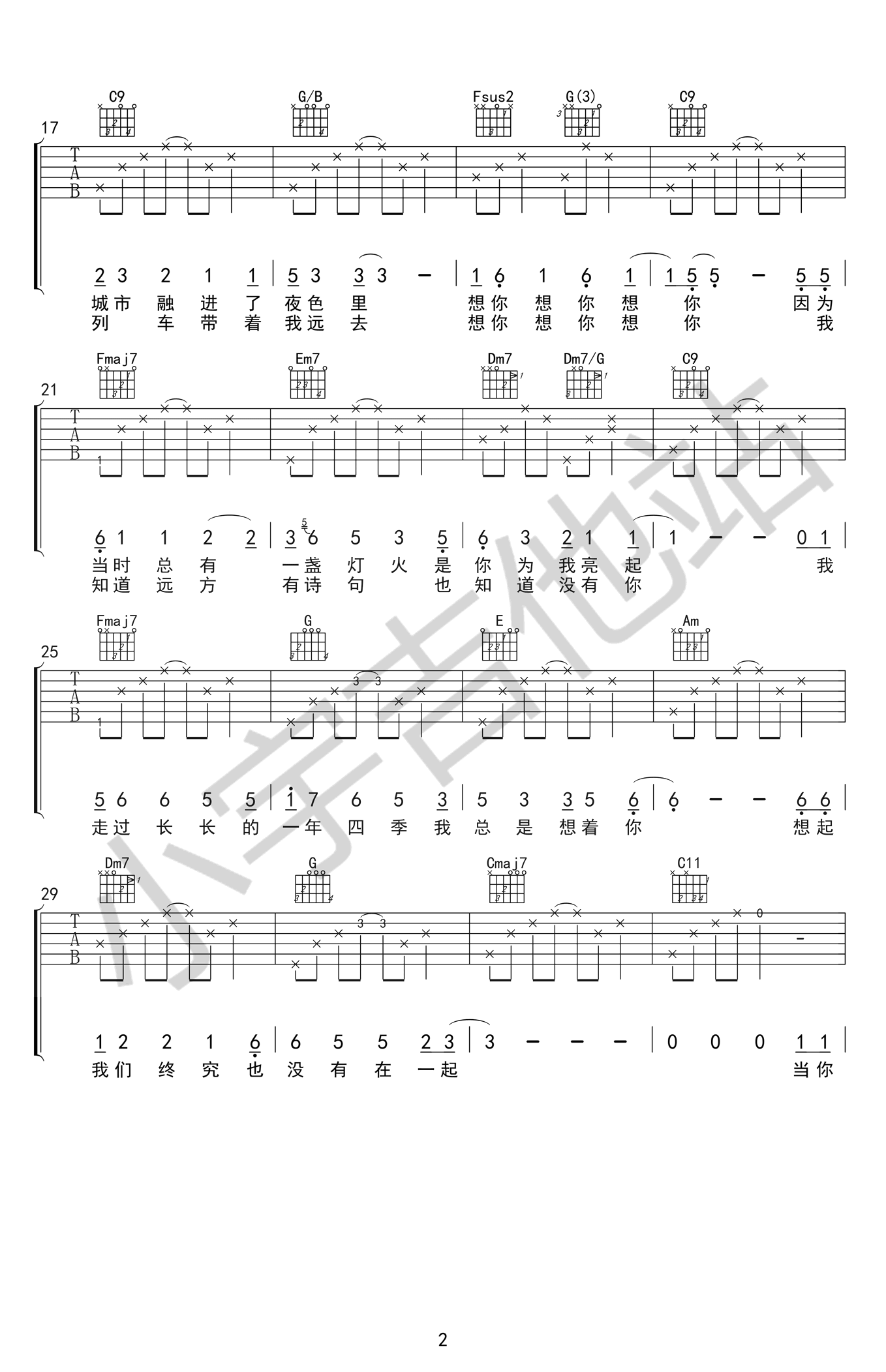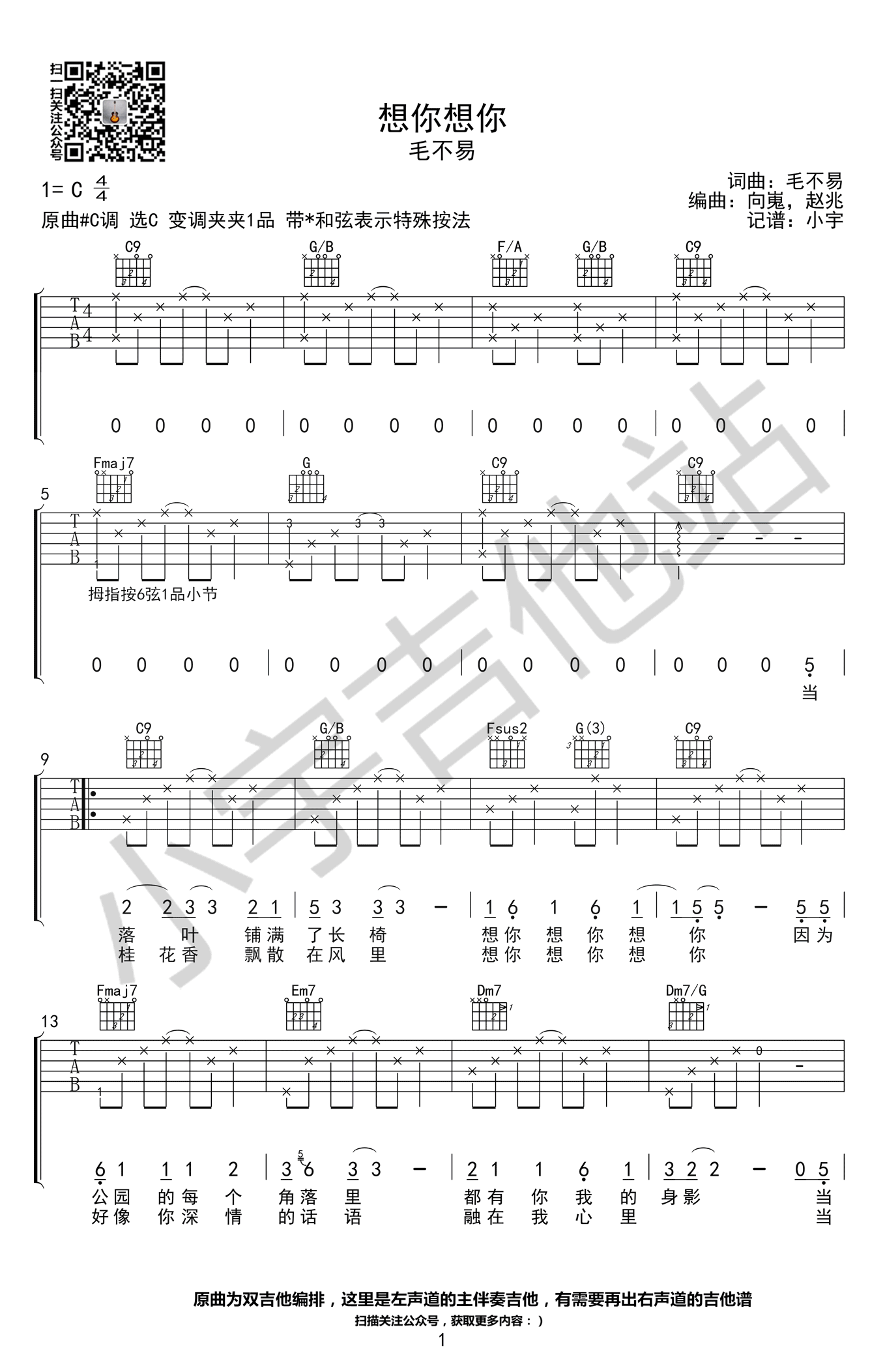 曲谱介绍: 毛不易《想你想你》吉他谱,原曲#C调,选用C调指法,变调夹夹一品,带*和弦表示特殊按法。想你想你吉他弹唱谱,六线谱高清版,小宇吉他站出品。