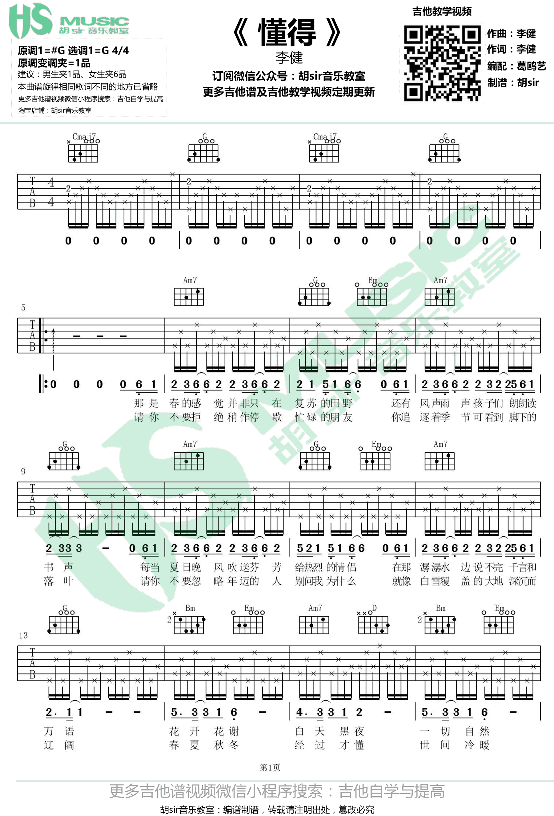 曲谱介绍: 李健《懂得》吉他谱,原调#G,选调G指法编配,变调夹夹一品,女生推荐夹六品。李健调一首新歌,懂得六线谱,高清弹唱图片谱,感谢胡Sir音乐教室出品,91吉他谱网站推荐上传。 俗世纷攘我们来去匆匆,不知不觉间丢失了最初的目标,忘记了自己要去向何方,李健一首《懂得》,唱出这片土地上每一个人经历的冷暖四季,用音乐的力量告诉我们,回望初心,才能拥抱美好。