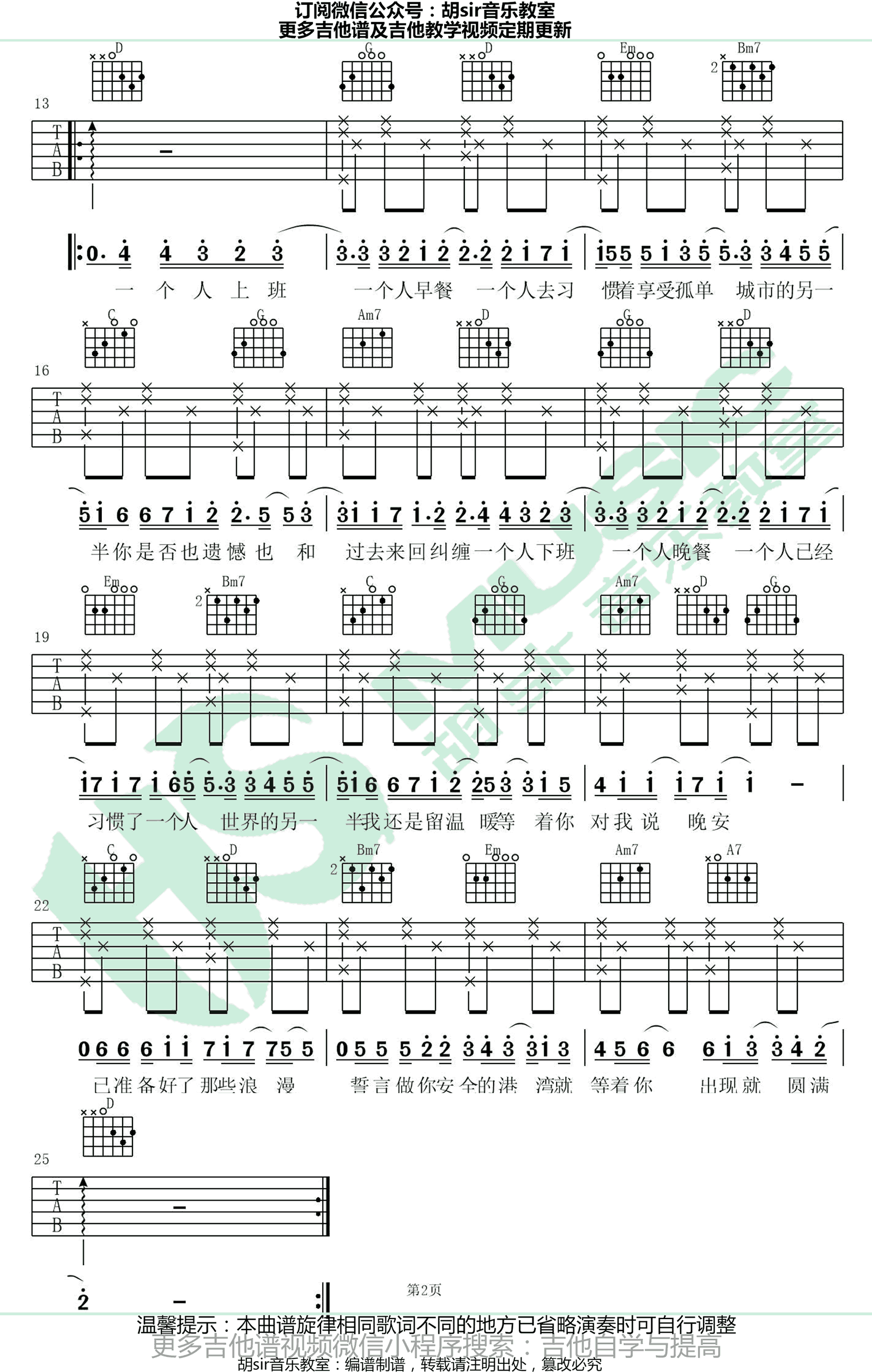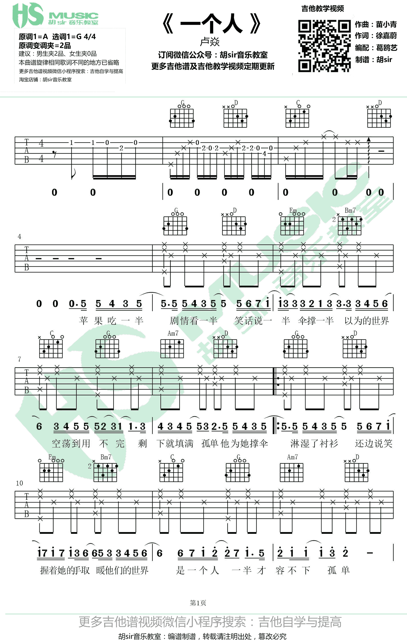 曲谱介绍: 卢焱《一个人》吉他谱,原调A,选用G调,建议男生变调夹夹第二品,女生不夹。一个人下班一个人晚餐,最近抖音中还蛮火的歌曲,这是卢焱的一首让人一听就喜欢上的新歌作品,一个人六线谱,高清弹唱图片谱,感谢胡Sir音乐教室编配出品,91吉他谱网站上传推荐。