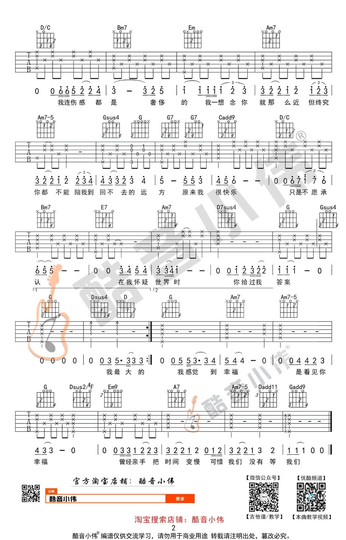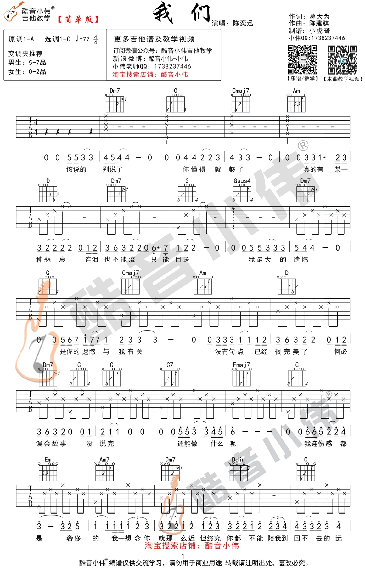 曲谱介绍: 陈奕迅《我们》吉他谱,刘若英导演的电影《后来的我们》主题曲,我们六线谱,高清图片谱,本曲谱提供两个版本,分别是G调中级版和C调简单版,感谢酷音小伟编配出品,吉他谱网站上传。随谱附上配套吉他教学视频,琴友们跟随老师的讲解示范进行弹唱学习 G调指法中级版吉他谱