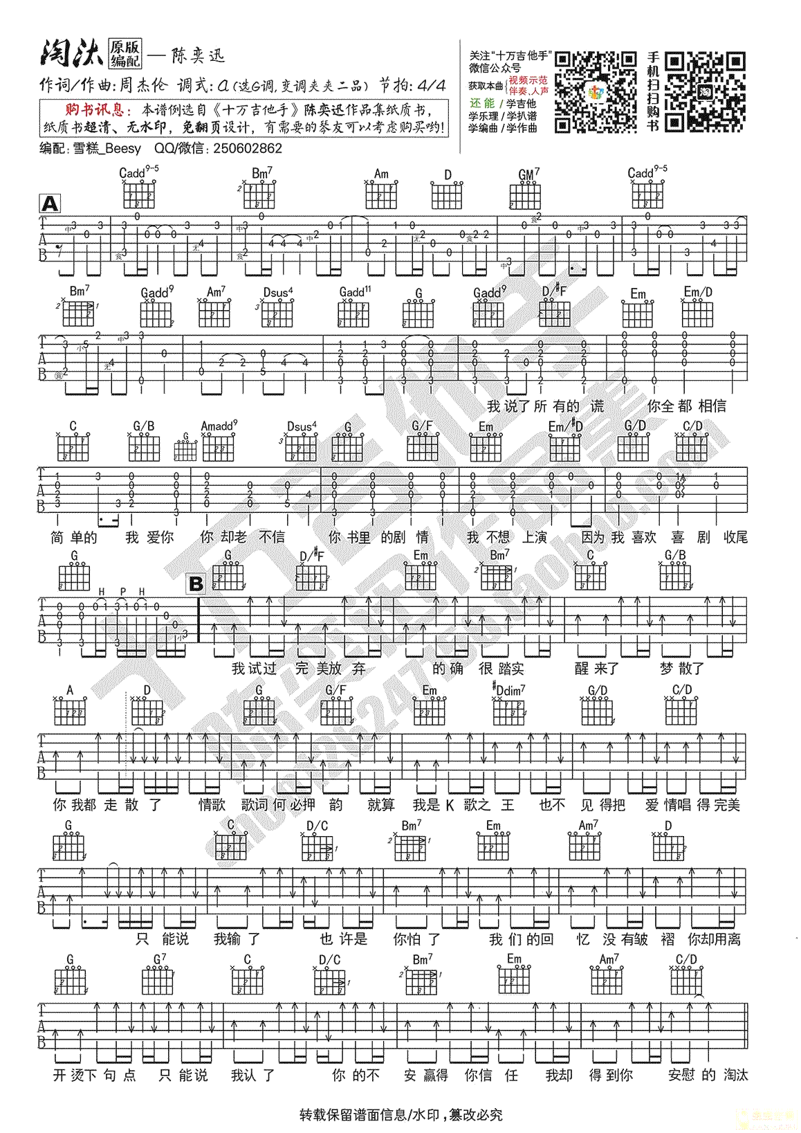 曲谱介绍: 陈奕迅《淘汰》吉他谱, 选用G调指法,变调夹夹二品,周杰伦为陈奕迅创作的一首经典情歌,我们的回忆没有皱褶,你却用离开烫下句点。十万吉他手出品。编配说明:这首歌曲编配一般,因为原曲都是一堆钢琴和弦,移植到吉他上无法全部还原,Solo可以练练,因为solo很简单! 吉他弹唱视频演示: