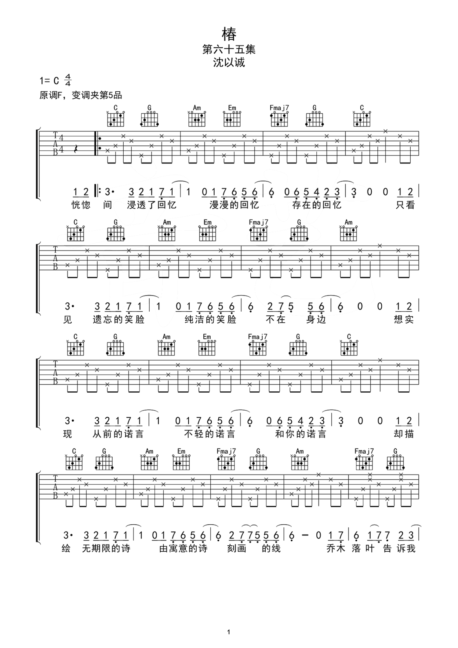 椿吉他谱 - 沈以诚 - C调吉他弹唱谱