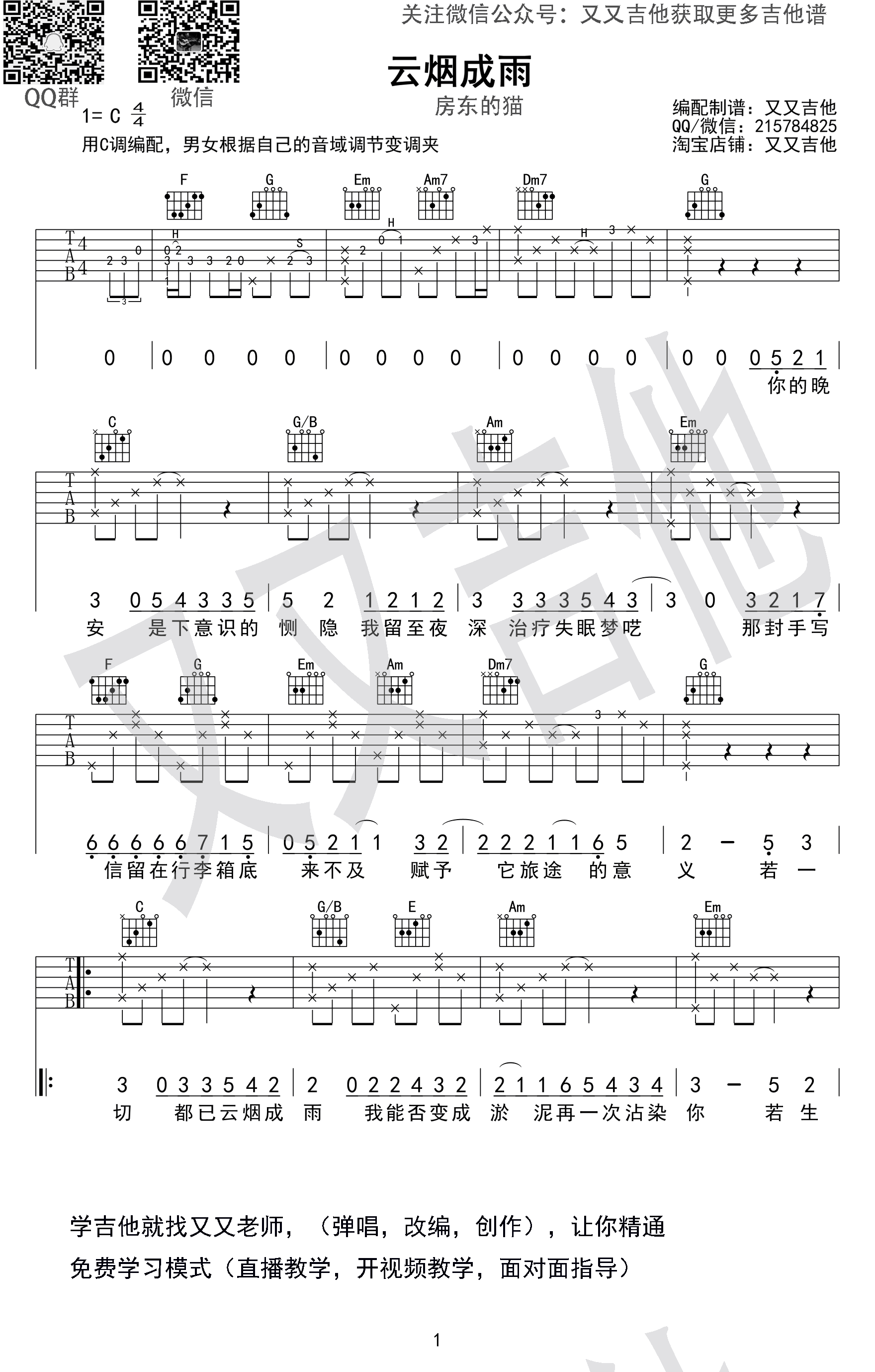 曲谱介绍: 《云烟成雨》吉他谱,选C调编配制作,男女根据自己音域适当夹变调夹,房东的猫演唱,一首让人原本思绪凌乱的心平复下来的民谣歌曲,云烟成雨六线谱,三张图片谱,又又吉他编配出品,91吉他谱上传。 主唱小黑干净的嗓音,赋予了这首歌一种特别的感觉,犹如一池飞雁游过天空般安静美好,亦有种失落惆怅不断延续。