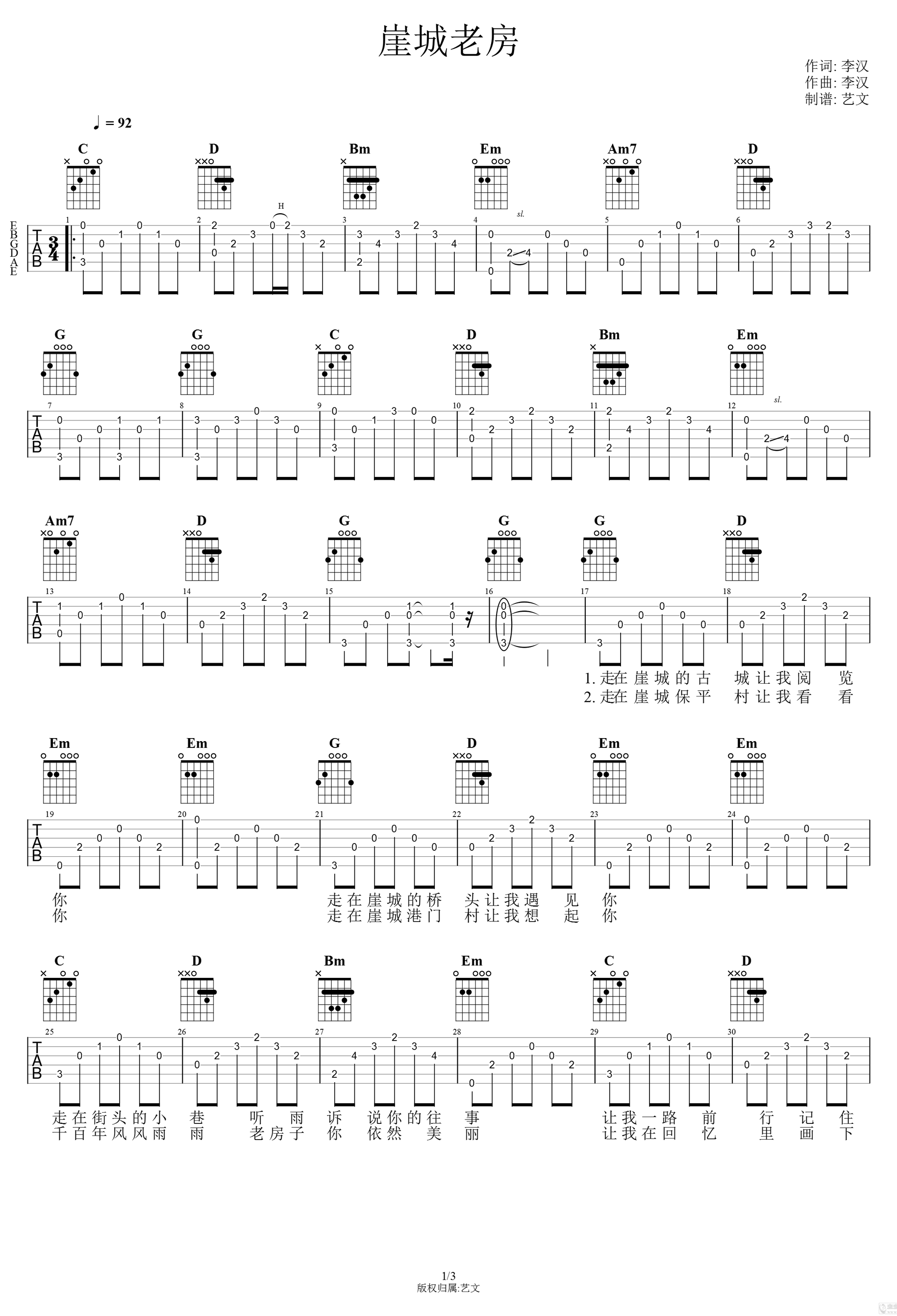 曲谱介绍: 崖城老房吉他谱,崖州小伙子李汉创作记录家乡的一首歌曲,一把吉他和充满磁性的嗓音,既纯粹又充满感情,《崖城老房》吉他弹唱谱,高清图片谱,感谢艺文编配,91吉他谱上传。 一曲民谣饱含着对家乡热忱的爱,悦耳动听的歌声把家乡厚重的历史诠释得淋漓尽致。静静地聆听,眼前仿佛出现了老房美景,耳畔仿佛响起不远处渔船的马达声。的确,在历史与现代的交融下,一首原汁原味的民俗歌曲才更能品出家乡的韵味,让我们一起陶醉在“崖州老房”的歌声里,漫步在美丽的崖州街道上!