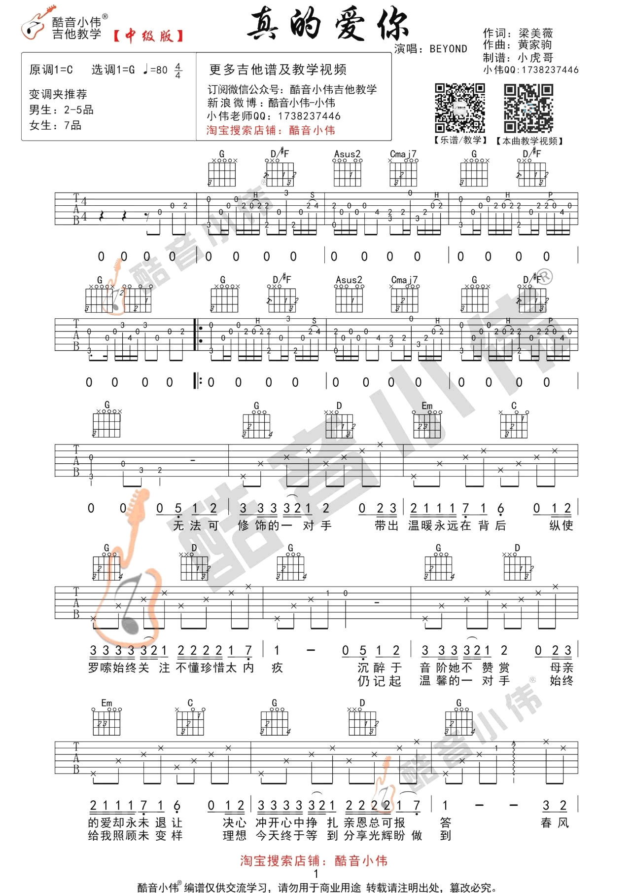 曲谱介绍: Beyond的一首经典代表作品,真的爱你吉他谱,曲谱提供两个版本,适合不同阶段水平的琴友们练习掌握。真的爱你六线谱,G调指法编配中级版,配套吉他弹唱教学视频,酷音小伟编配出品,91吉他谱网站上传推荐。 G调指法中级版吉他谱