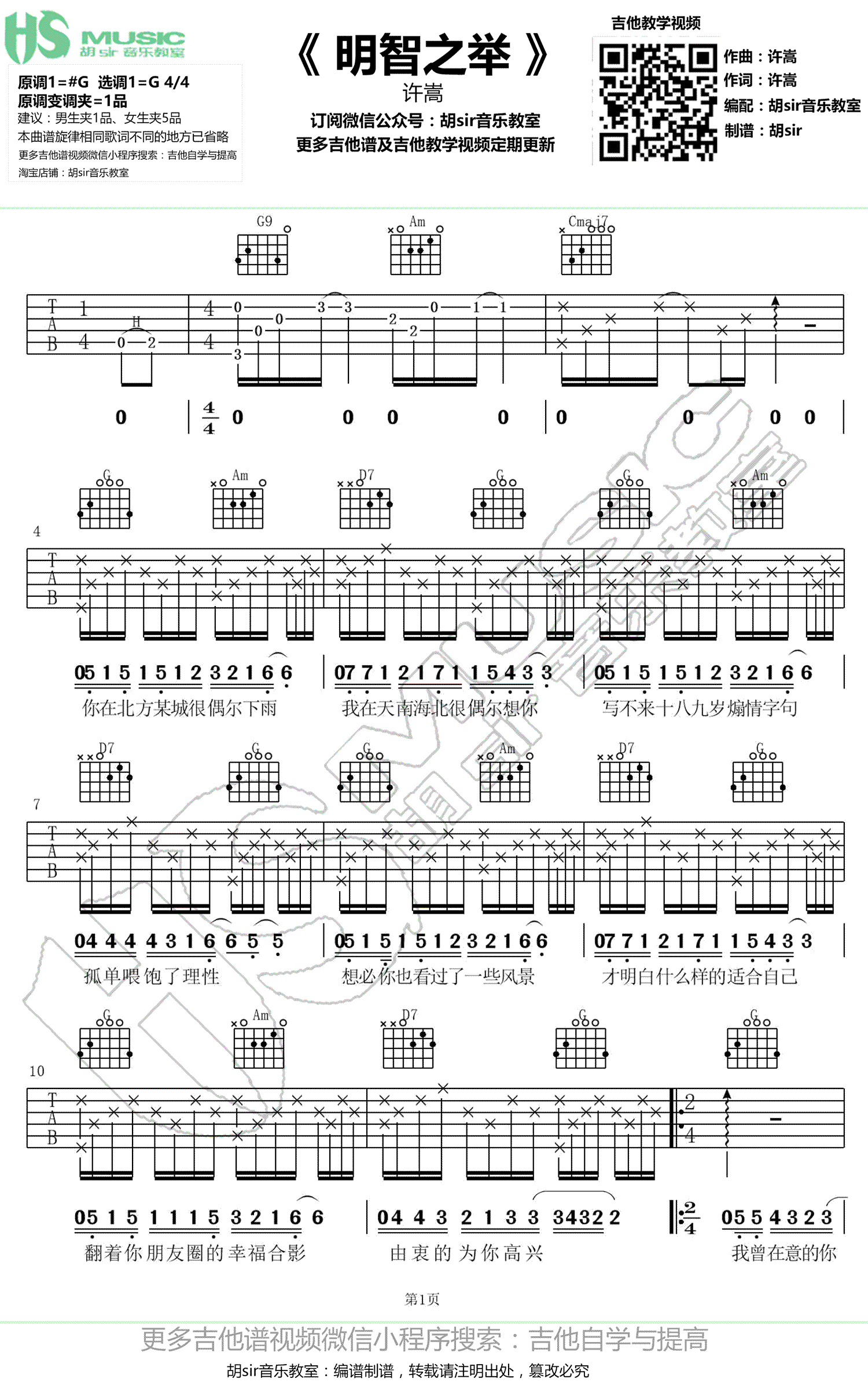 曲谱介绍: 明智之举吉他谱,许嵩演唱的一首新歌,明智之举六线谱,高清弹唱图片谱,胡sir原调#G,选调G,原调变调夹夹第一品,建议男生夹一品,女生夹五品。感谢胡SIR音乐教室出品,91吉他谱网站上传分享。 你在北方某城很偶尔下雨,我在天南海北很偶尔想你。浓郁的复古味道,以节奏布鲁斯曲风来呈现独有的情绪特质。得之坦然、失之淡然、顺其自然 ,明智之举。