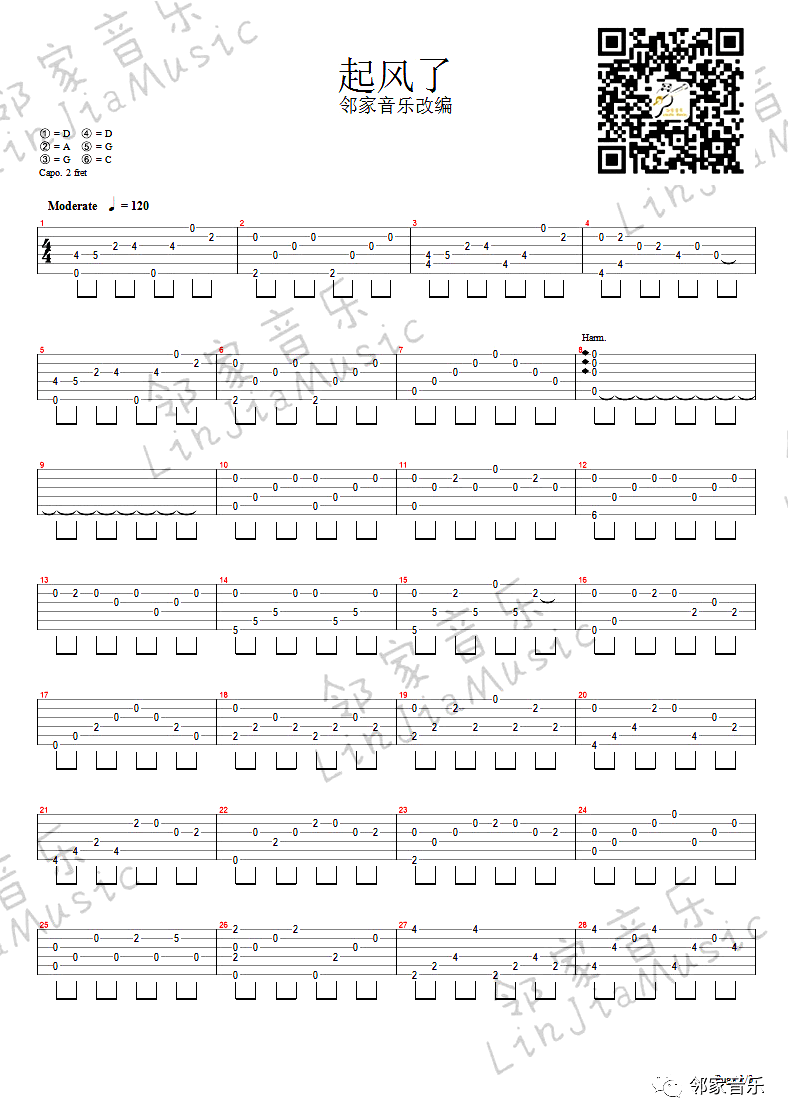 曲谱介绍: 起风了吉他谱指弹版,网络热门歌曲,买辣椒也用券演唱,起风了吉他独奏谱,唯美指弹版。曲谱非标准调弦演奏,各弦音高参见图片谱标注,变调夹第二品。感谢@邻家音乐编配出品,91吉他谱网站整理上传。随谱附上配套吉他指弹视频,琴友们参照喵君老师的演示练习,喜欢的琴友们别忘记扫码关注多多支持。