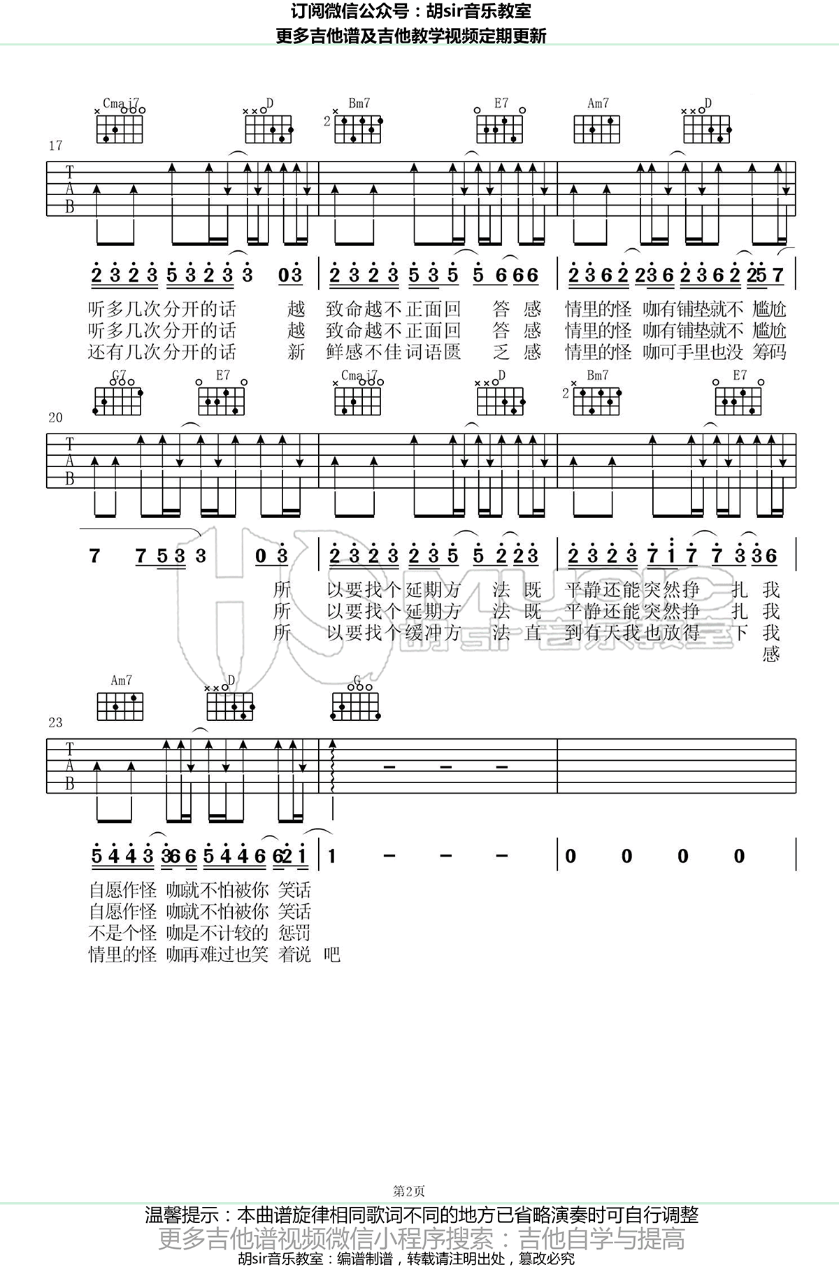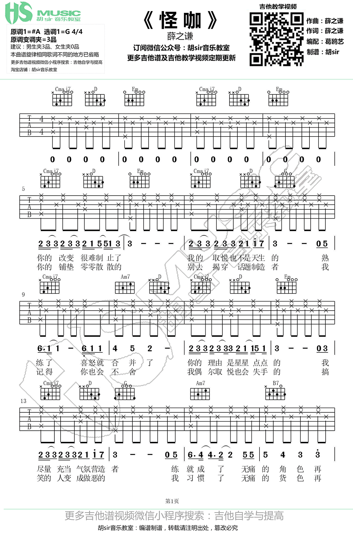 曲谱介绍: 薛之谦《怪咖》吉他谱,原调#A,选调G,原调变调夹夹第三品,女生不用夹,怪咖六线谱,胡Sir音乐教室出品,91吉他谱网站推荐上传。 薛之谦在《无限歌谣季》带来的一首原创新歌,感情里的怪咖,再难过也笑着说吧。《怪咖》浅唱轻吟,将爱情里的委曲求全温柔铺垫,演绎了“小丑”微笑面具下隐忍纠结的心酸爱情。