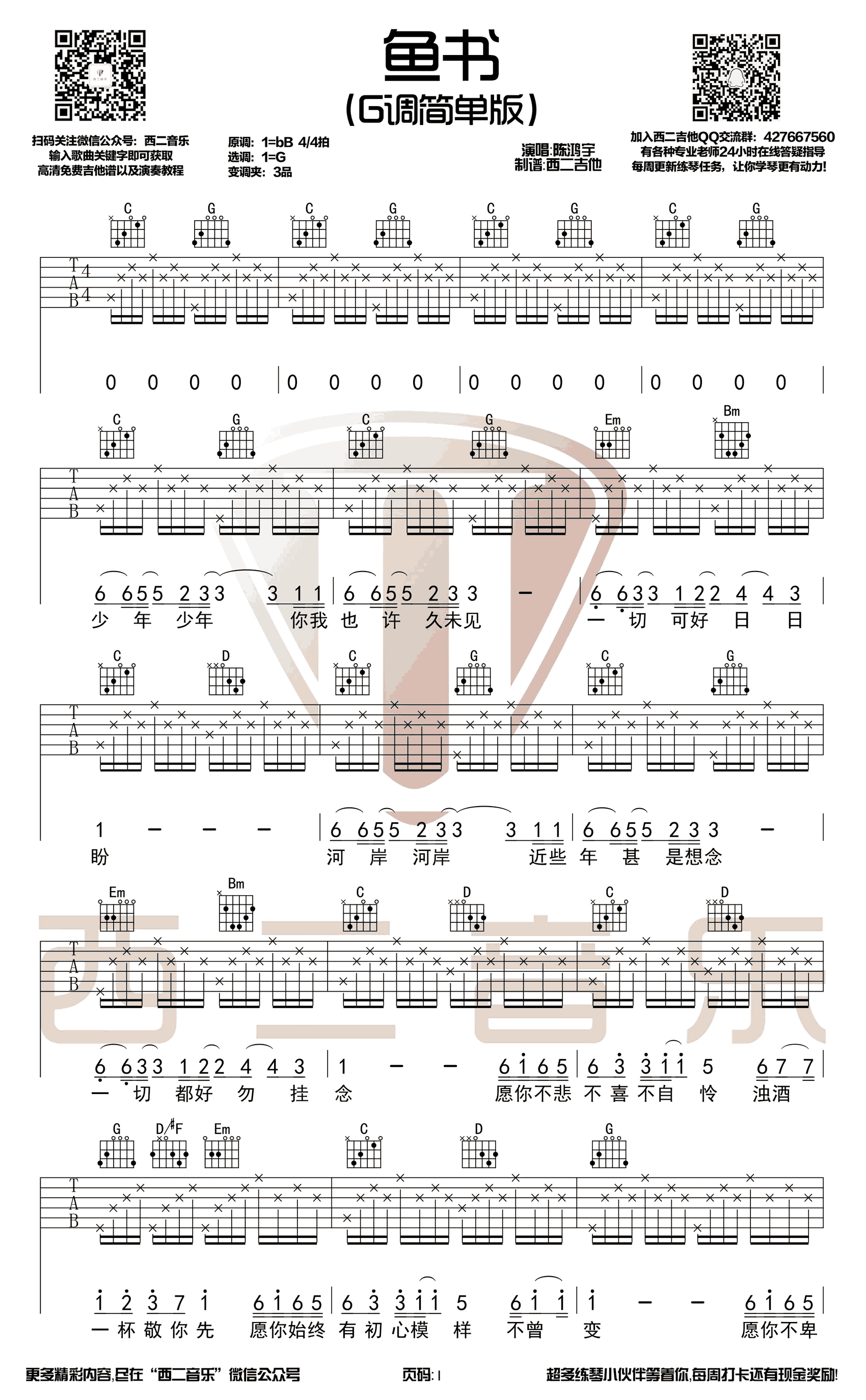 曲谱介绍: 《鱼书》吉他谱,陈鸿宇和曹秦演唱的一首民谣歌曲,原调bB,选调G,变调夹夹三品。鱼书吉他弹唱谱,六线谱高清图片,西二吉他编配出品,91吉他谱网站上传。 这首歌像是现在的自己写给过往自己的一封信,有对过往的怀念、对未来的寄语、有经历时过境迁的哀叹,但这一切更像是对自己轻声的劝慰,愿不忘初心,怀着赤子之心行走在这万物间。