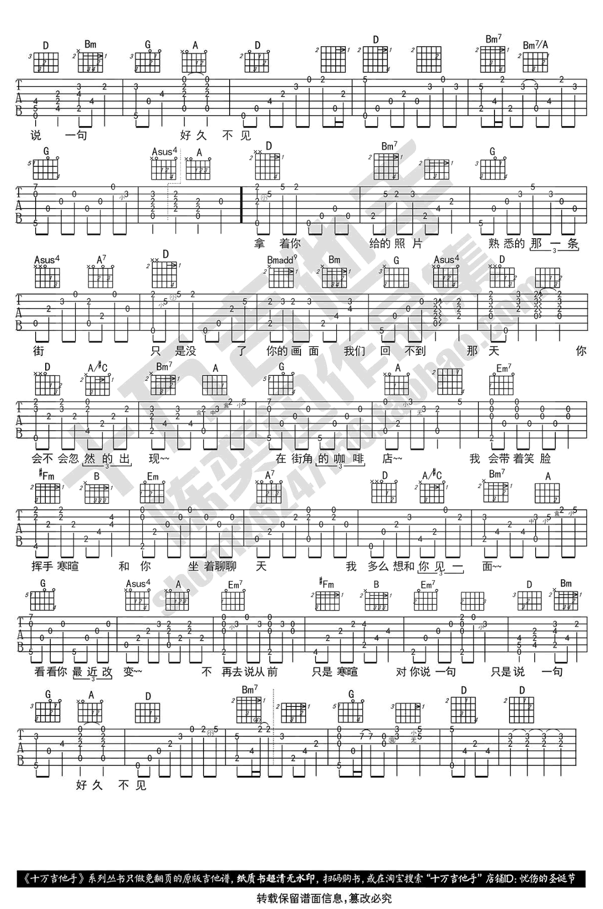 曲谱介绍: 好久不见吉他谱,陈奕迅演唱经典歌曲,D调指法编配,一首久别重逢的歌,诉说一个期望和旧情人重逢的伤感故事。好久不见吉他六线谱,两张图片谱,感谢十万吉他手出品,弹奏说明:把编曲中原钢琴的旋律移植到吉他上弹奏,这首歌曲的吉他改编还是蛮成功的,本曲需要第⑥弦降全音调弦。随谱附上配套弹唱视频,琴友们参照雪糕老师的示范练习。 好久不见吉他弹唱演示: